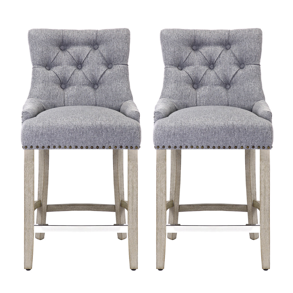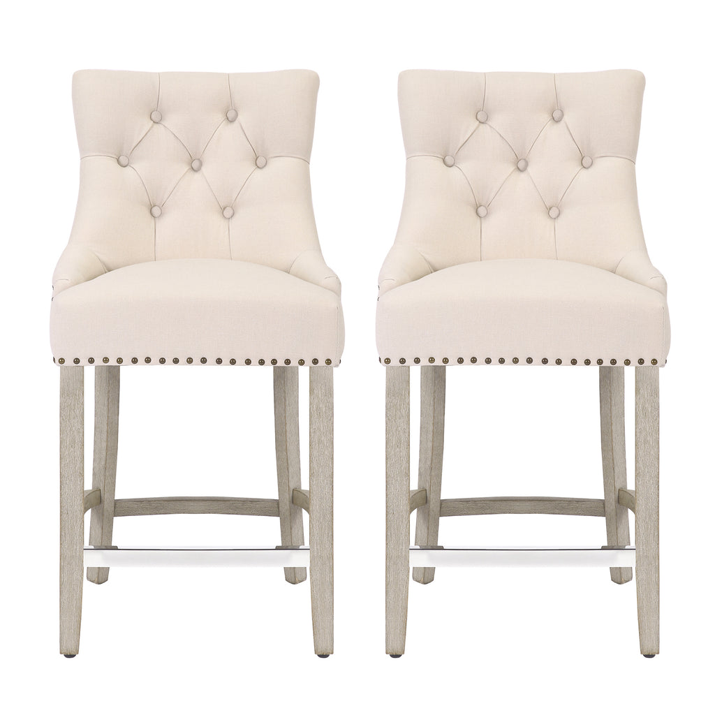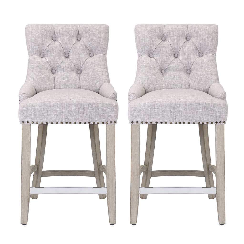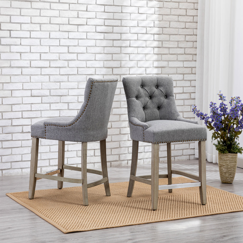 Create a relaxing and luxurious space with this beautifully crafted 24-inch upholstered fabric counter stool 2-piece set. Enjoy a comfortable seat thanks to the sinuous spring support, soft polyester blend upholstery, and the full back wrapped in a linen-style fabric for a comfortable seat. The stools' tufted buttons and stunning bronze nail head trim complement the antique gray legs and optional metal footrest cover to create a charming and sleek modern design that will transform your dining room or kitchen into a serene space.