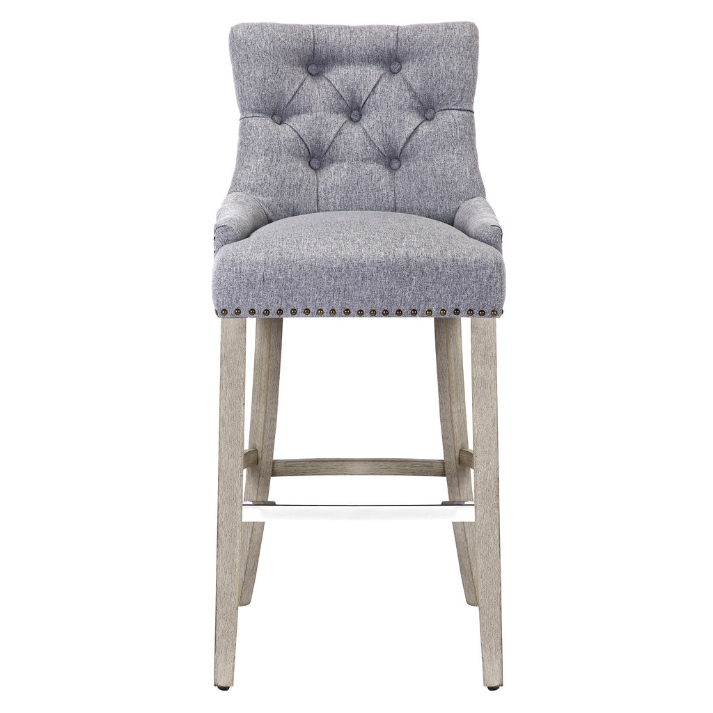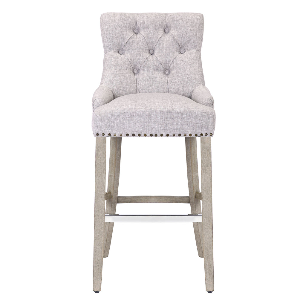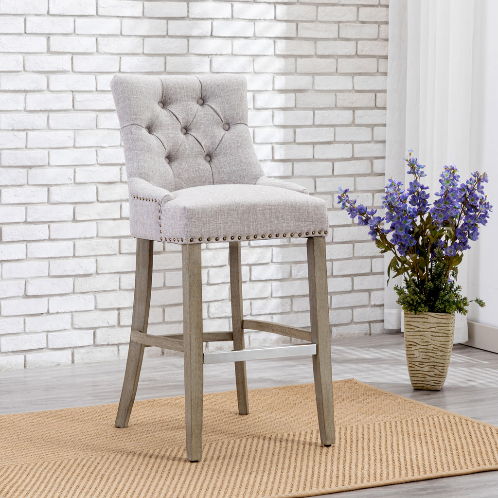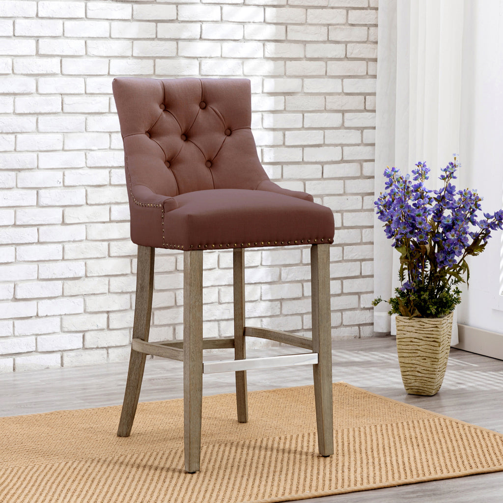Lined with artistic bronze nail heads, this 29" armless button-tufted stool is designed for premium dining comfort. A classic wingback design is upholstered in a lovely linen fabric that has a diamond stitched pattern with tufted buttons and a rustic bronze nail head trim that accents the chair. Adjust the feet to the perfect level with the adjustable feet leveler and prevent any scratches to the floor with the plastic foot pad protectors.
