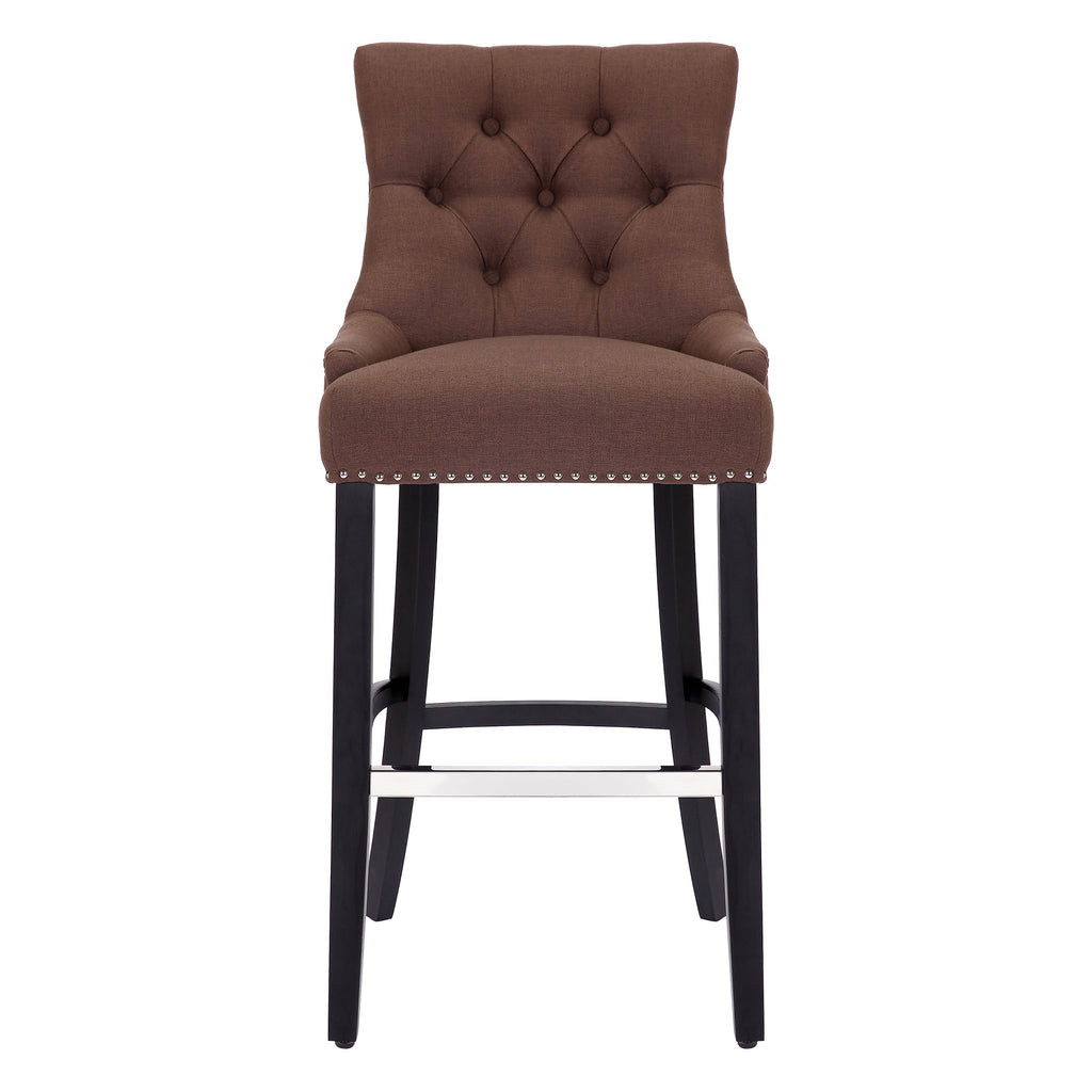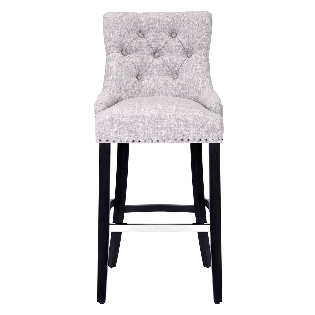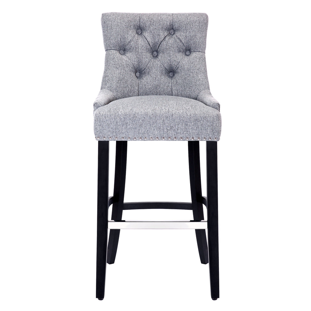 Create a relaxing and comfortable environment with this beautifully crafted 29" upholstered fabric bar stool. Enjoy a comfortable seat thanks to the sinuous spring support, soft polyester blend upholstery, and the full back wrapped in a linen style fabric for a comfortable seat. The tufted buttons and gorgeous silver nail head trim on the stools look great with the sleek black legs and optional metal footrest cover to create a charming and sleek modern design that will transform your dining room or kitchen into a serene space.