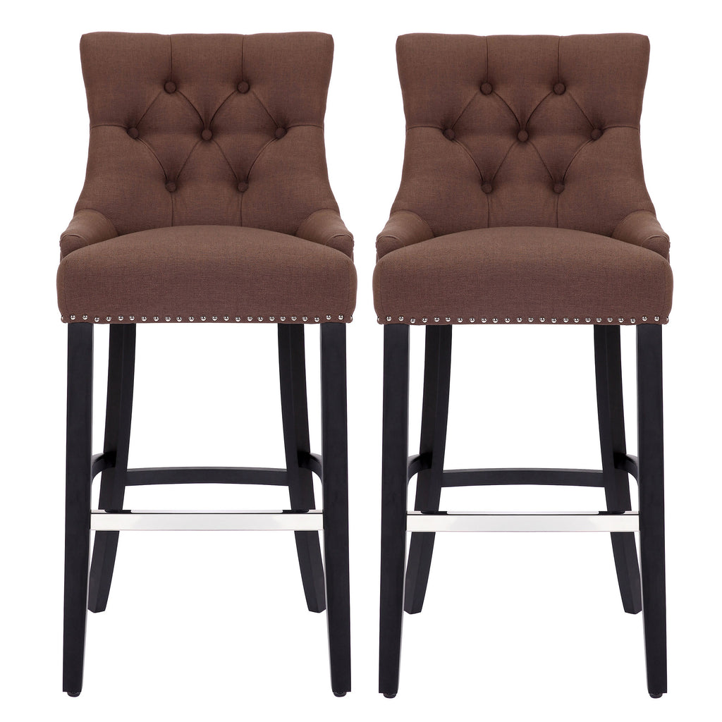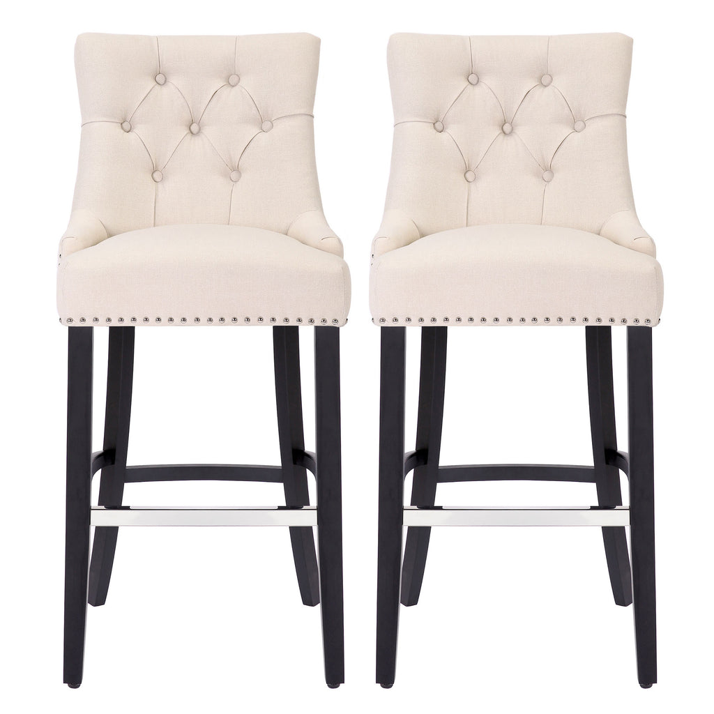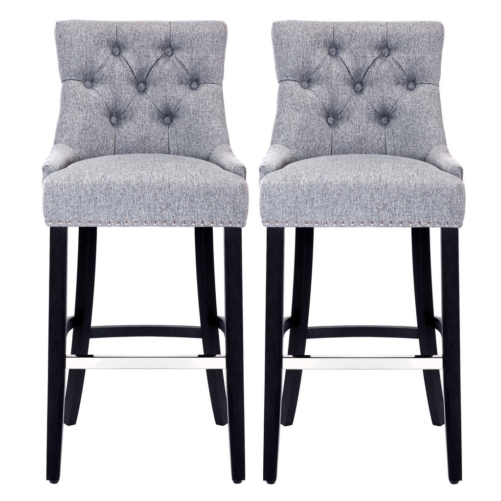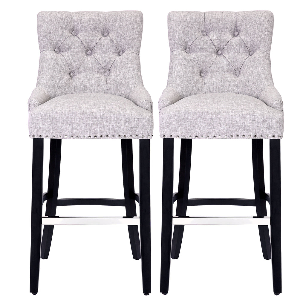 Create a relaxing and luxurious space with this beautifully crafted 29-inch upholstered fabric bar stool 2-piece set. Enjoy a comfortable seat thanks to the sinuous spring support, soft polyester blend upholstery, and the full back wrapped in a linen-style fabric for a comfortable seat. The stools' tufted buttons and stunning silver nail head trim complement the sleek black legs and optional metal footrest cover to create a charming and sleek modern design that will transform your dining room or kitchen into a serene space.