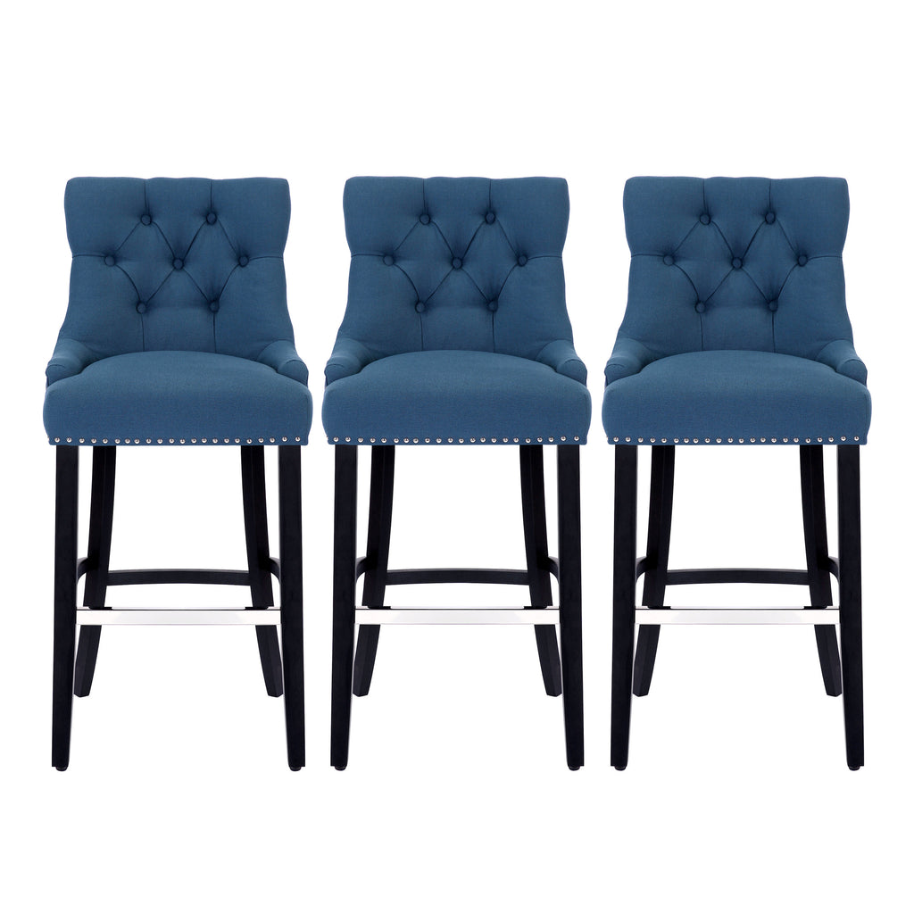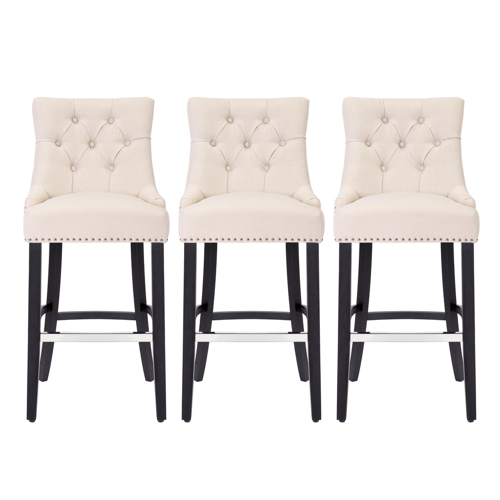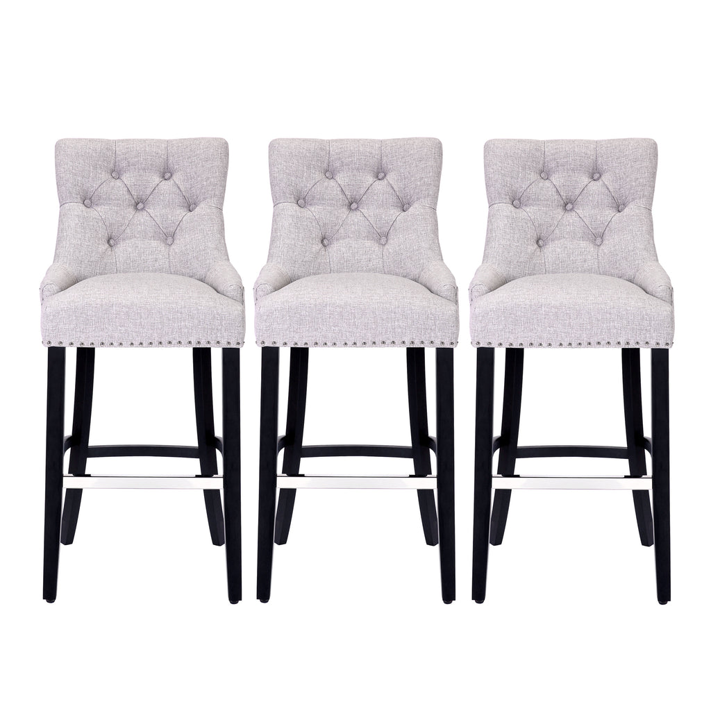 Make your kitchen island stand out and turn into a place of elegance with this beautiful set of three 29-inch fabric upholstered bar stools. Featuring dense foam padding, sinuous spring support, and soft polyester/linen fabric upholstery. The diamond button-tufted pattern, polished silver nailhead trim, and sleek curves add a vintage aesthetic. The black solid rubberwood legs complement various types of interior decor styles, and the front footrest can be protected with an optional silver metal footrest cover that protects and adds a modern style to the footrest.
