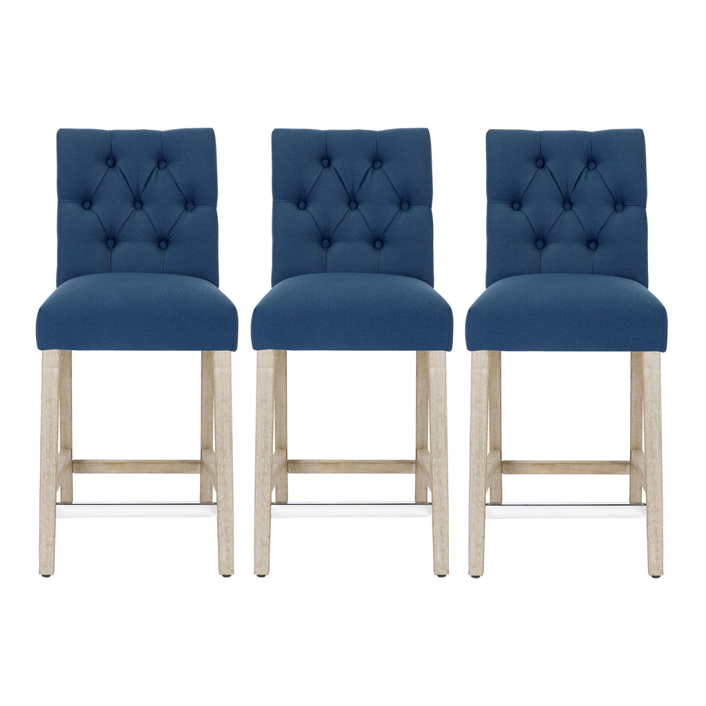The perfect choice for your kitchen island, these stools add classic style with a diamond button-tufted back and solid wood legs. With dense foam padding, sinuous spring support, and soft fabric upholstery, they are the perfect counter stools for relaxing in comfort. The back and seat are wrapped in soft poly/linen fabric, while the optional silver metal footrest adds a contemporary touch and protects against scuffs and scratches.