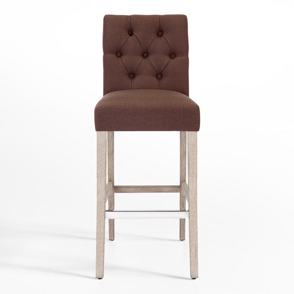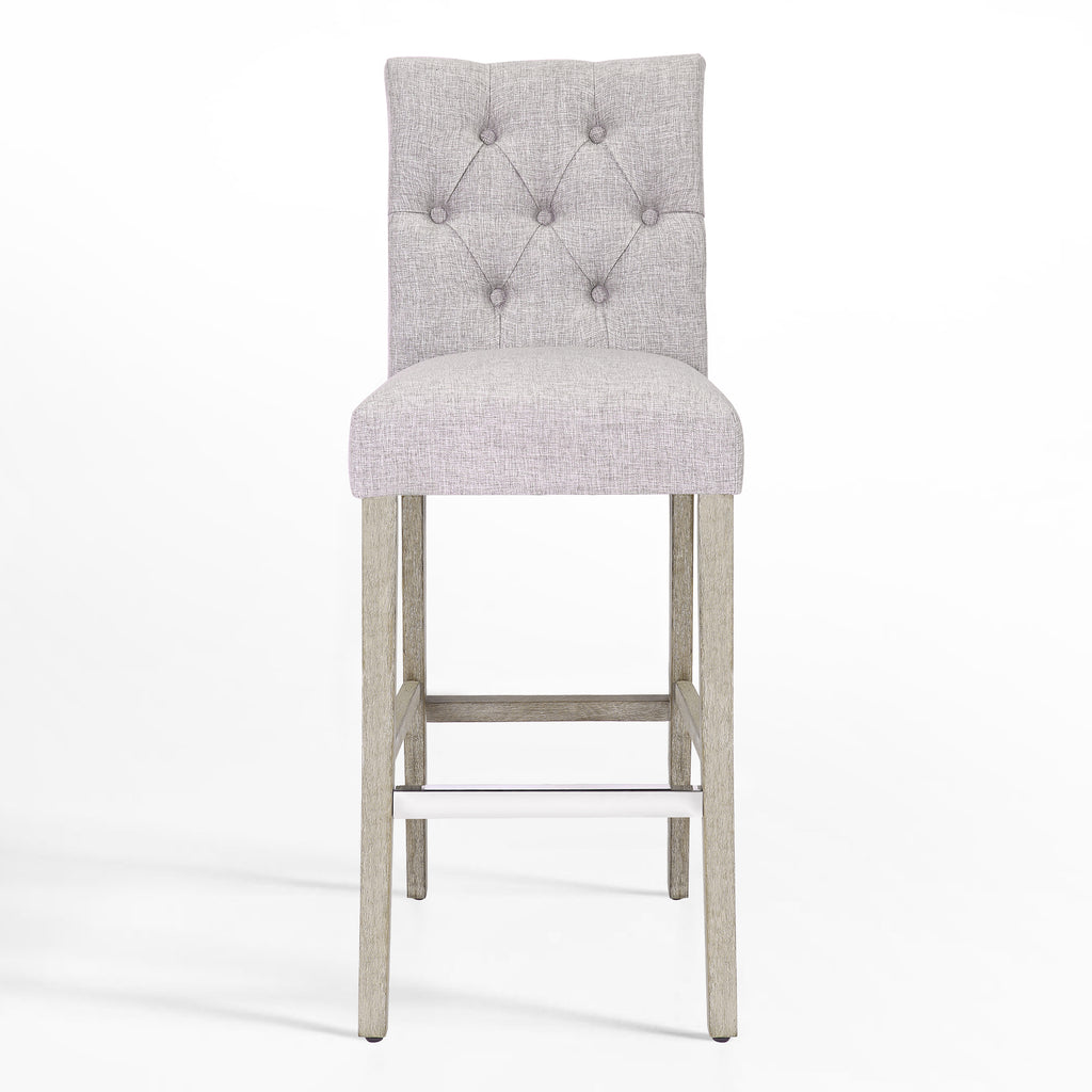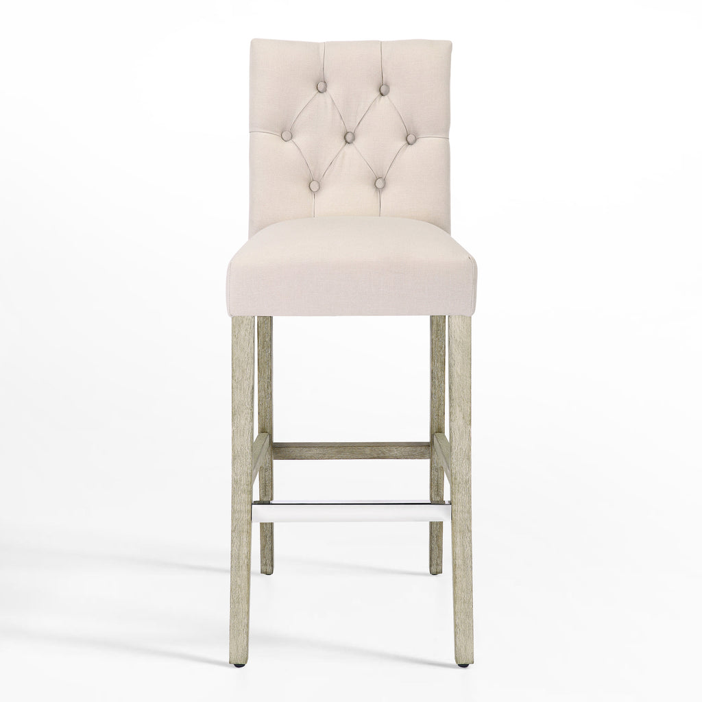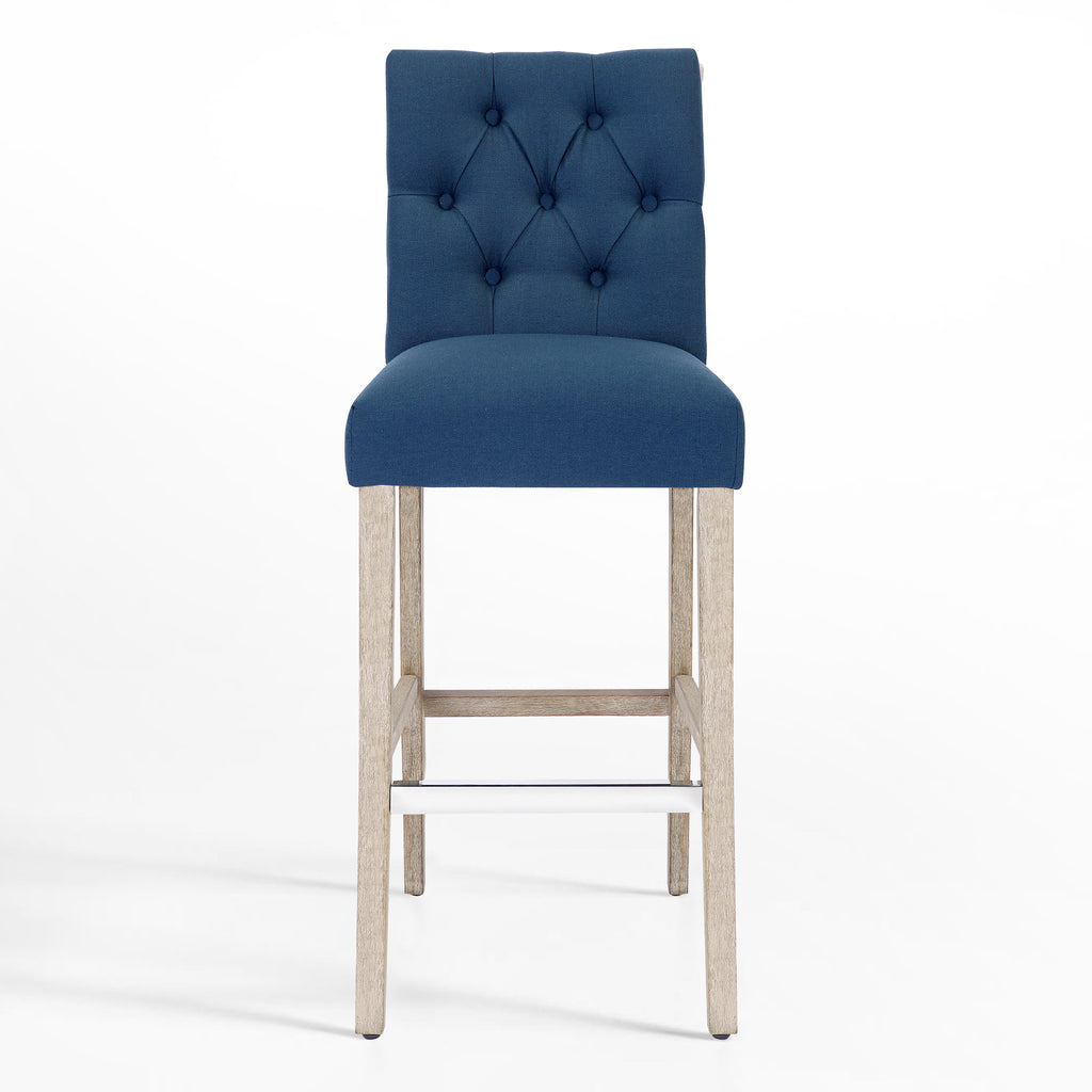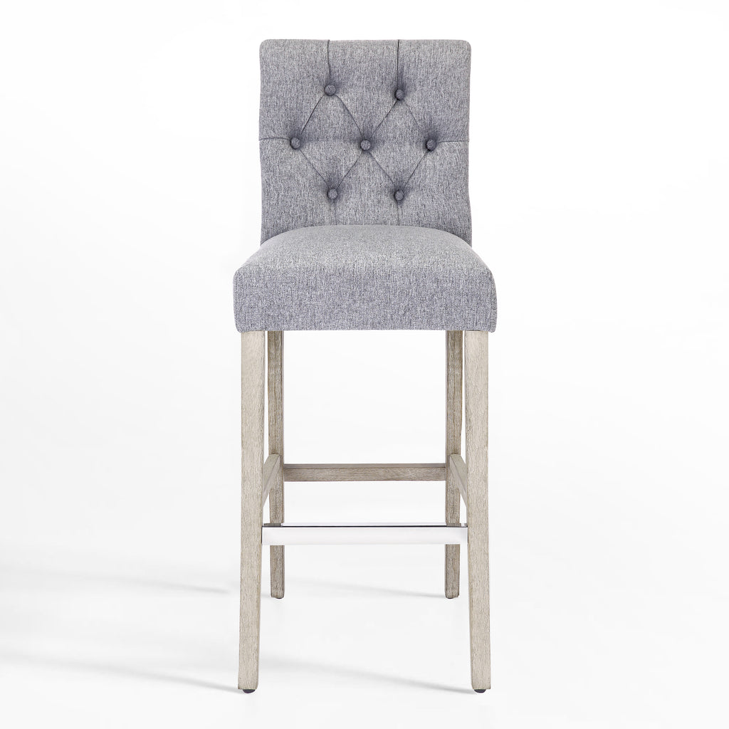 The perfect choice for your kitchen island, this bar stool adds classic style with a diamond button-tufted back and solid wood legs. With dense foam padding, sinuous spring support, and soft fabric upholstery, it's the perfect stool for relaxing in comfort. The back and seat are wrapped in soft poly/linen fabric, while the optional silver metal footrest adds a contemporary touch and protects against scuffs and scratches.