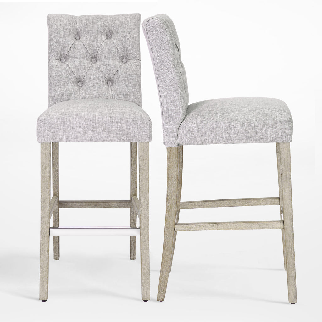 The perfect choice for your kitchen island, these bar stools add classic style with a diamond button-tufted back and solid wood legs. With dense foam padding, sinuous spring support, and soft fabric upholstery, they are the perfect stools for relaxing in comfort. The back and seat are wrapped in soft poly/linen fabric, while the optional silver metal footrest adds a contemporary touch and protects against scuffs and scratches.