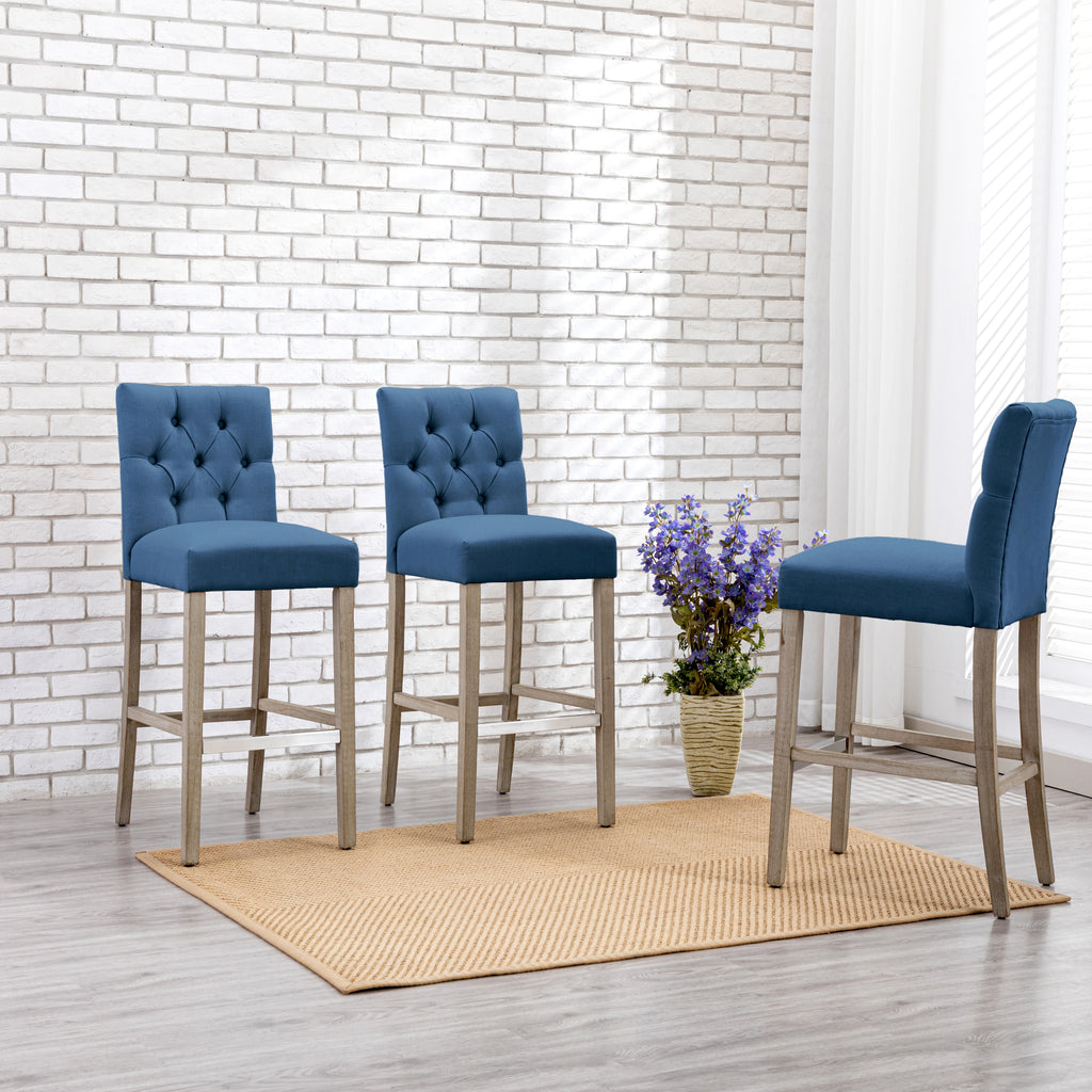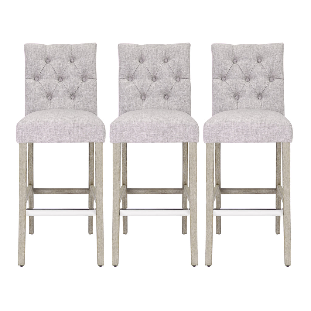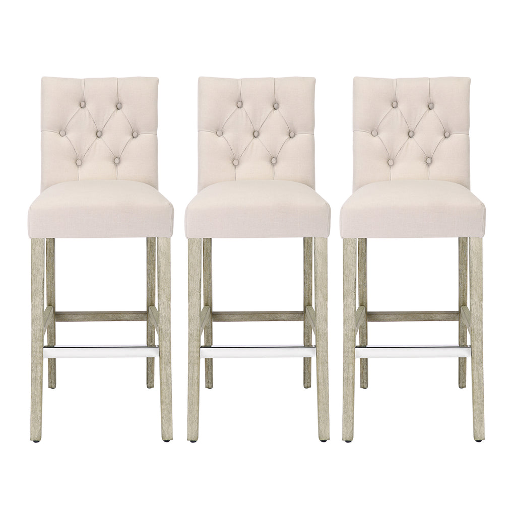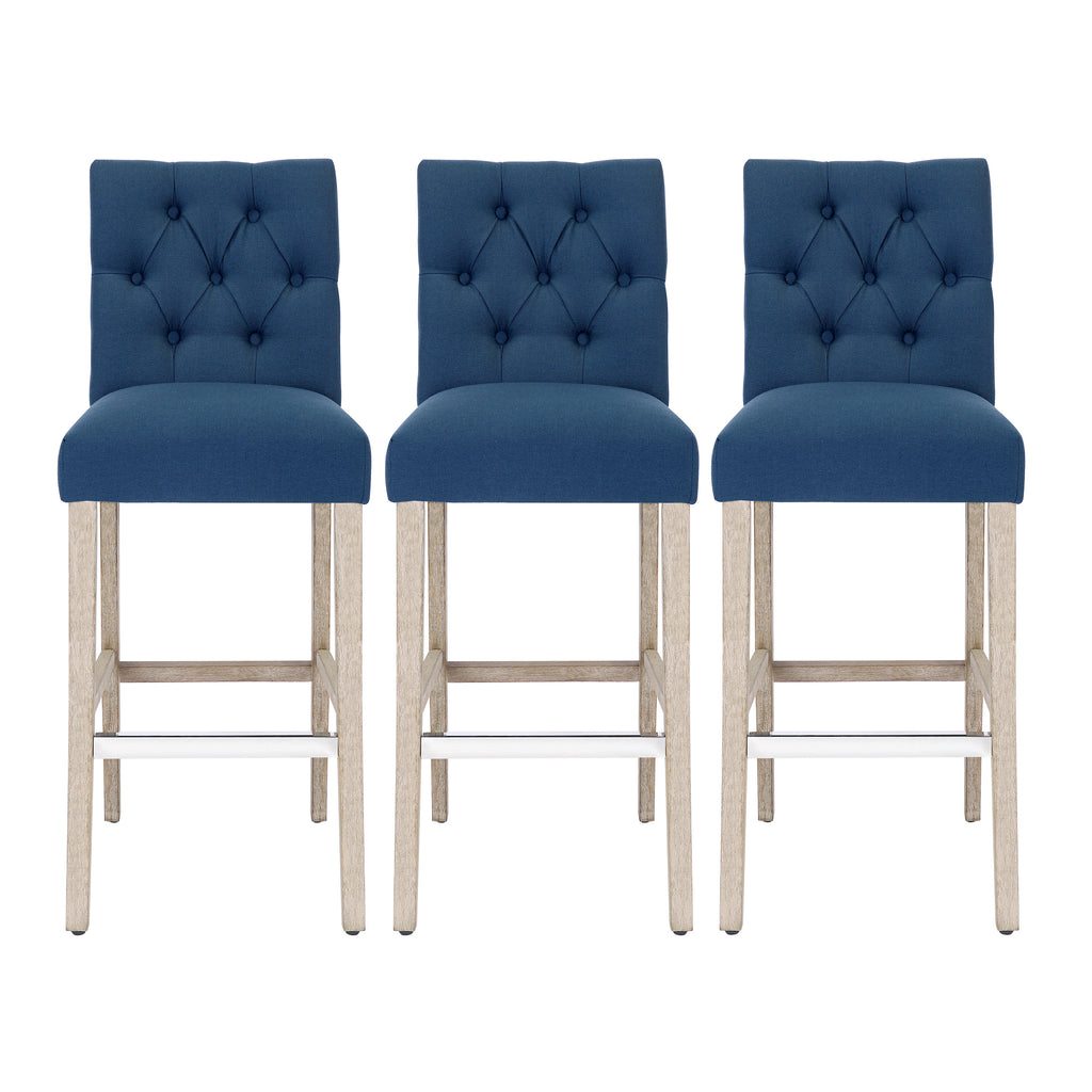 The perfect choice for your kitchen island, these bar stools add classic style with a diamond button-tufted back and solid wood legs. With dense foam padding, sinuous spring support, and soft fabric upholstery, they are the perfect stools for relaxing in comfort. The back and seat are wrapped in soft poly/linen fabric, while the optional silver metal footrest adds a contemporary touch and protects against scuffs and scratches.
