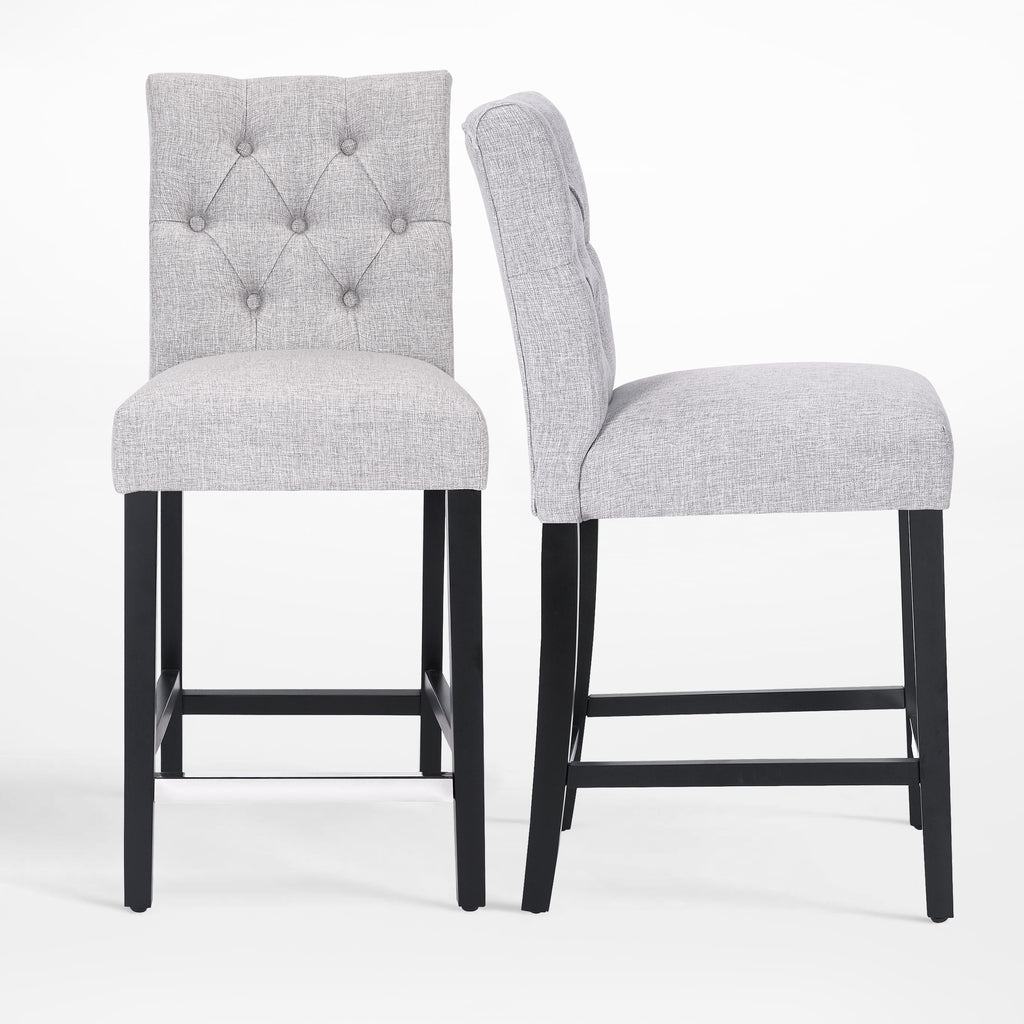 The perfect choice for your kitchen island, these 24" counter stools add classic style with a diamond button-tufted back and solid wood legs. With dense foam padding, sinuous spring support, and soft fabric upholstery, they are the perfect counter stools for relaxing in comfort. The back and seat are wrapped in soft poly/linen fabric, while the optional silver metal footrest adds a contemporary touch and protects against scuffs and scratches.