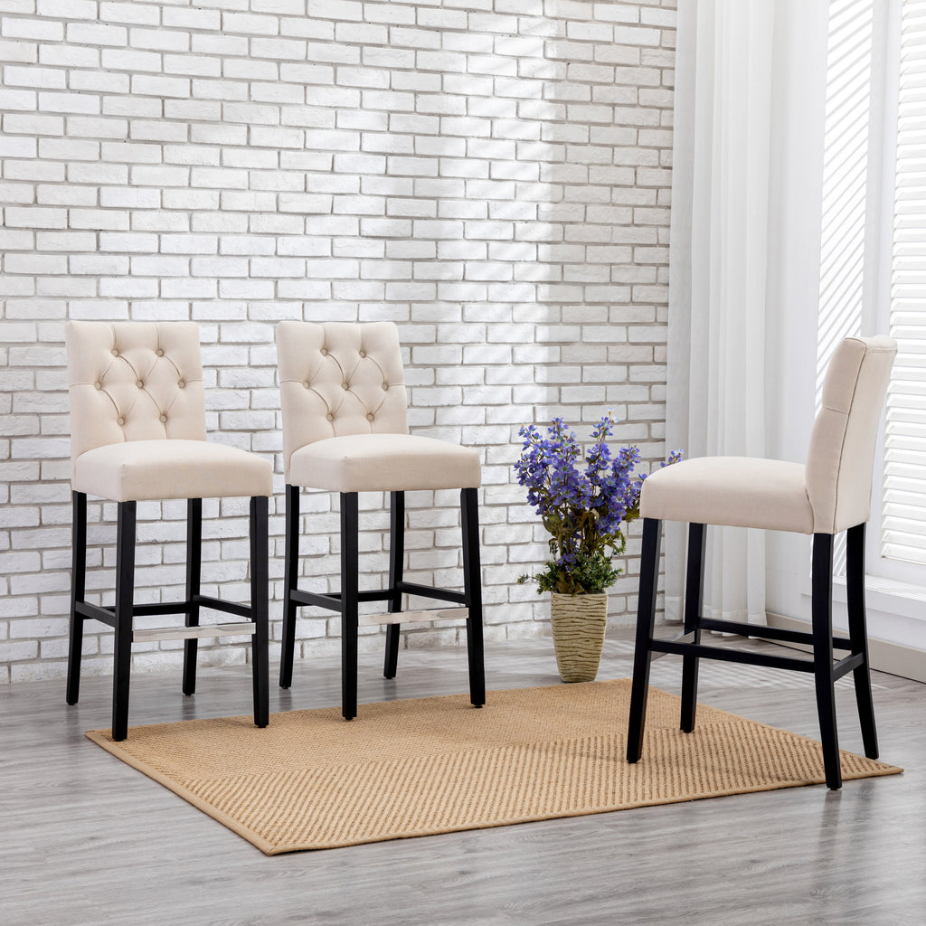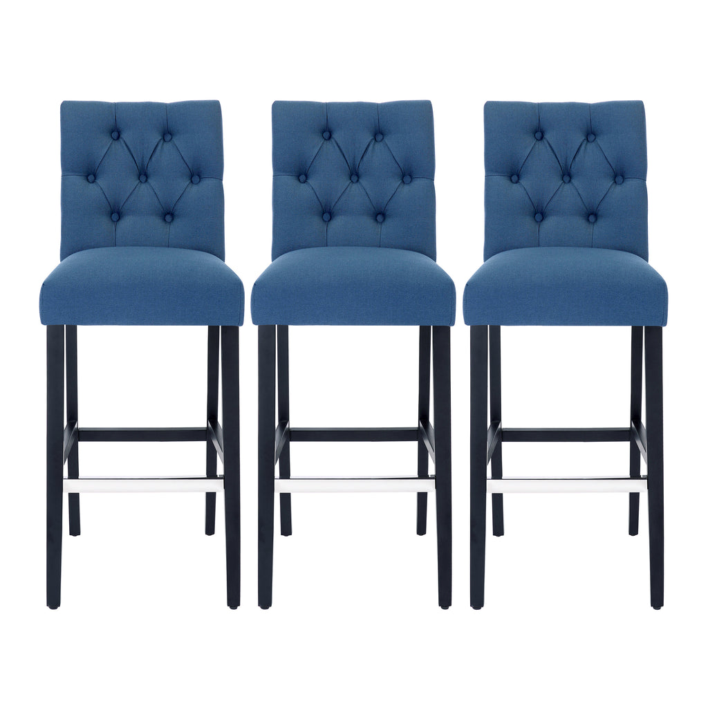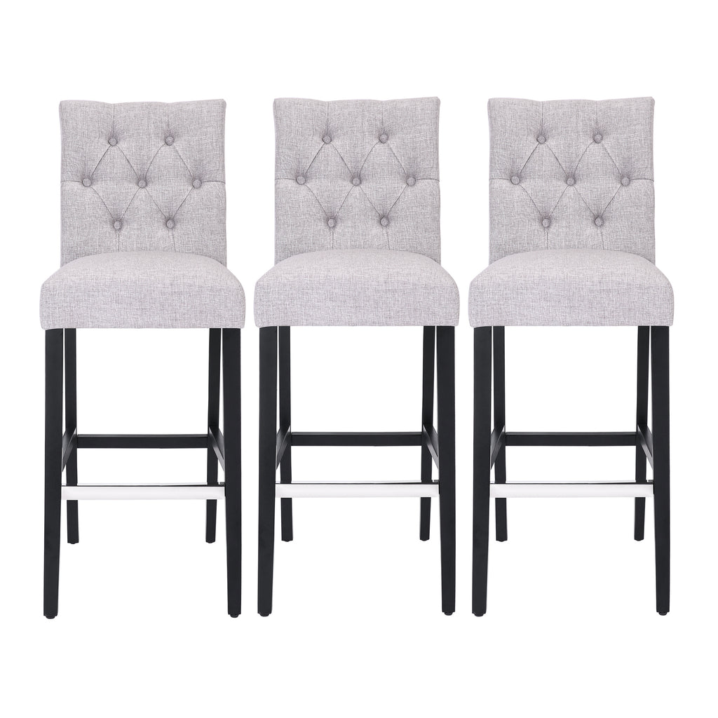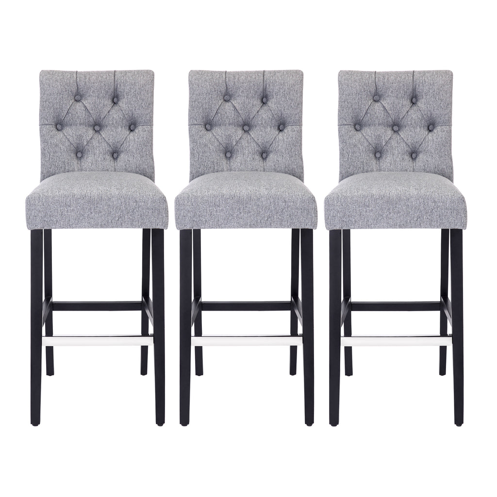 The perfect choice for your kitchen island, these 29" bar stools add classic style with a diamond button-tufted back and solid wood legs. With dense foam padding, sinuous spring support, and soft fabric upholstery, they are the perfect bar stools for relaxing in comfort. The back and seat are wrapped in soft poly/linen fabric, while the optional silver metal footrest adds a contemporary touch and protects against scuffs and scratches.