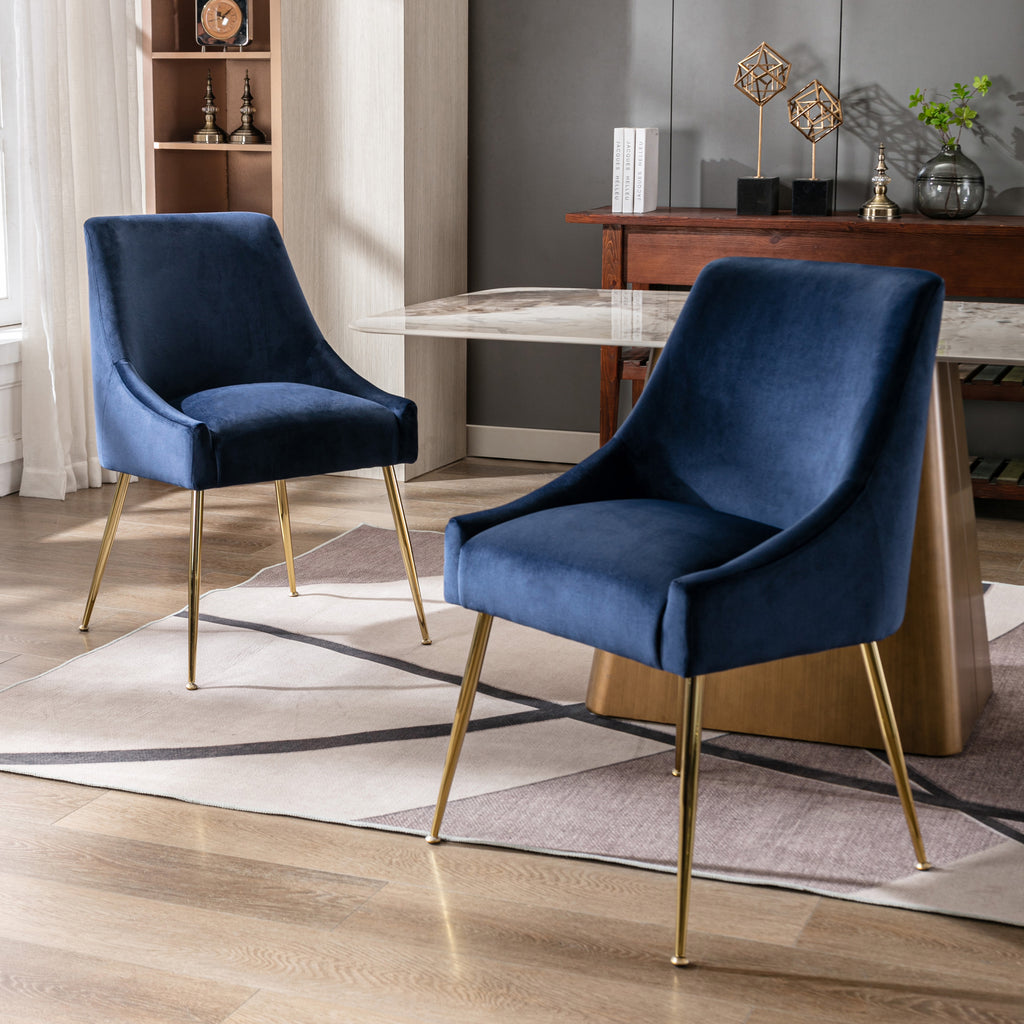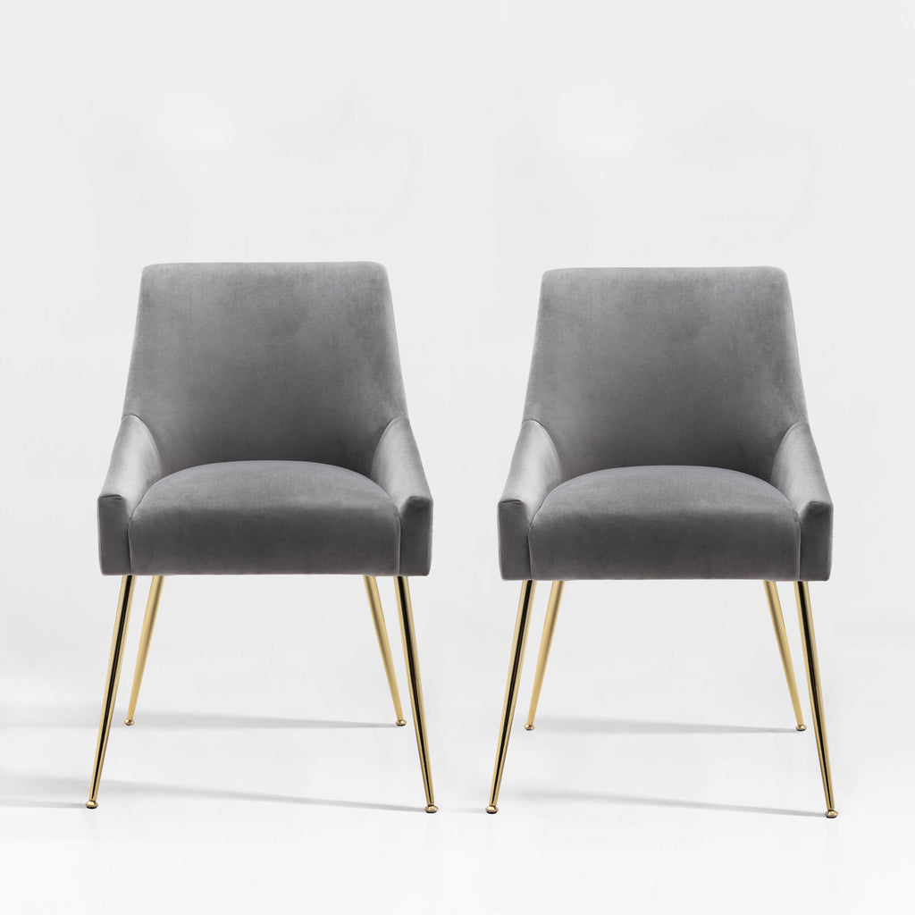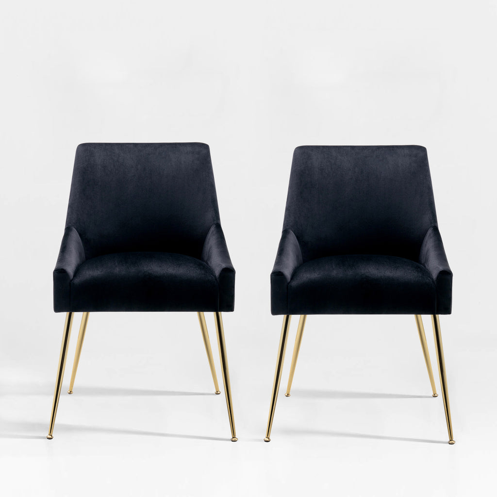 Add a touch of beauty, flare, and elegance to every room. These soft upholstered velvet fabric gives a warm and comfortable feeling to any room that is sure to complement it. The chairs stands out with its rounded ball feet, elegant handle on the back of the chairs, and golden tapered metal legs with a polished gold finish, which combined with the beautiful soft velvet fabric makes them a standout piece.