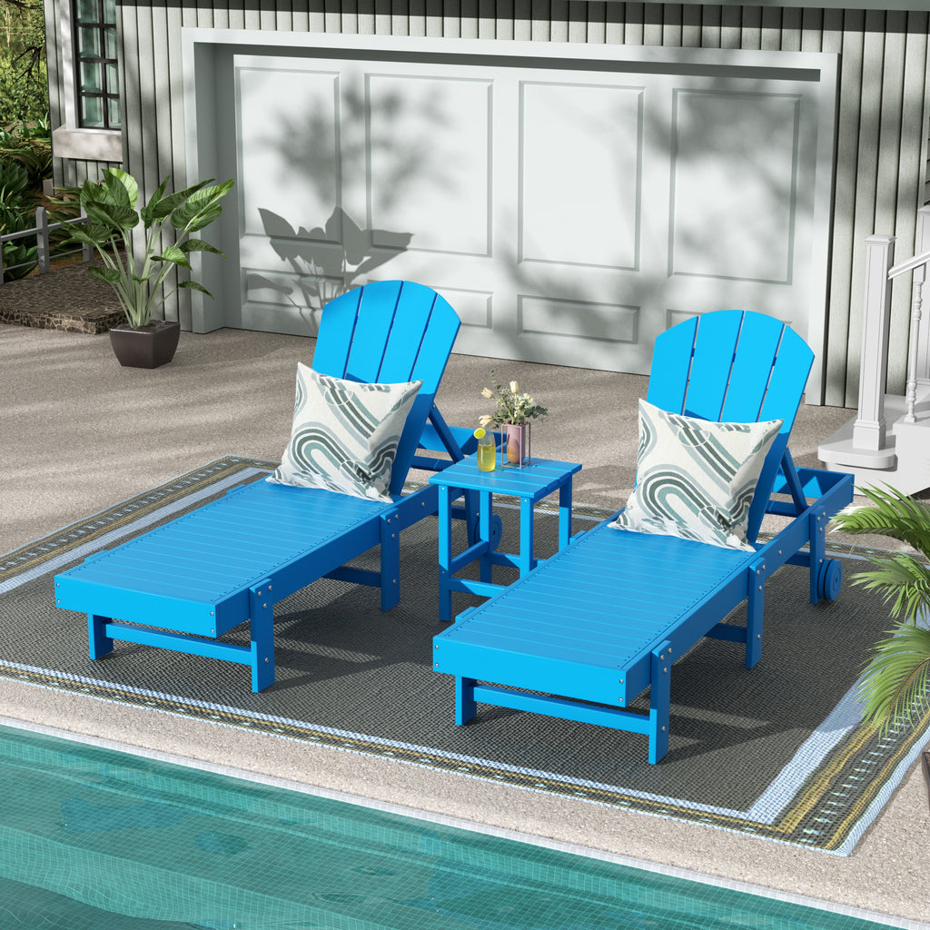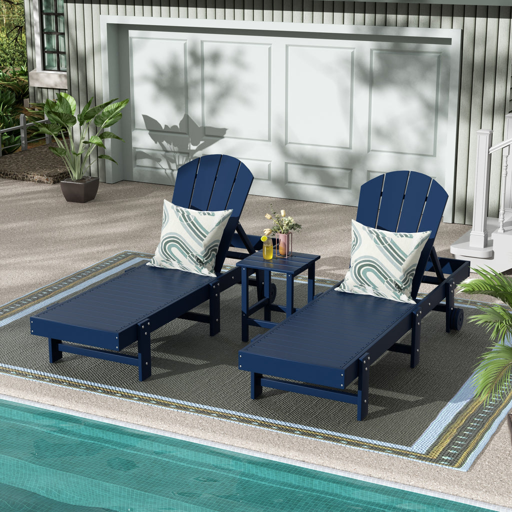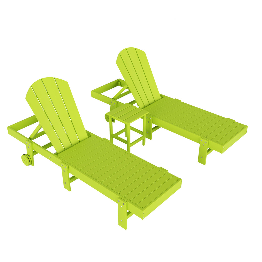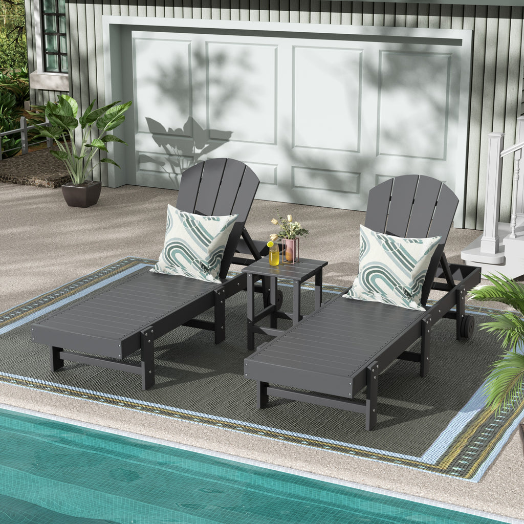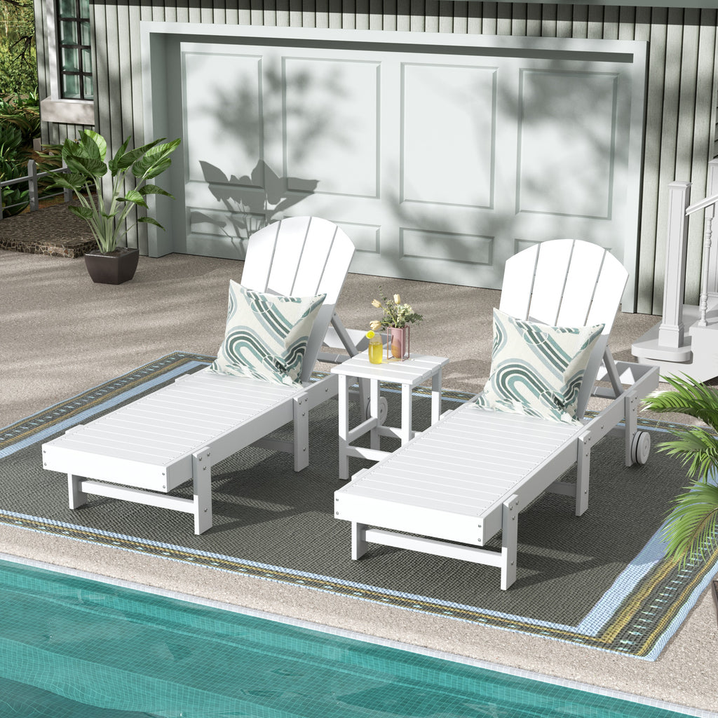 Lay by the poolside and catch a tan or chat with a friend with this attractive 3-piece reclining chaise lounger and side table set. Charming design with the seashell adirondack back that brings a piece of the beach with you and gives your backyard that refreshing feeling. Designed to make relaxing easy with the helpful wheels to make moving the lounger simple and without dragging and accidentally scraping the lounger. Made with an eco-friendly HDPE material that is durable and perfect for the outdoors, the all-weather and UV-resistant material helps keep the lounger protected each season. Place your favorite drink and snacks on the square side table, which perfectly matches the chaise lounger aesthetic and adds that finishing touch that looks stunning by the poolside.