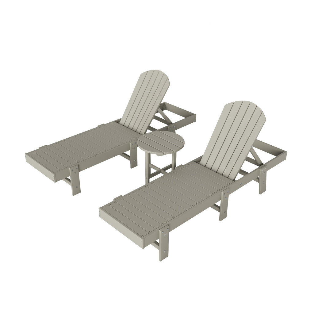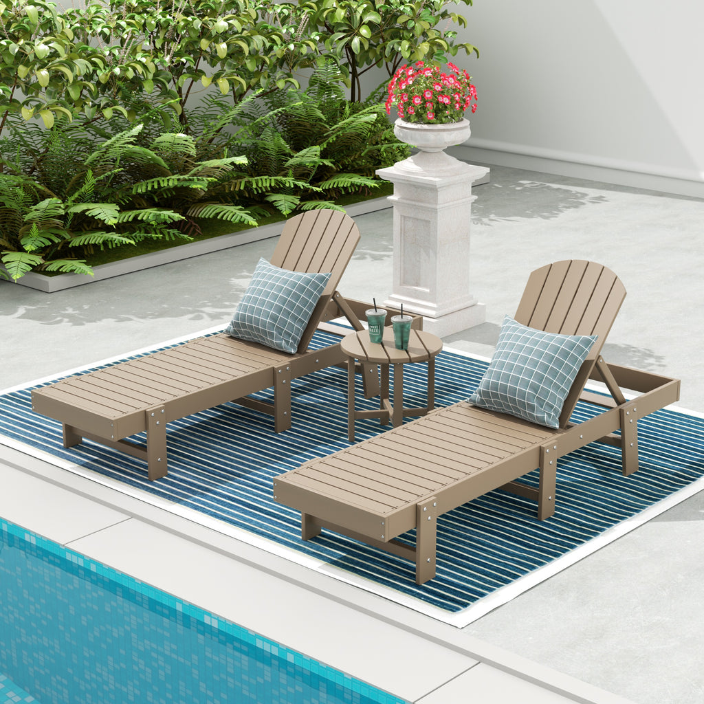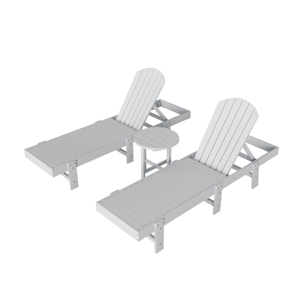 Lay by the poolside and relax with a loved one or friend this season in this attractive 3-piece reclining chaise lounger and side table set. Charming design with the classic adirondack back that brings a piece of the beach with you and gives your backyard that refreshing feeling . Spacious seating thanks to the armless design, making it perfect for relaxing. Made with an eco-friendly HDPE material that is durable and perfect for the outdoors, the all-weather and UV-resistant material helps keep the lounger protected each season. Lay back and relax while having your refreshing drink of choice next to you on the matching adirondack side table.