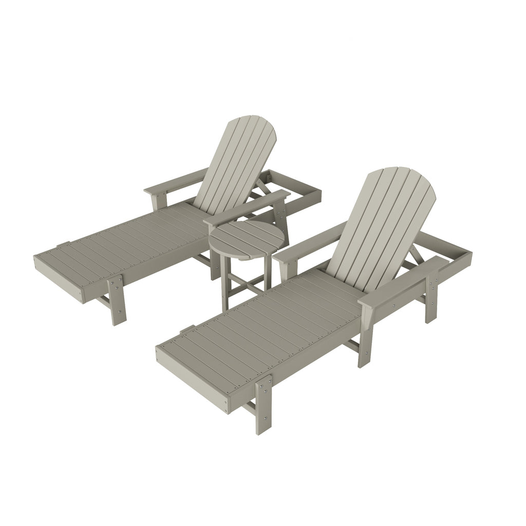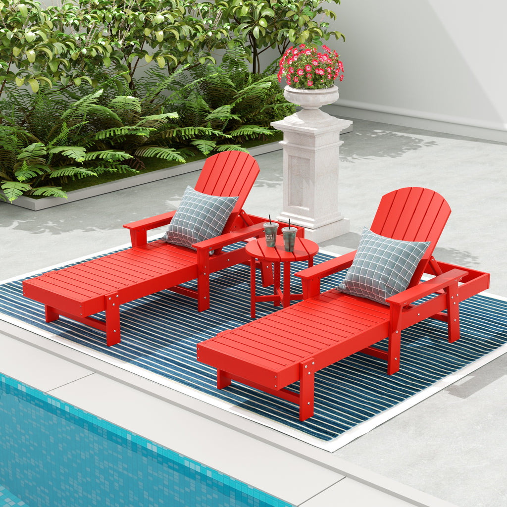 Lay by the poolside and catch a tan with a loved one this season in this attractive 3-piece reclining chaise lounger and side table set. Charming design with the seashell adirondack back that brings a piece of the beach with you and gives your backyard that refreshing feeling. Spacious seating, wide armrests, and a slatted backrest make the perfect seat for relaxing. Relax next to the pool while having your favorite drinks and snacks right next to you on the lovely side table that is perfect to have next to your side. Made with an eco-friendly HDPE material that is durable and perfect for the outdoors, the all-weather and UV-resistant material helps keep the lounger protected each season.