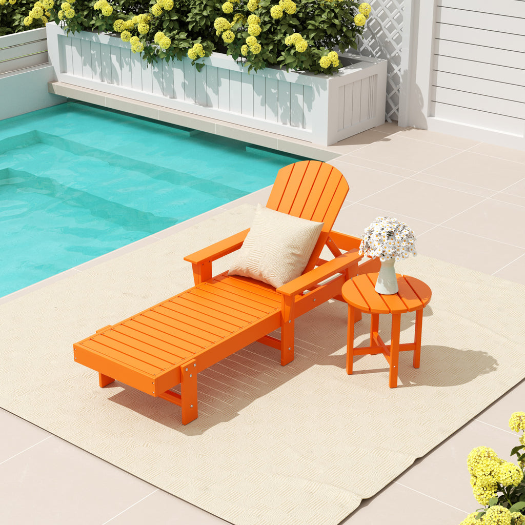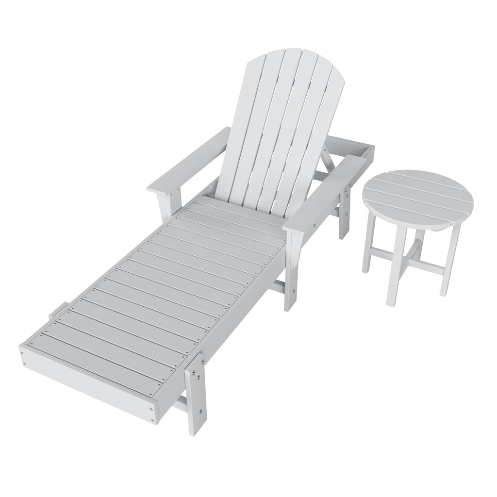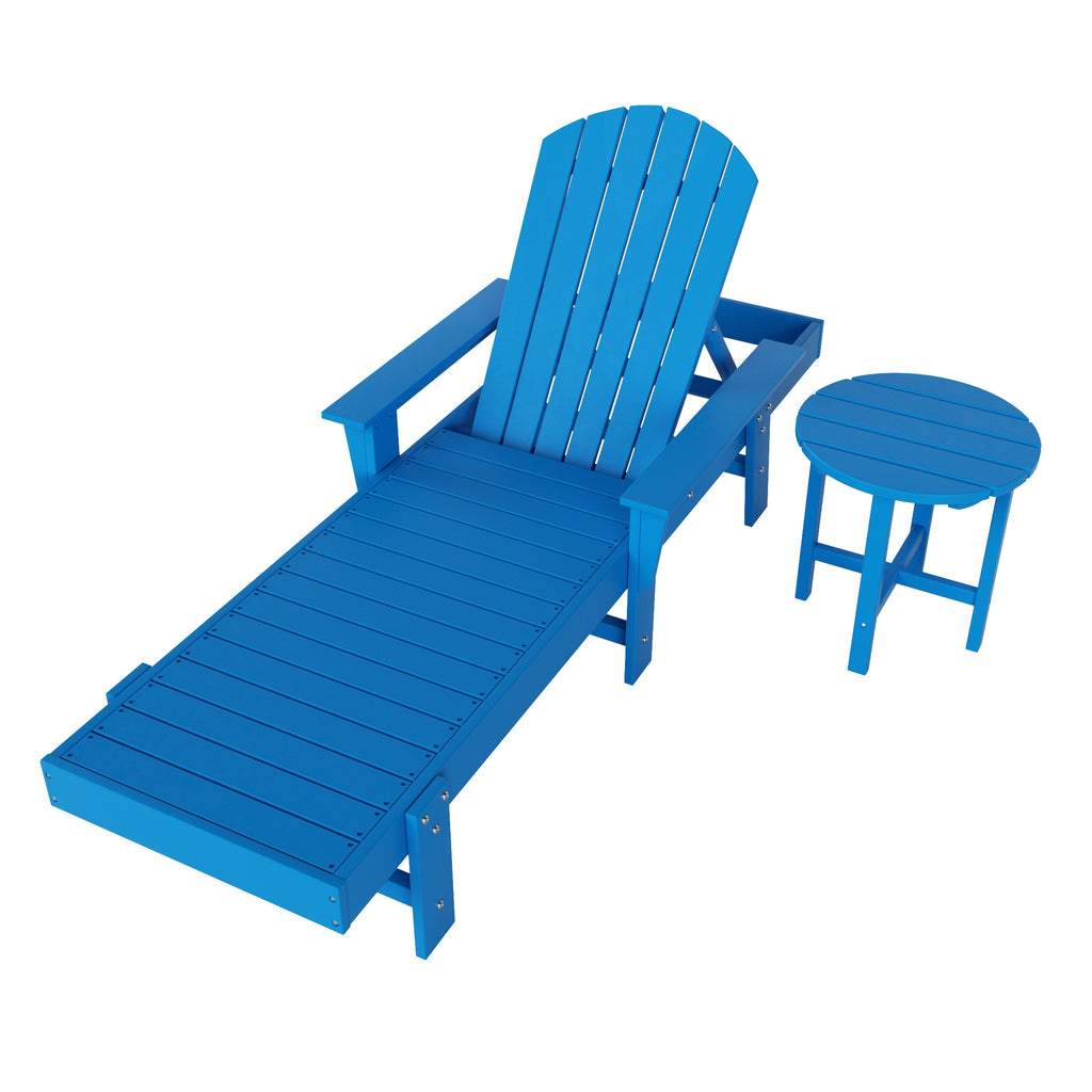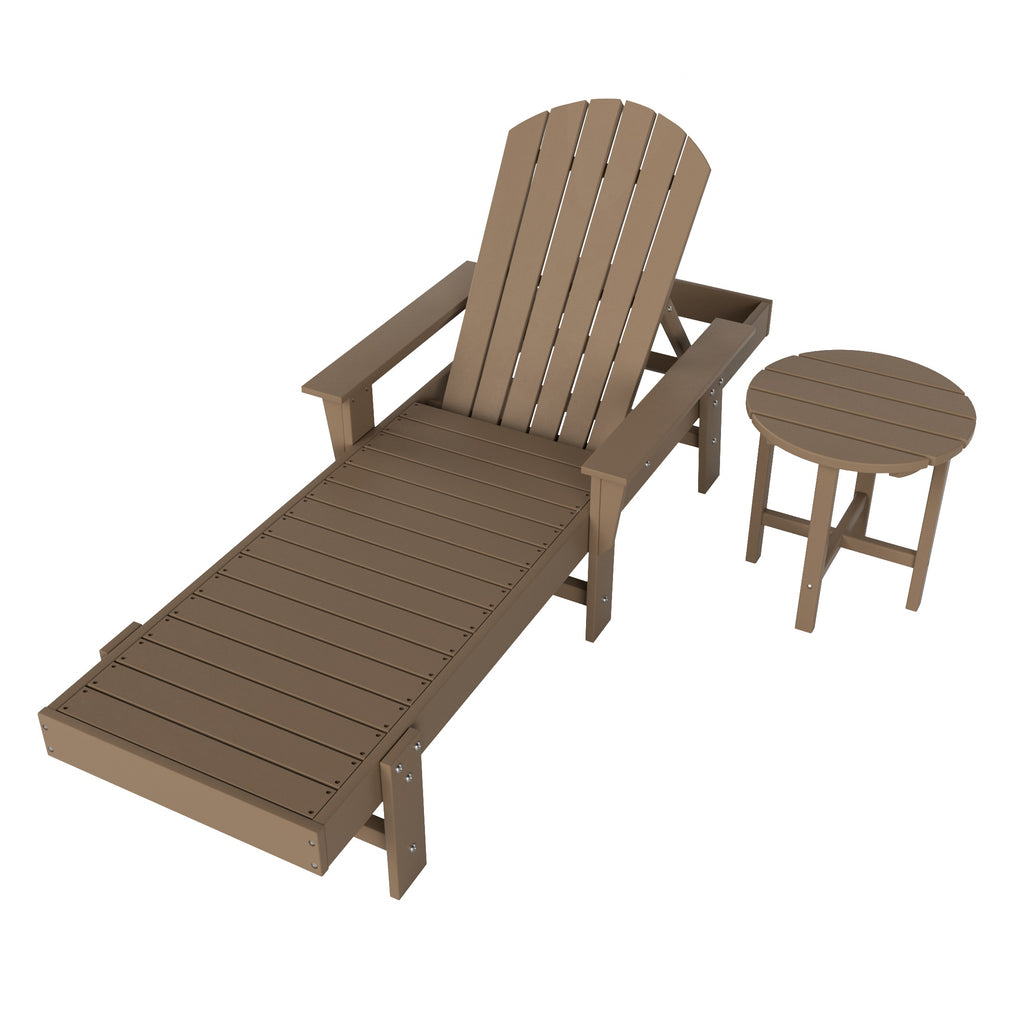 - Set Includes: One (1) classic Adironondack chaise lounger with arms and One (1) round side table