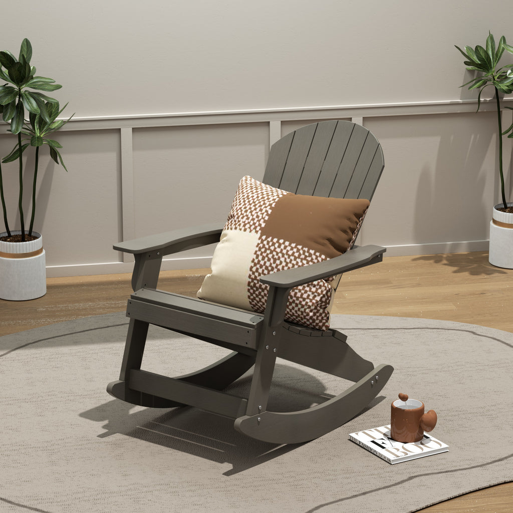 Bring a piece of the homestead to your home and add comfort with this rustic rocking Adirondack chair. Sit and relax in the spacious and contoured seat with the wide armrest, and rock back and forth while relaxing out on the porch with the smooth rocker rails that are perfect for unwinding after a long day. Perfect for the outdoors, the eco-friendly HIPS (Polystrene) material is weather-resistant and can withstand the outdoor weather. The material also has a wood-like grain texture that gives the a natural wood look without any of the disadvantages. This rocking chair is the perfect addition to your backyard this season.