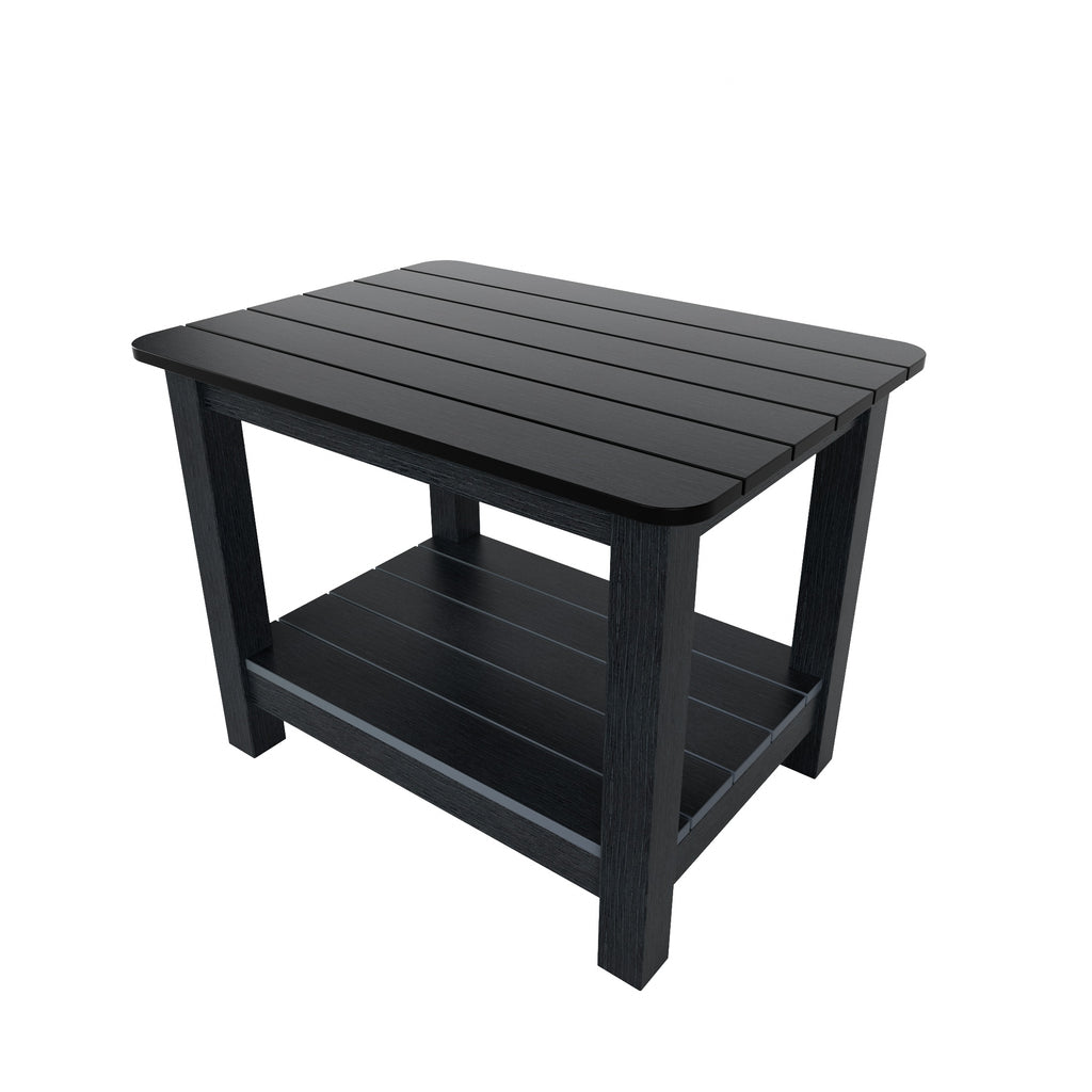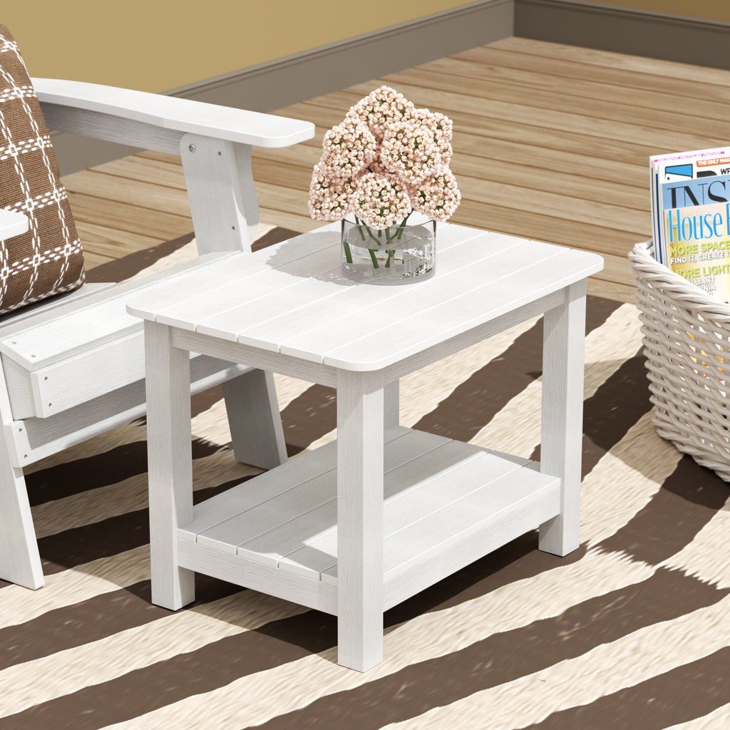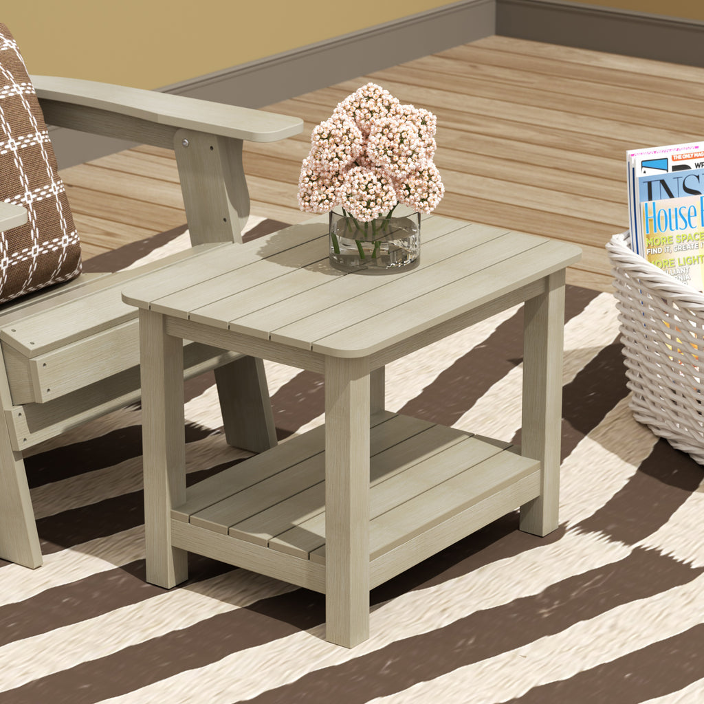 Perfect for the patio or next to the poolside while laying on your ideal chair, this outdoor Adirondack side table adds that finishing touch to your patio. Modern and simple, this side table is the perfect match for your Adirondack chair or chaise lounger and is perfect for holding all your snacks, drinks, and favorite books or decor piece underneath. Made with a durable all-weather High Impact Polystrene (HIPS) material that has a wood-textured finish that is smooth and gives a natural wood look to add a touch of charm.