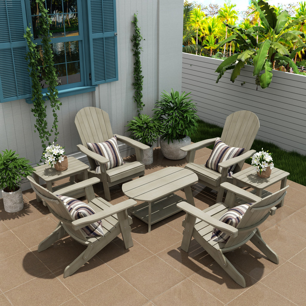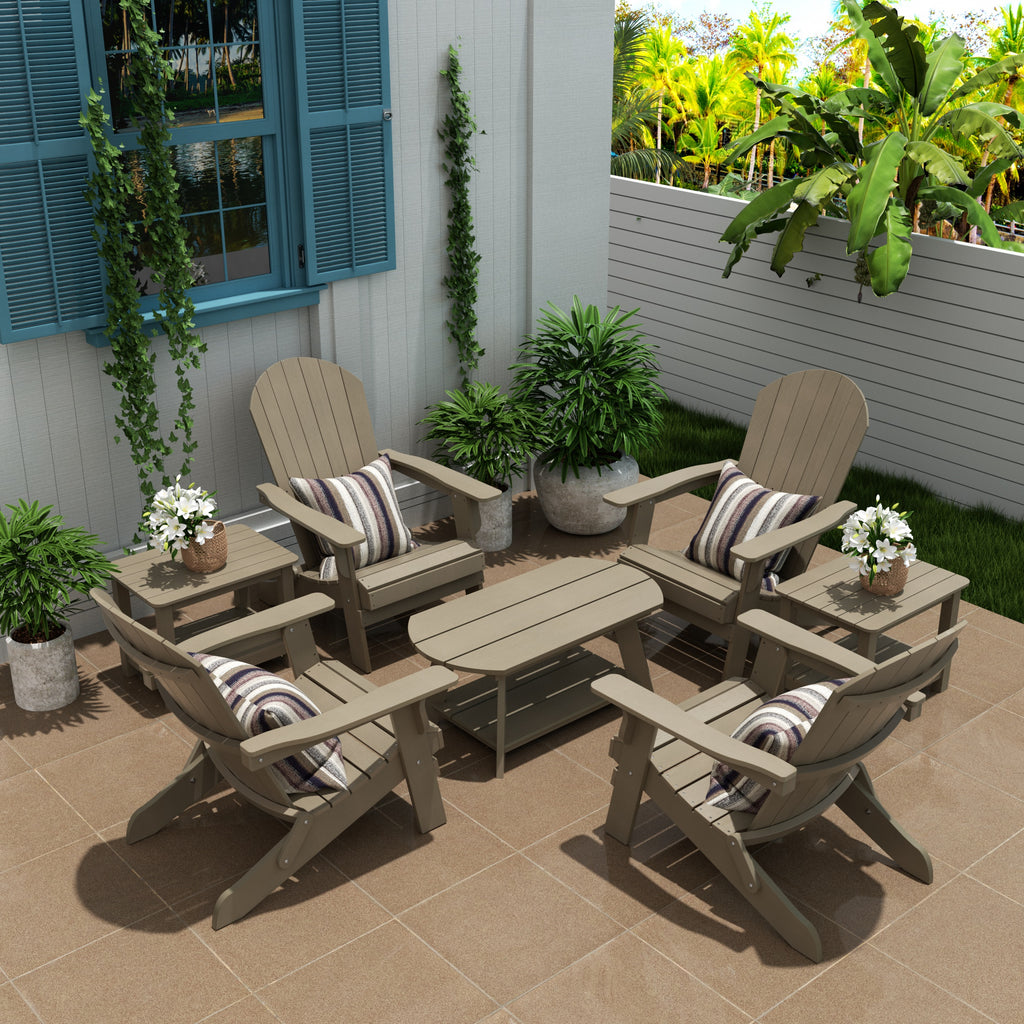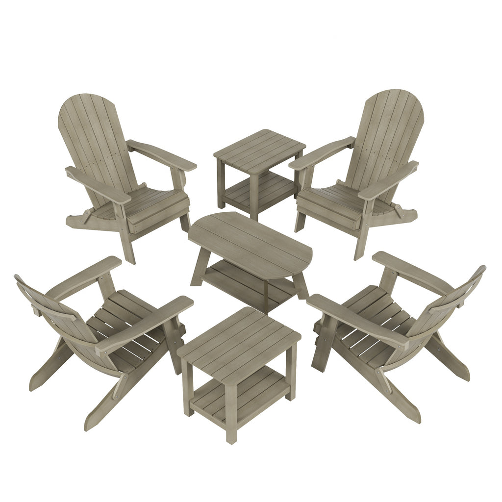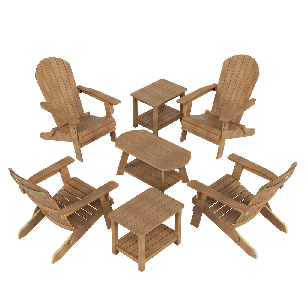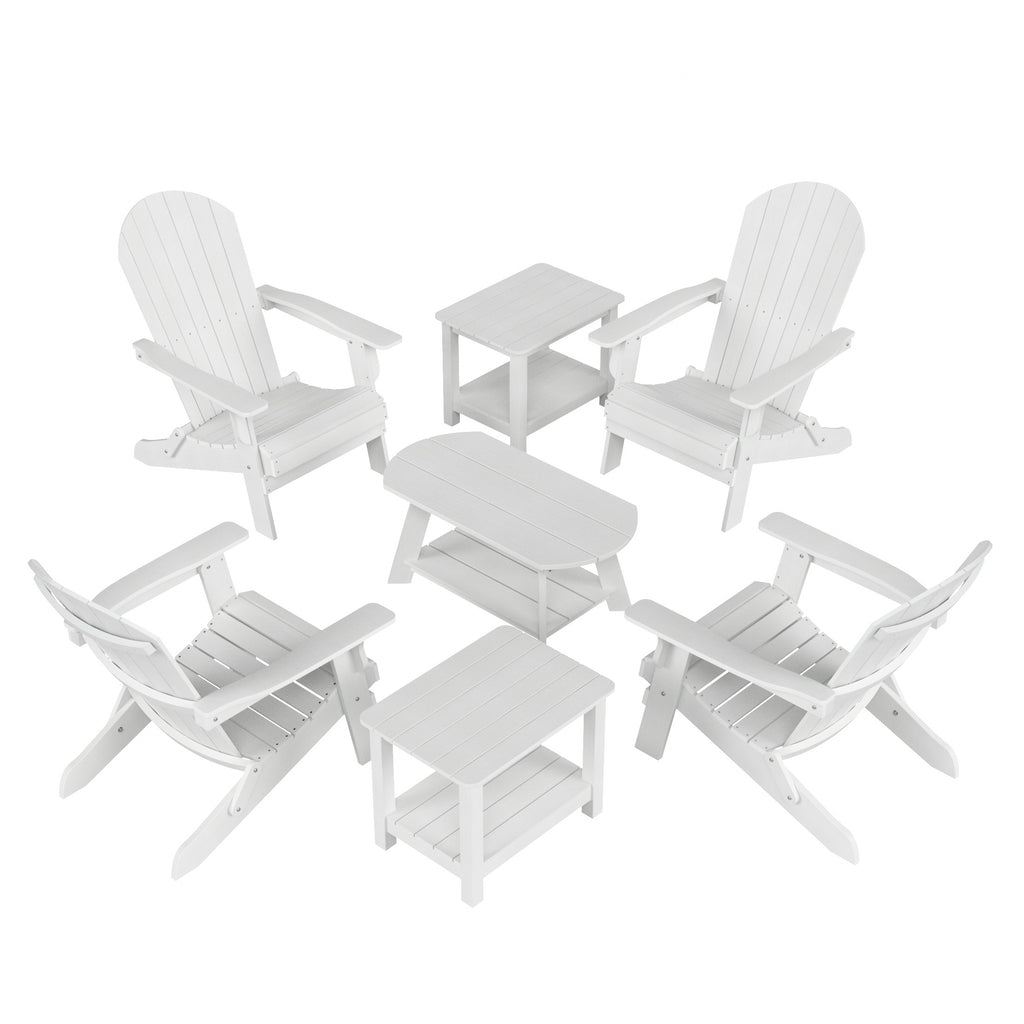 - Set Includes: Four (4) folding adirondack chair, Two (2) side table, and One (1) coffee table