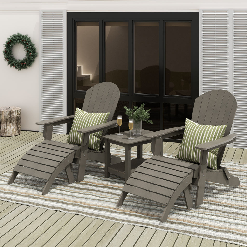 - Set Includes: Two (2) folding adirondack chair, Two (2) folding ottoman, and One (1) side table