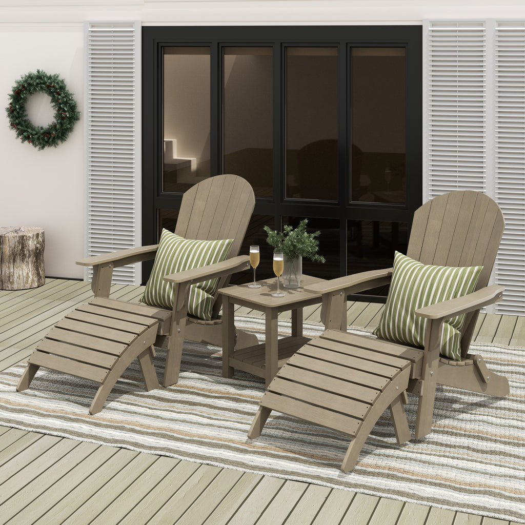 Give your backyard that rustic charm while relaxing with a friend on a warm spring day with this charming 5-piece folding Adirondack chair, folding ottoman, and side table set. Made to last with an all-weather-resistant HIPS (polystyrene) plastic material that features a smooth wood-like grain texture that is sure to withstand each season. Sit and relax in comfort with the slanted and spacious contoured seat to lay back and relax, an arched back, and the ottoman to kick your legs up and relax, all while placing your snacks and drinks on top of the double-layer side table that is perfect for placing your favorite books or decor piece underneath. Store the ottoman and chair with ease thanks to the foldable design, which makes it easier to save space in your storage space.