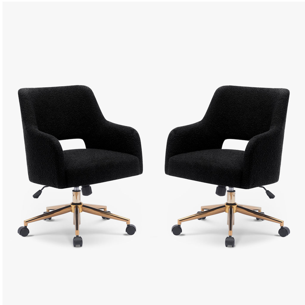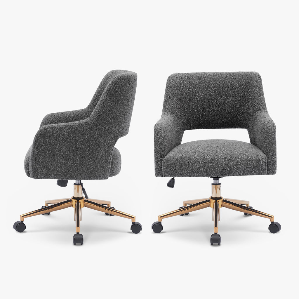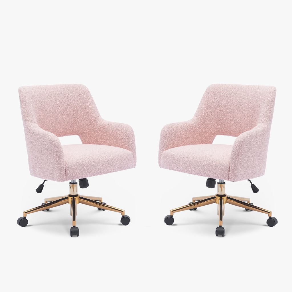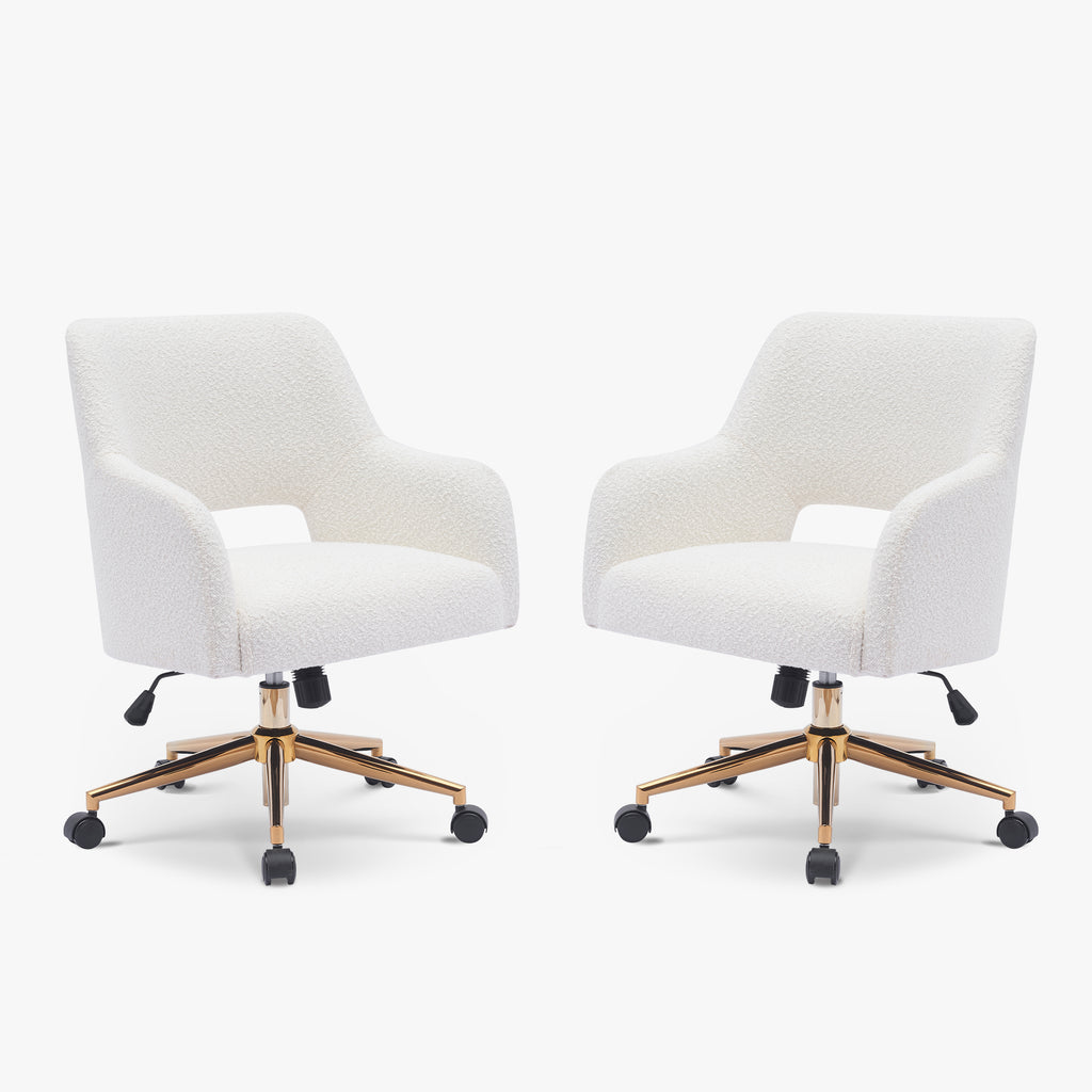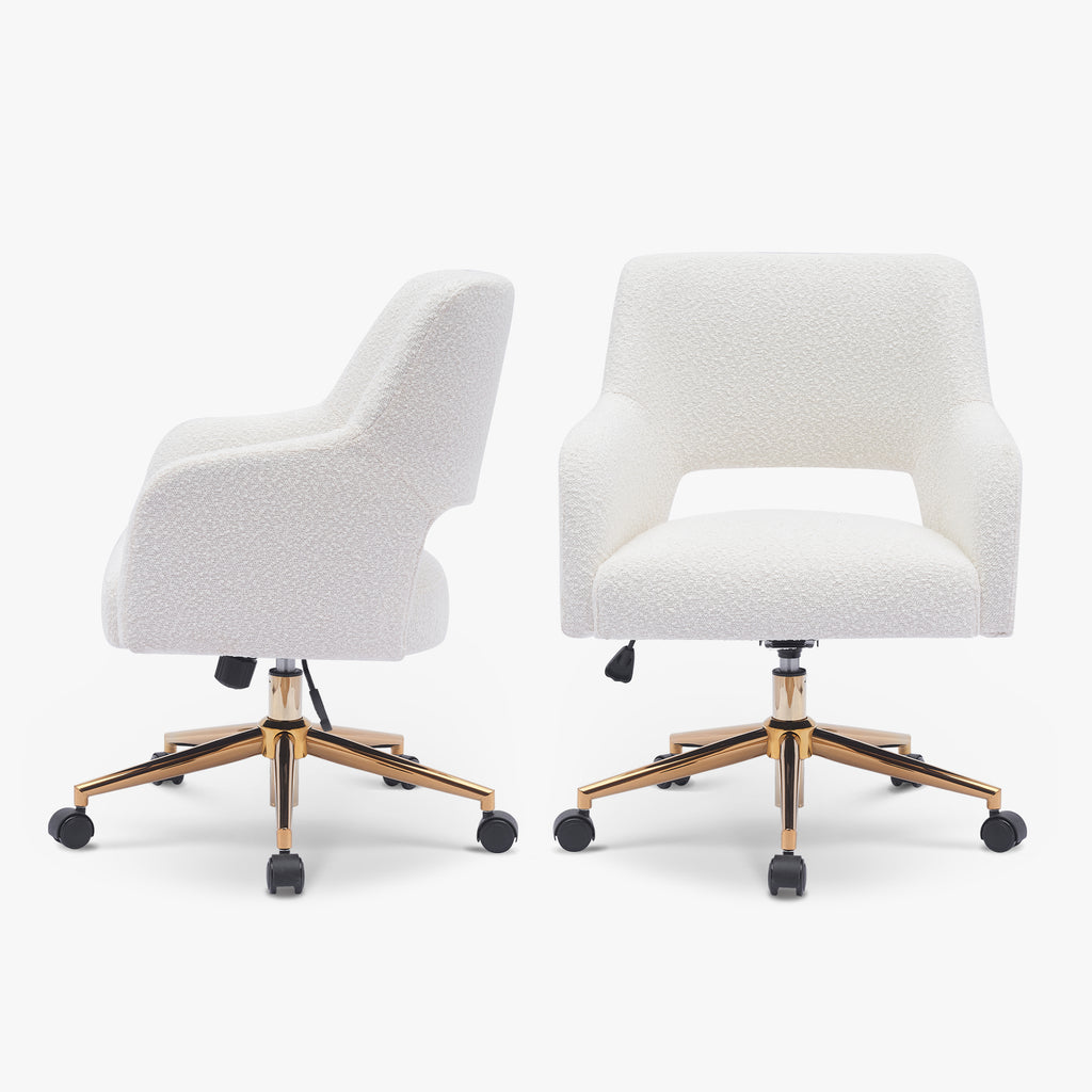 Give your home office or vanity area a delightful transformation with our charming set of upholstered boucle vanity chairs that can also be used for the office chairs. these cushioned and cozy chairs, meticulously crafted with boucle fabric, provide water and stain resistance while offering an extra layer of protection and comfort with their soft and plush feel. enjoy spacious and comfortable seating with wide and curved backrests that cradle your back and offer breathability. sink into superior comfort with foam-filled seats that spring back due to the foam's durability. glide around effortlessly on the 360° swivel bases and omnidirectional wheels. easily adjust the chair height with the adjustable height levelers and recline into serenity with the tilt-back function that allows you to choose your desired tilt force.