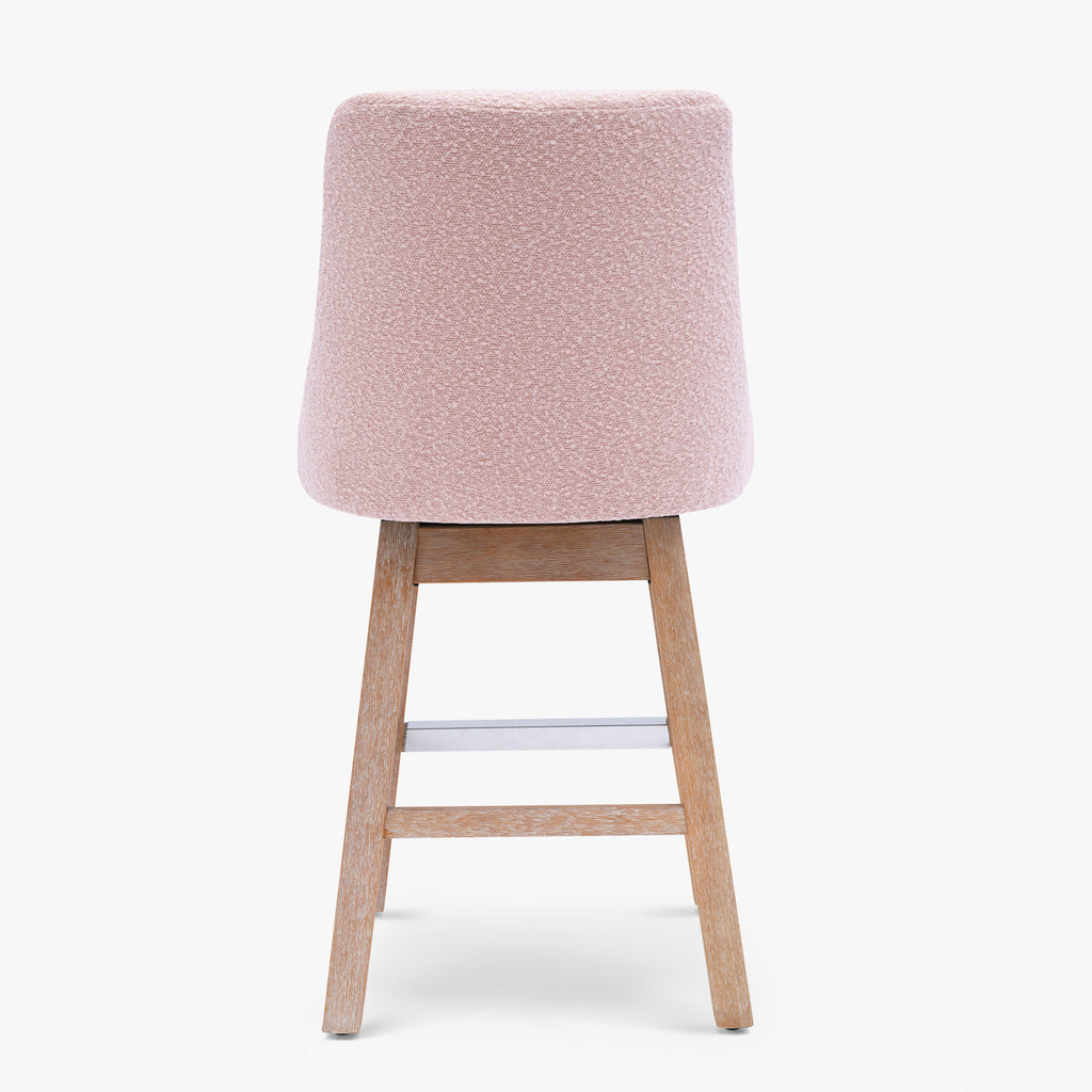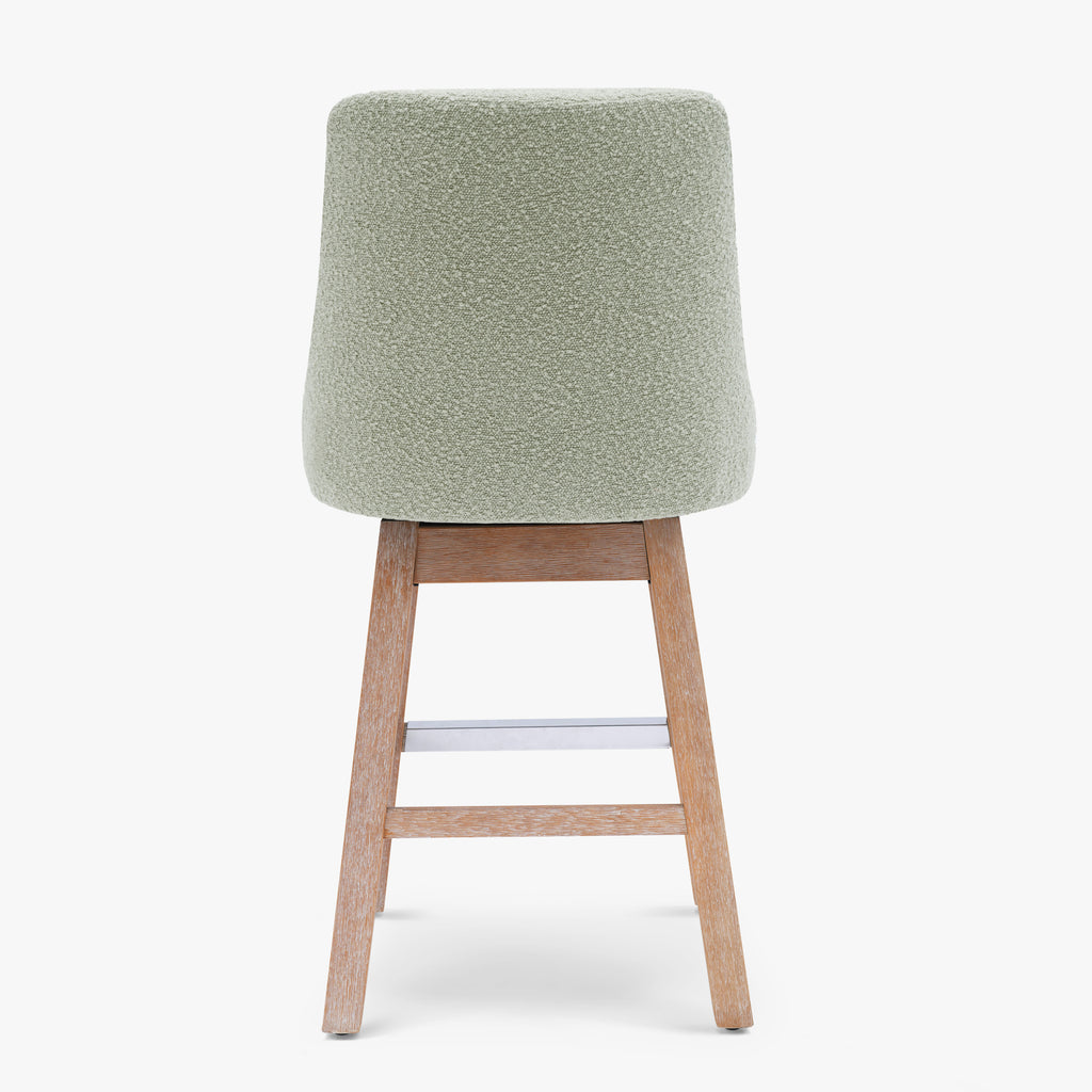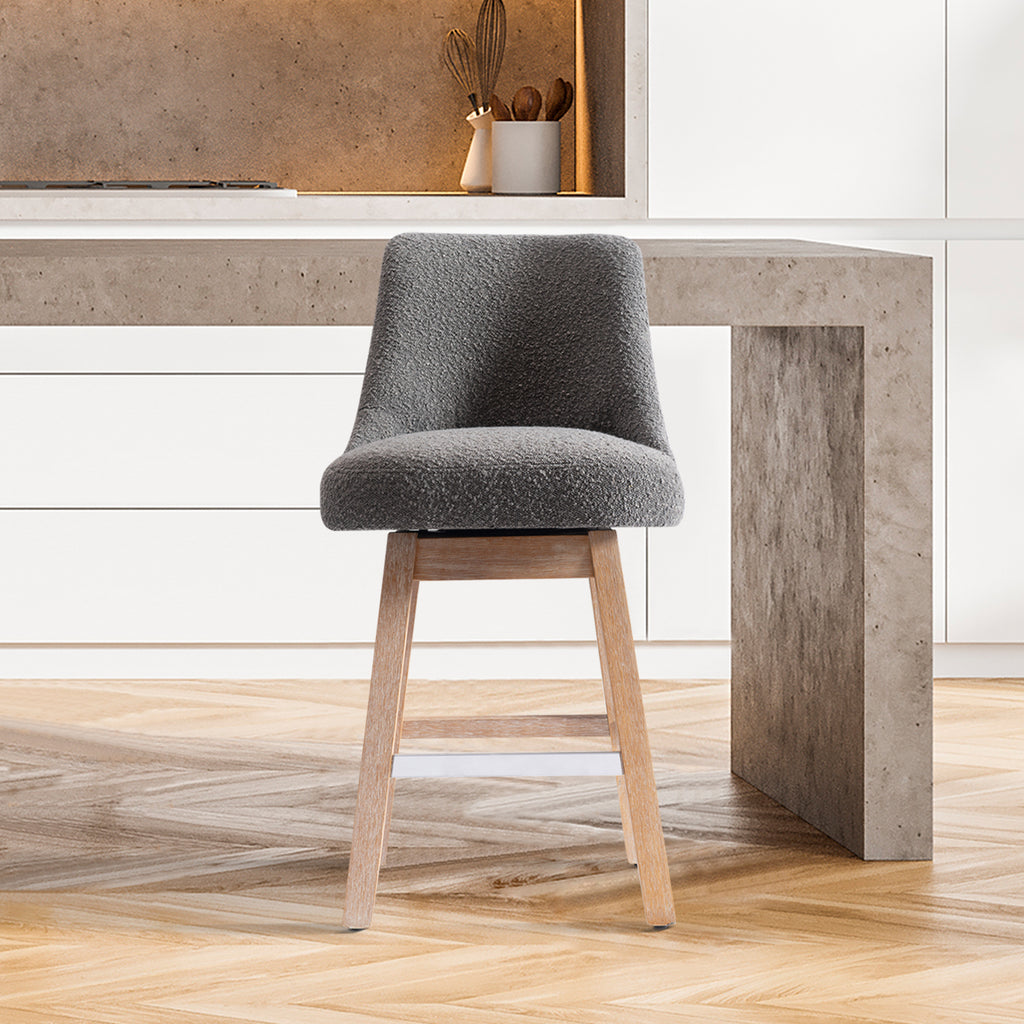 Immerse your farmhouse kitchen in sophistication with our Boucle fabric counter stool, tailored for the enjoyment of the entire family. The antique-stained wood legs radiate rustic charm, while the water- and stain-resistant upholstery ensures easy cleanups, tailored for the demands of family life. Crafted from sturdy rubberwood and featuring a generously padded poly foam seat, this stool seamlessly combines durability with lavish comfort—perfect for vibrant family gatherings. The thoughtfully designed silhouette, coupled with the convenient 360-degree swivel feature, transforms sitting into a pleasure for everyone, encouraging seamless movement. Adding to its appeal, the metal plate on the front footrest brings a touch of refinement and practicality, creating a family-friendly and tastefully stylish addition. Enhance your kitchen atmosphere with this indulgent and tasteful counter stool, effortlessly meeting your family's everyday seating needs.
