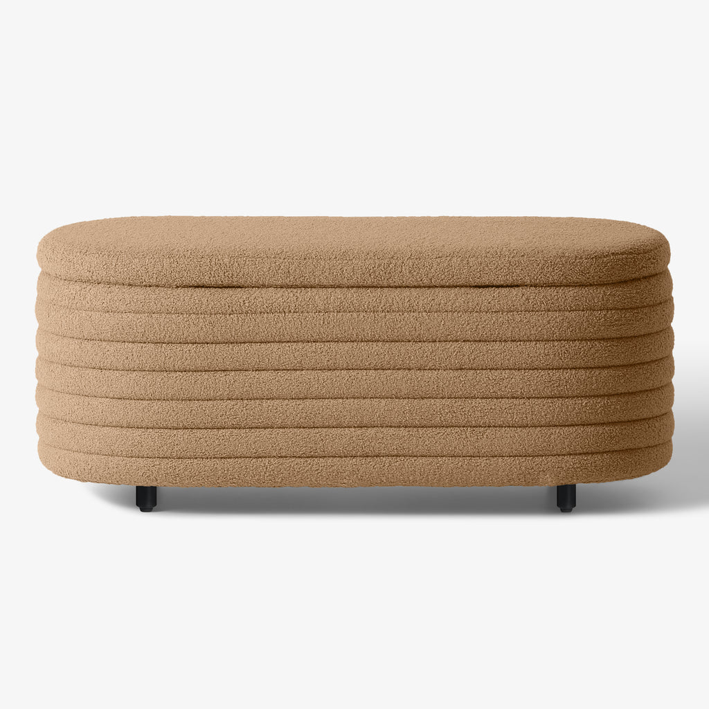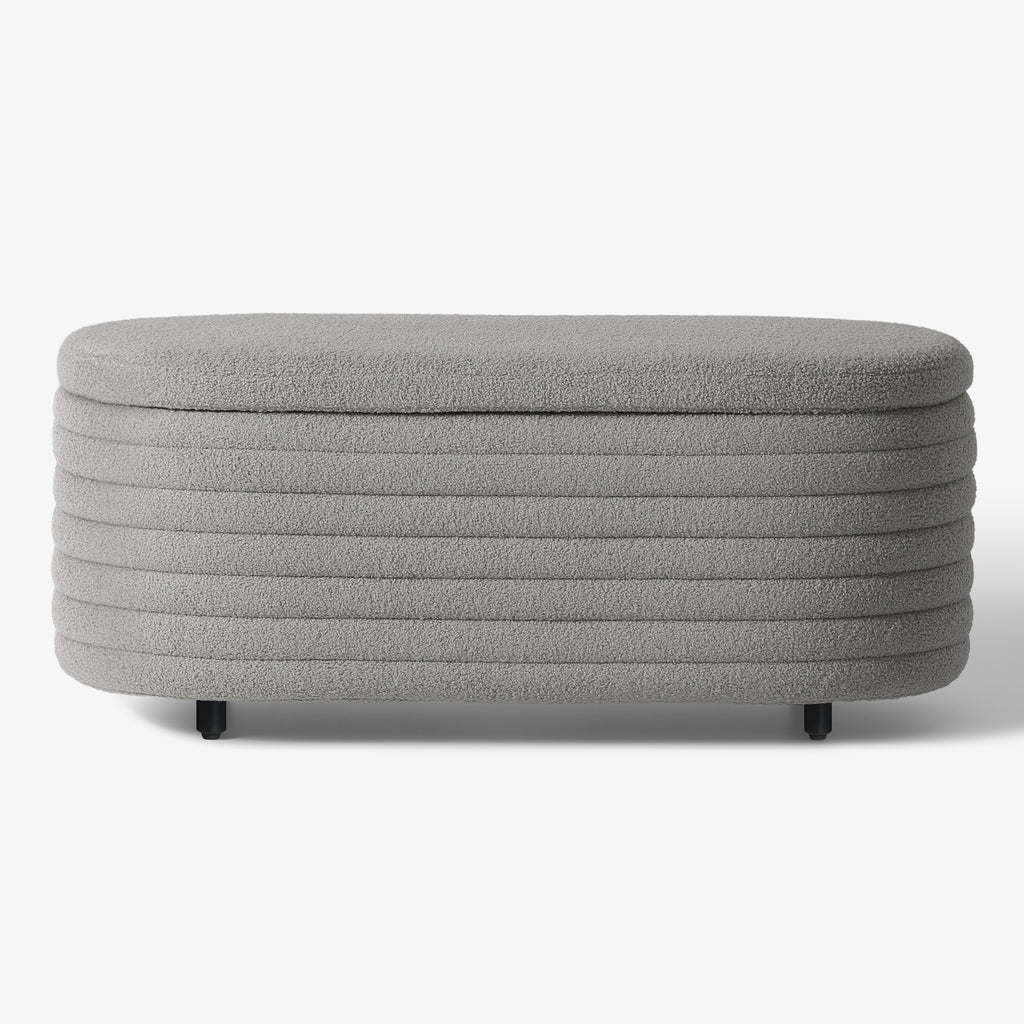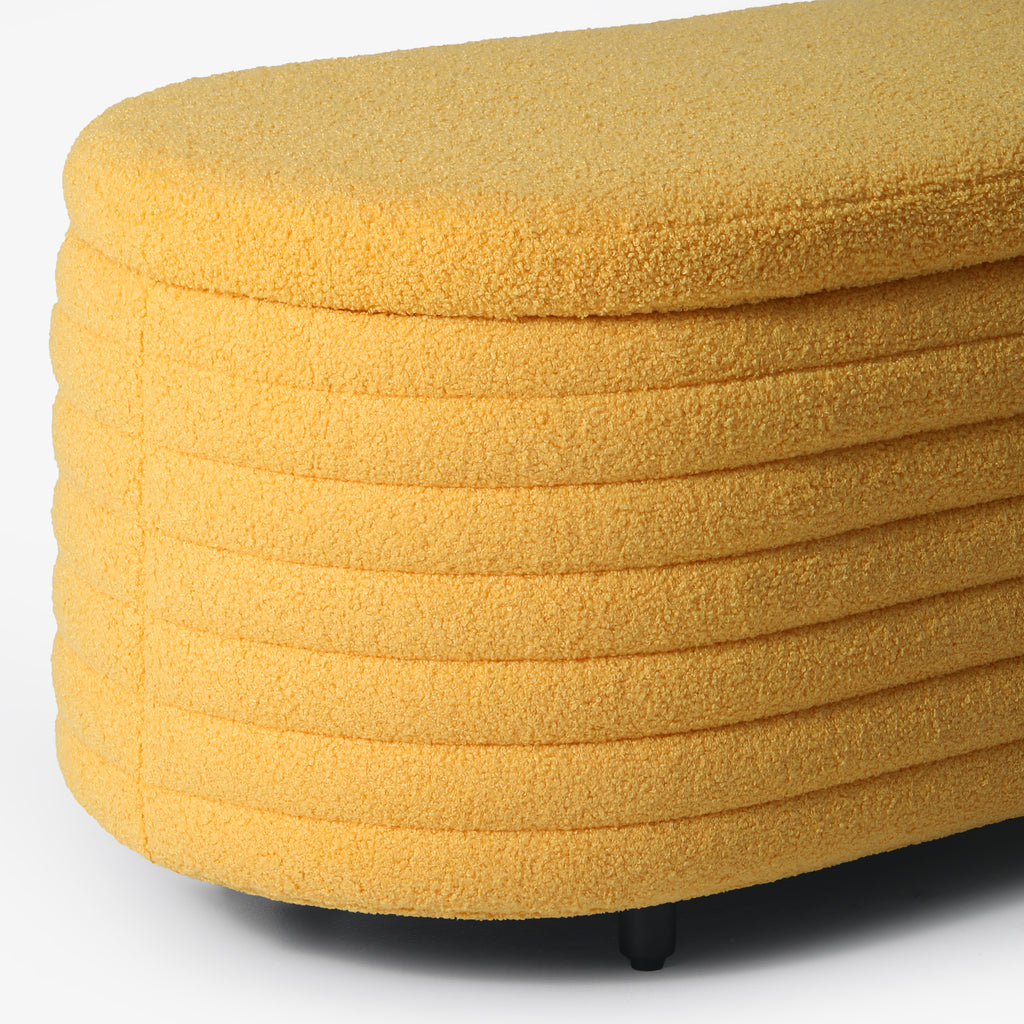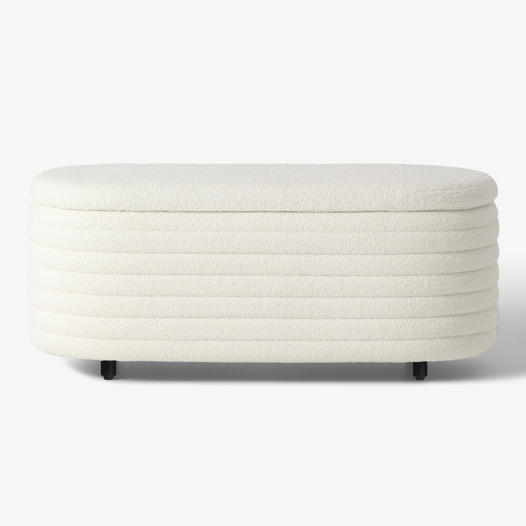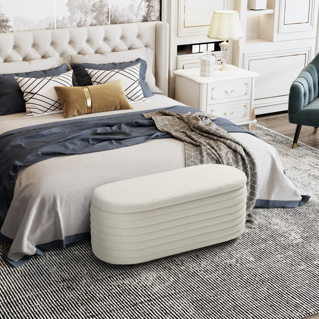 Revamp your home's organization effortlessly! this storage bench not only offers a comfy seat but also cleverly conceals clutter in your living room, bedroom, or even the kids' playroom. its chic oval shape and horizontal tufting bring a contemporary vibe to your space, while the soft polyester sherpa fabric adds a cozy modern touch. boasting a roomy 25.6-gallon capacity, it's perfect for stashing toys, throw pillows, or any extras. 42-inch-wide seat wrapped in a sherpa upholstery flaunts sleek tufted lines, blending style and functionality seamlessly. with various solid colors available, it effortlessly complements your room's modern décor. crafted with a sturdy wooden frame, this storage bench ensures durability, making it a stylish and practical storage solution for modern homes.