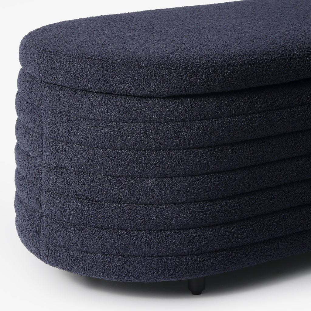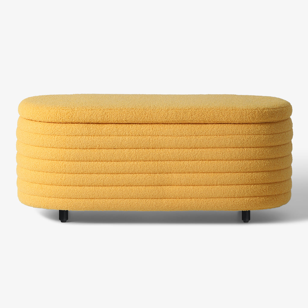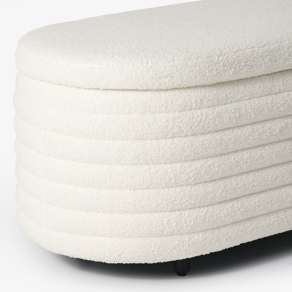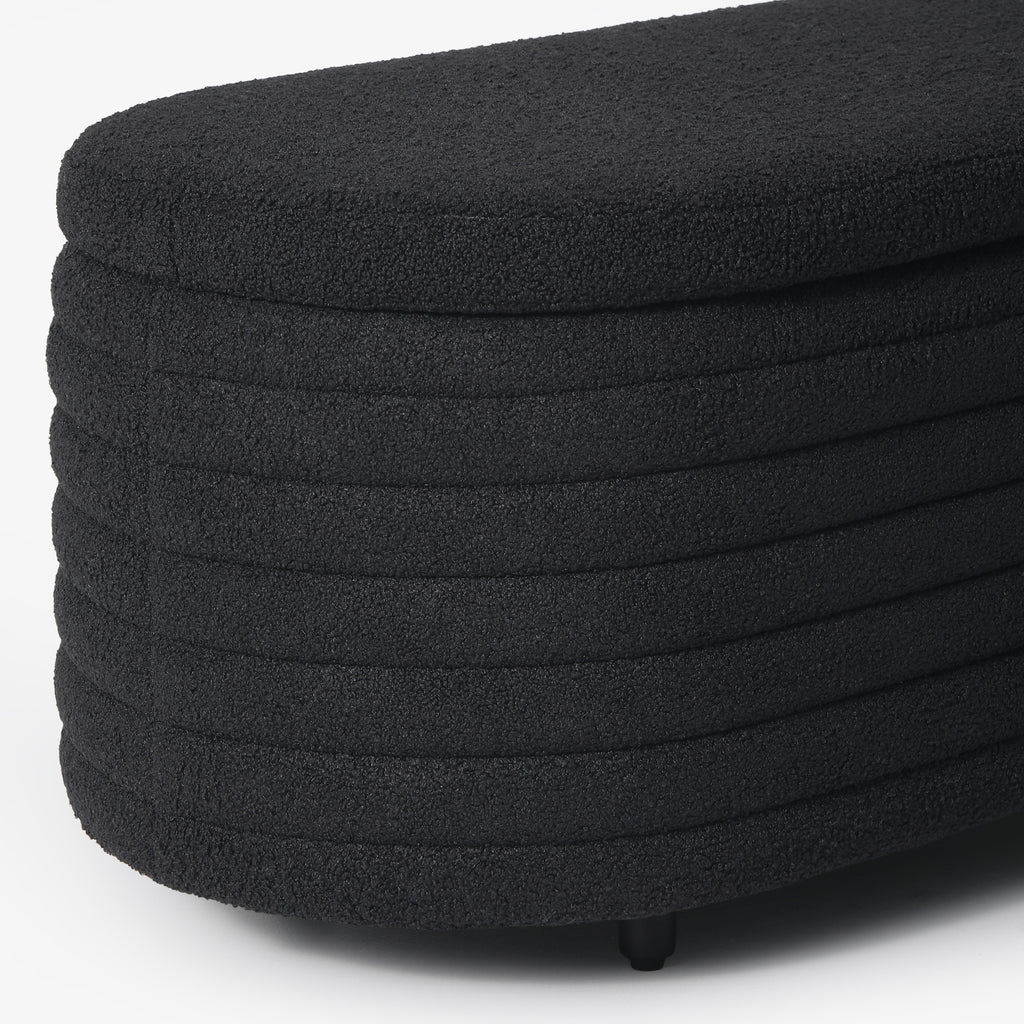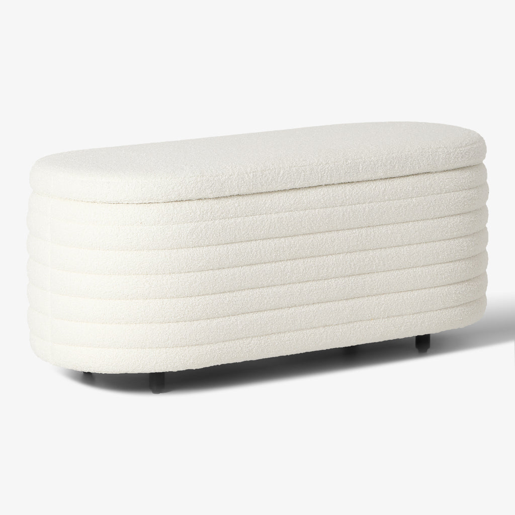 Revamp your home's organization effortlessly! this storage bench not only offers a comfy seat but also cleverly conceals clutter in your living room, bedroom, or even the kids' playroom. its chic oval shape and horizontal tufting bring a contemporary vibe to your space, while the soft polyester sherpa fabric adds a cozy modern touch. boasting a roomy 25.6-gallon capacity, it's perfect for stashing toys, throw pillows, or any extras. 42-inch-wide seat wrapped in a sherpa upholstery flaunts sleek tufted lines, blending style and functionality seamlessly. with various solid colors available, it effortlessly complements your room's modern décor. crafted with a sturdy wooden frame, this storage bench ensures durability, making it a stylish and practical storage solution for modern homes.
