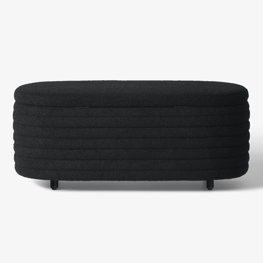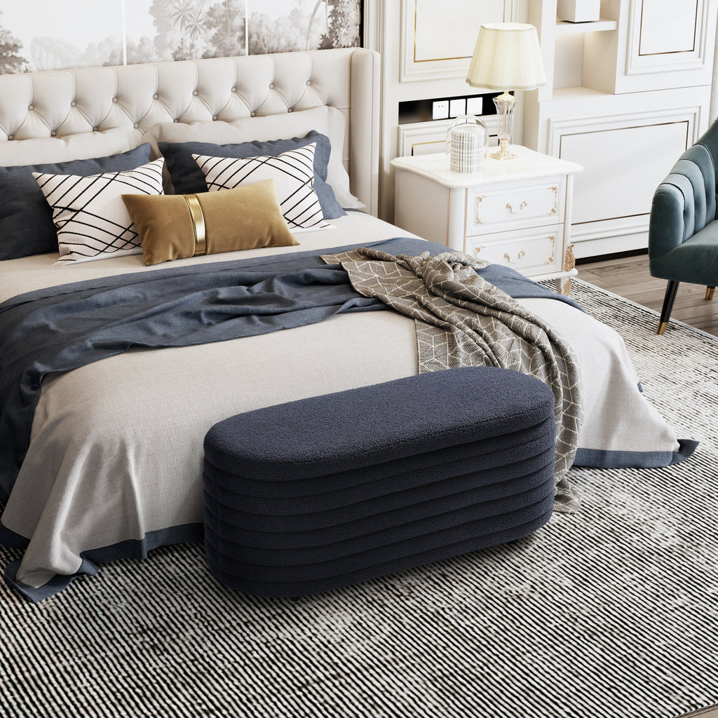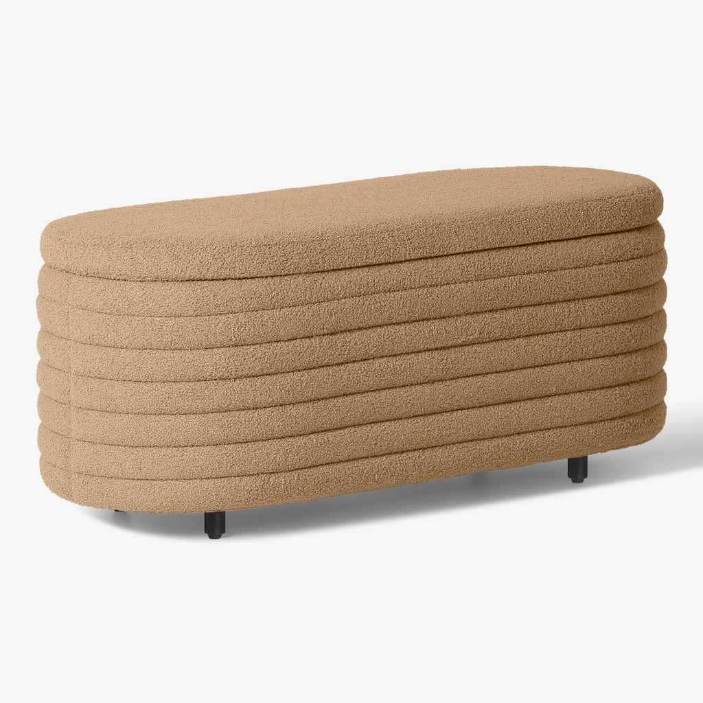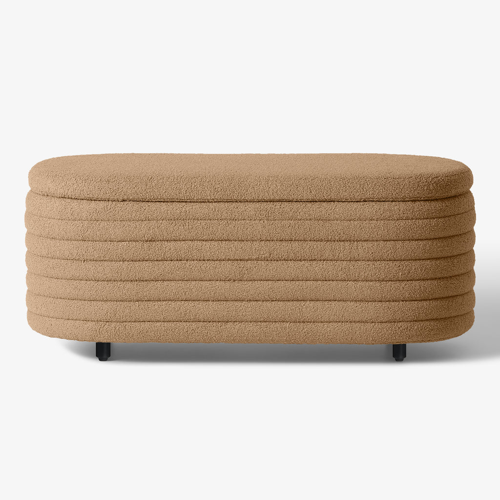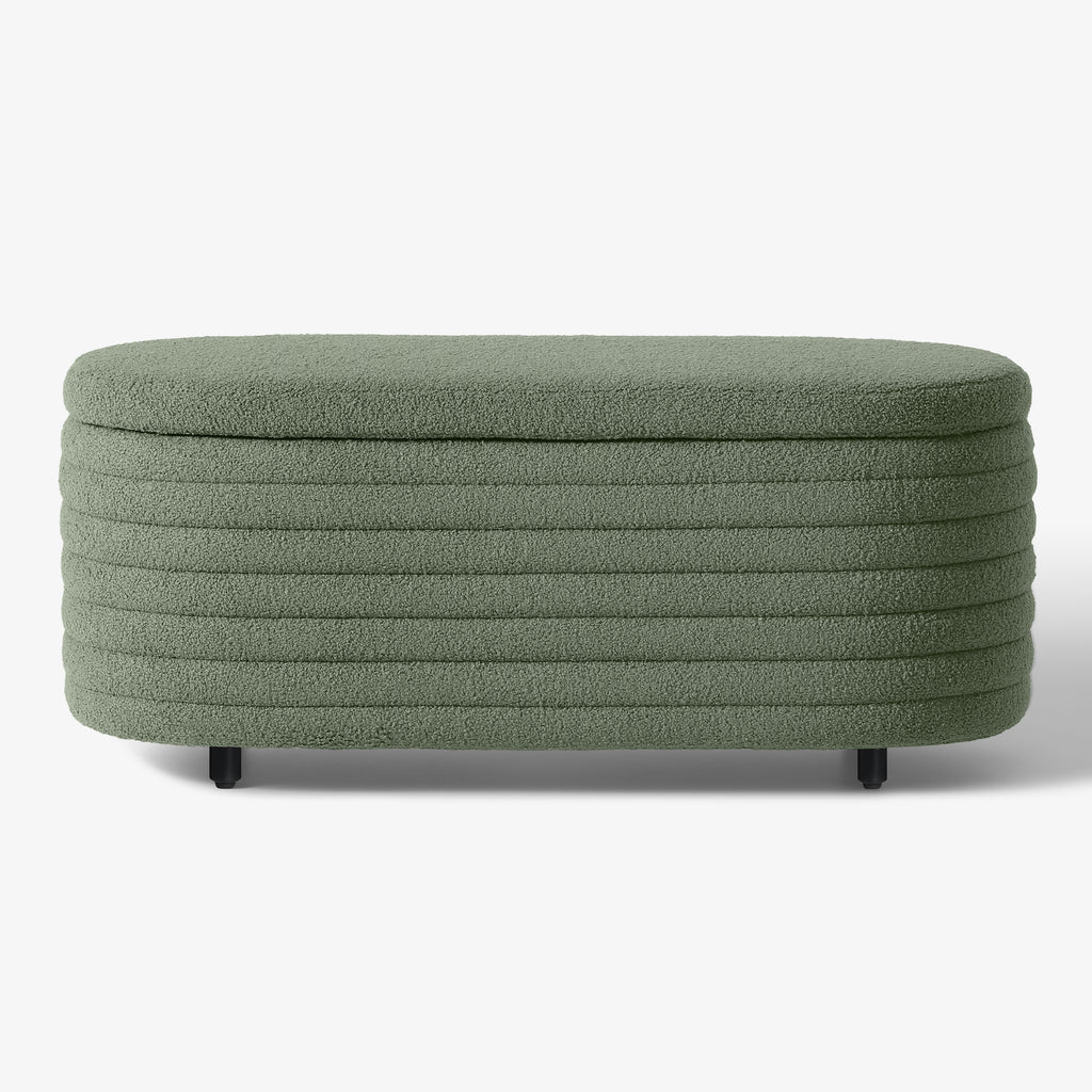 Revamp your home's organization effortlessly! this storage bench not only offers a comfy seat but also cleverly conceals clutter in your living room, bedroom, or even the kids' playroom. its chic oval shape and horizontal tufting bring a contemporary vibe to your space, while the soft polyester sherpa fabric adds a cozy modern touch. boasting a roomy 25.6-gallon capacity, it's perfect for stashing toys, throw pillows, or any extras. 42-inch-wide seat wrapped in a sherpa upholstery flaunts sleek tufted lines, blending style and functionality seamlessly. with various solid colors available, it effortlessly complements your room's modern décor. crafted with a sturdy wooden frame, this storage bench ensures durability, making it a stylish and practical storage solution for modern homes.