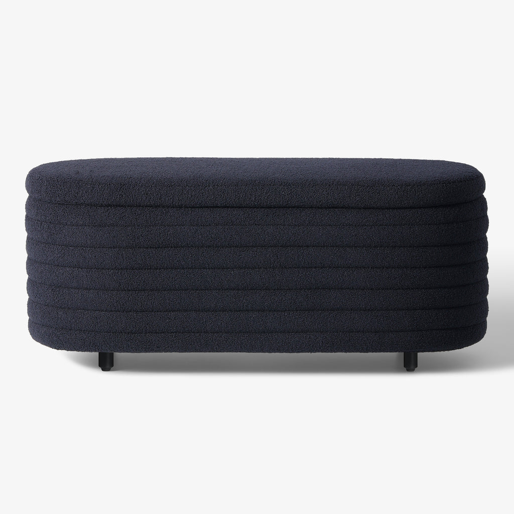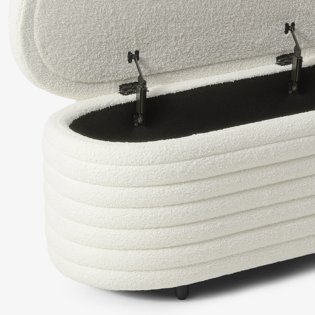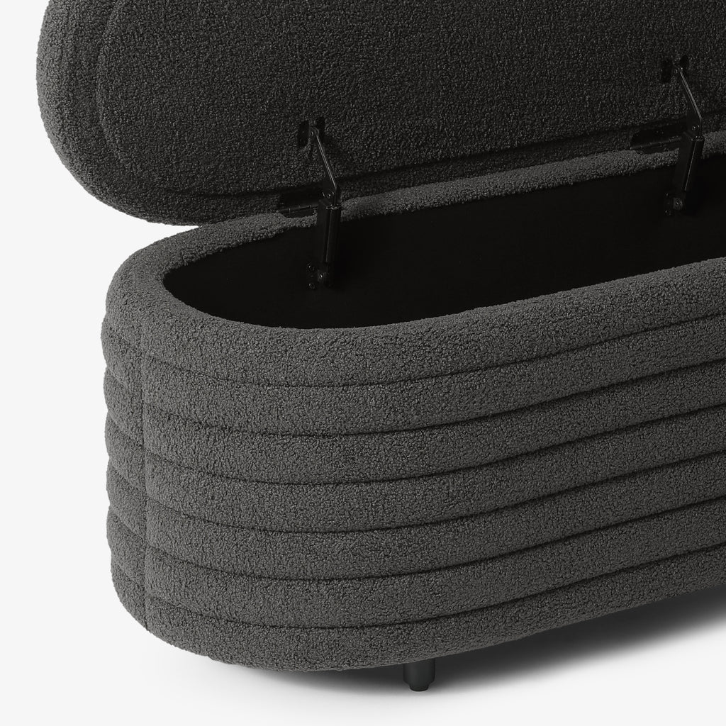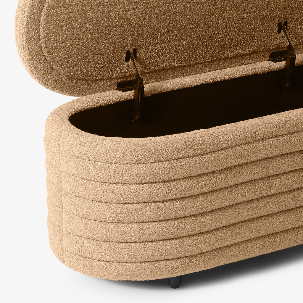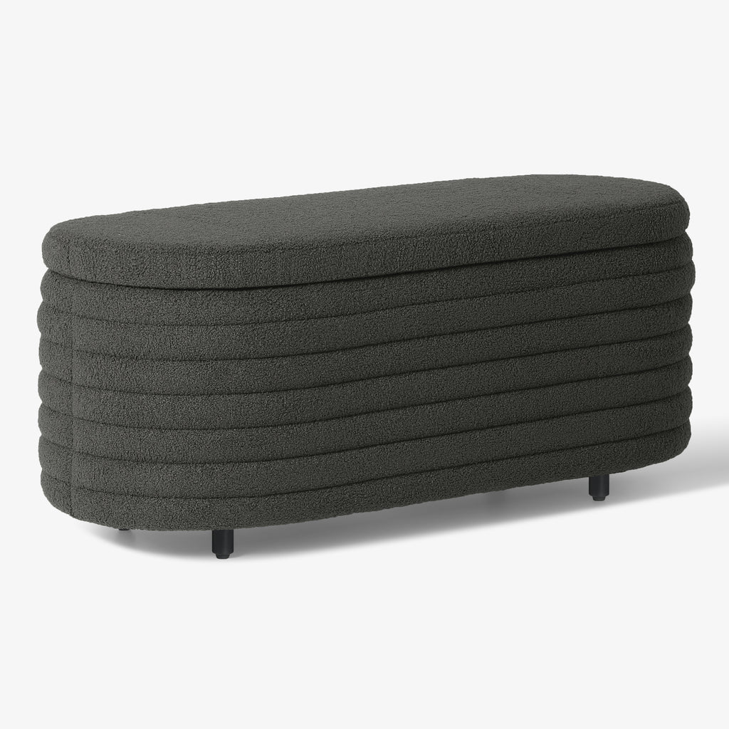 Revamp your home's organization effortlessly! this storage bench not only offers a comfy seat but also cleverly conceals clutter in your living room, bedroom, or even the kids' playroom. its chic oval shape and horizontal tufting bring a contemporary vibe to your space, while the soft polyester sherpa fabric adds a cozy modern touch. boasting a roomy 25.6-gallon capacity, it's perfect for stashing toys, throw pillows, or any extras. 42-inch-wide seat wrapped in a sherpa upholstery flaunts sleek tufted lines, blending style and functionality seamlessly. with various solid colors available, it effortlessly complements your room's modern décor. crafted with a sturdy wooden frame, this storage bench ensures durability, making it a stylish and practical storage solution for modern homes.