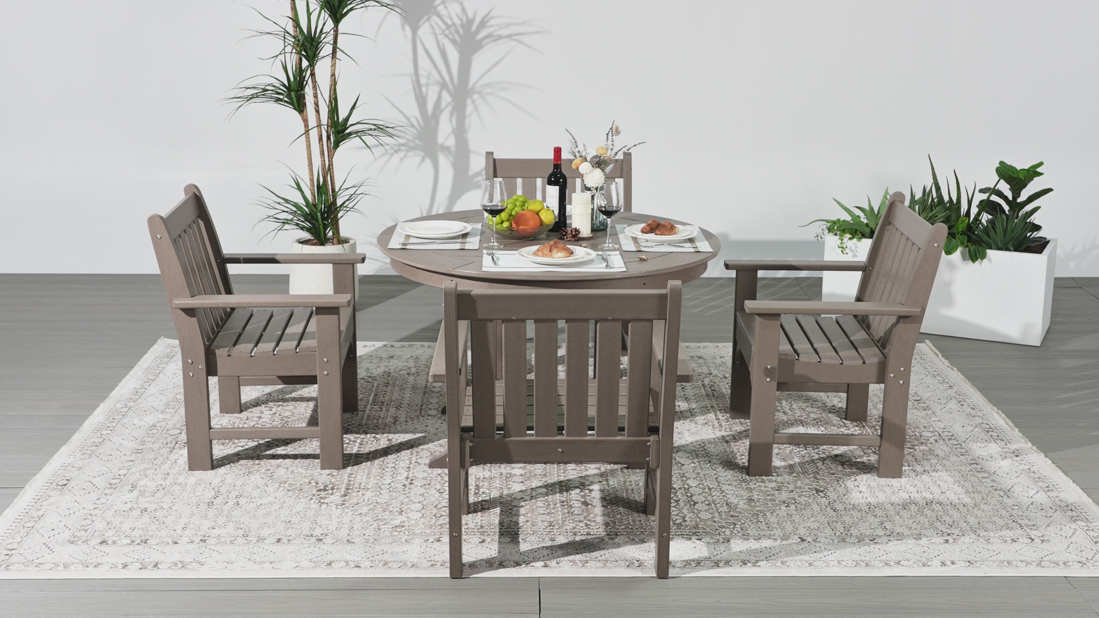 The perfect dining set for 4 that will add charm and comfort to your outdoor patio this season. Made with a durable HDPE material that is UV and fade resistant to the outdoors and will keep that charming color season-long. All-weather material is perfect to resist the strong outdoor elements and won't crack or splinter unlike other materials. Sit in comfort with the garden dining chairs that have contoured seats to relieve tension and make for a more comfortable seat and tied with the spacious 47" inch round dining table this will make the for the perfect outdoor dining patio set.