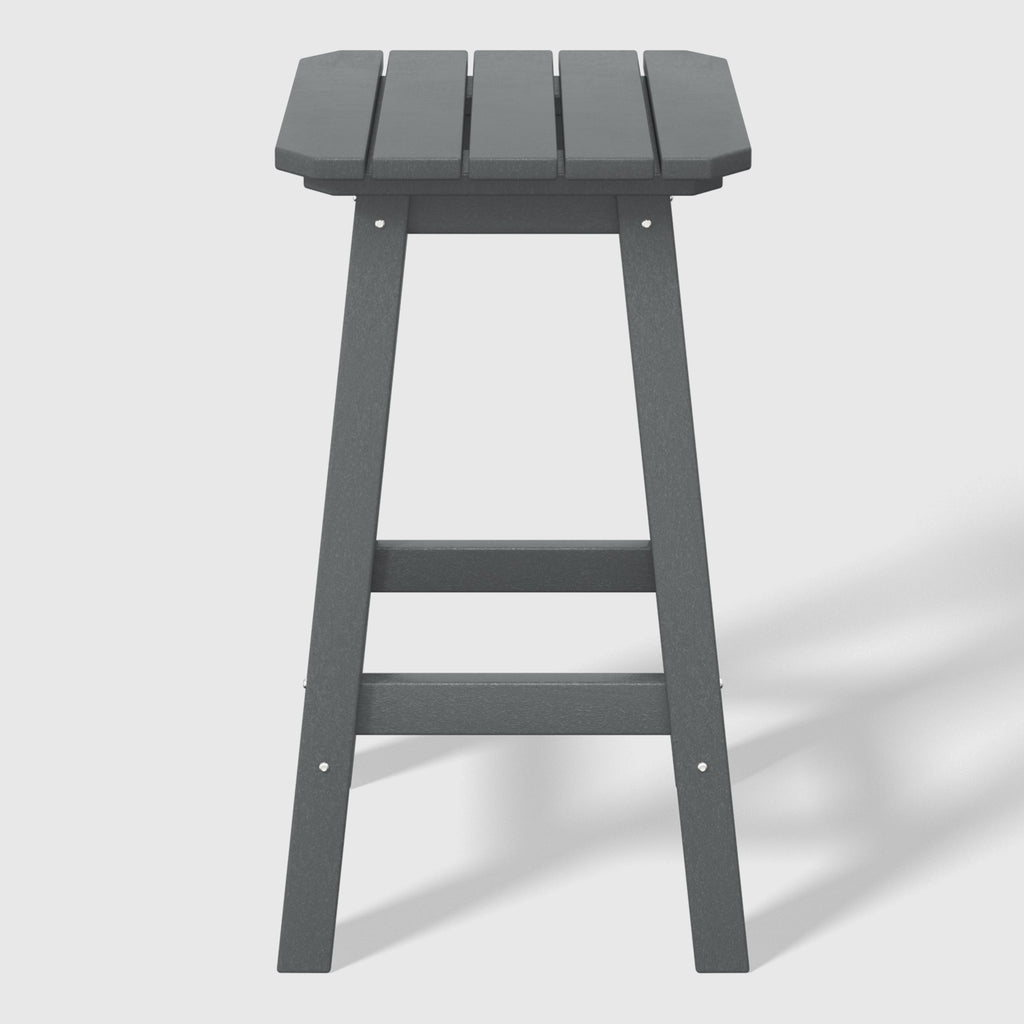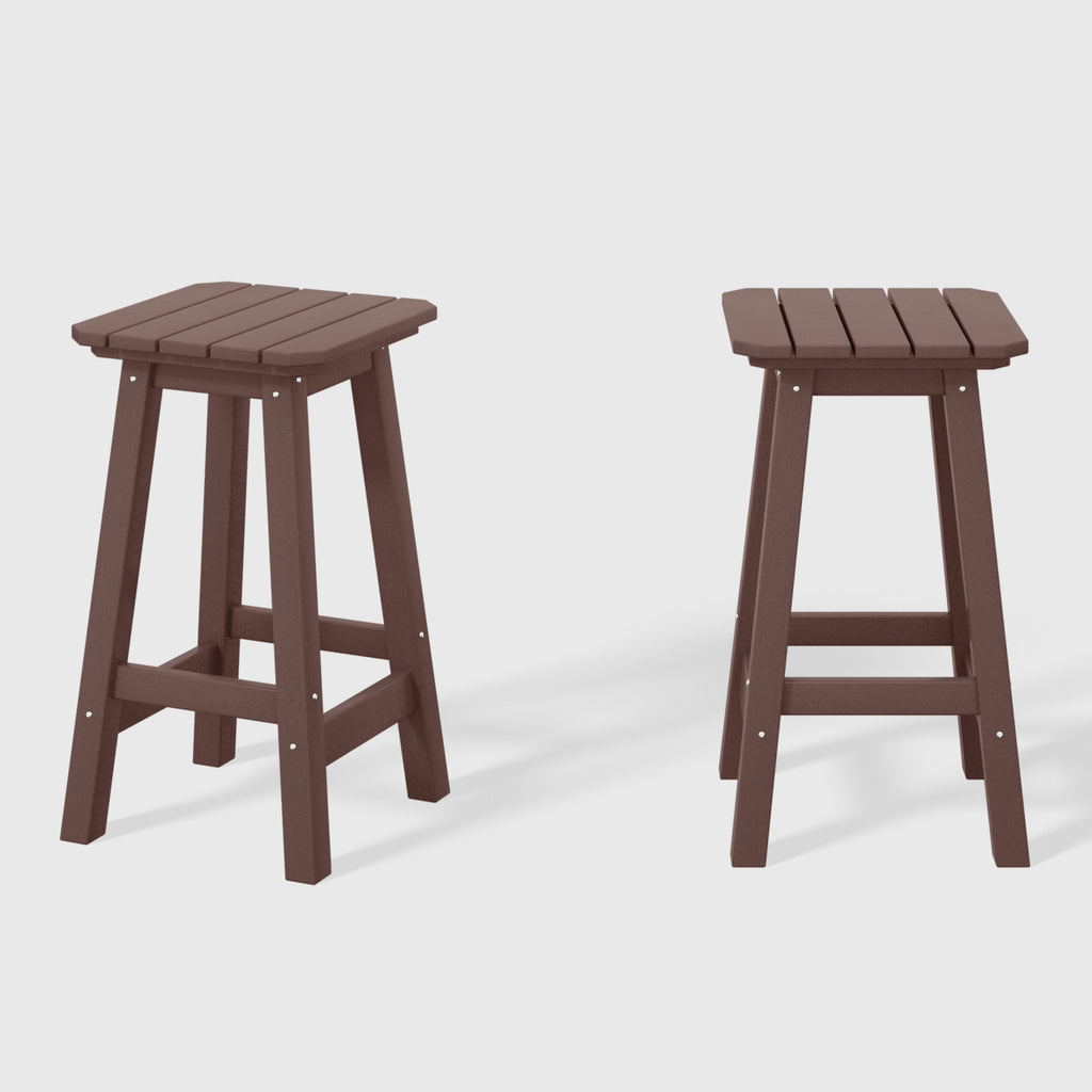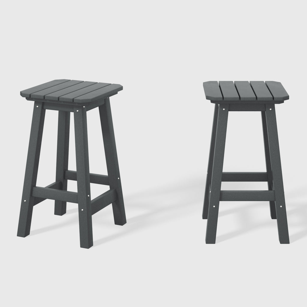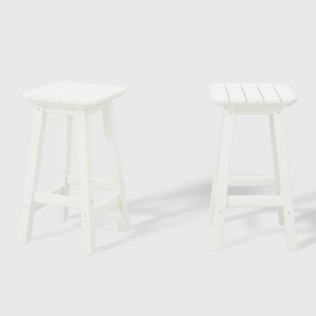 These Two 24" counter-high square-seat bar stools presents a sophisticated addition to your outdoor patio, ideally suited for placement around your outdoor patio bar or bistro table. crafted from durable and recycled HDPE material, its design is tailored for outdoor use, boasting UV and weather-resistant properties that safeguard the stool. available in a palette of fade-resistant solid colors, it ensures the enduring vibrancy of its charming hue each season. backless design makes for seamless storage underneath the table, offering both versatility and elegance. classic yet modern aesthetic effortlessly harmonizes with your existing decor, while the A-frame design, supported by four sturdy square legs and foot bars, provides a well-balanced and comfortable seating experience.