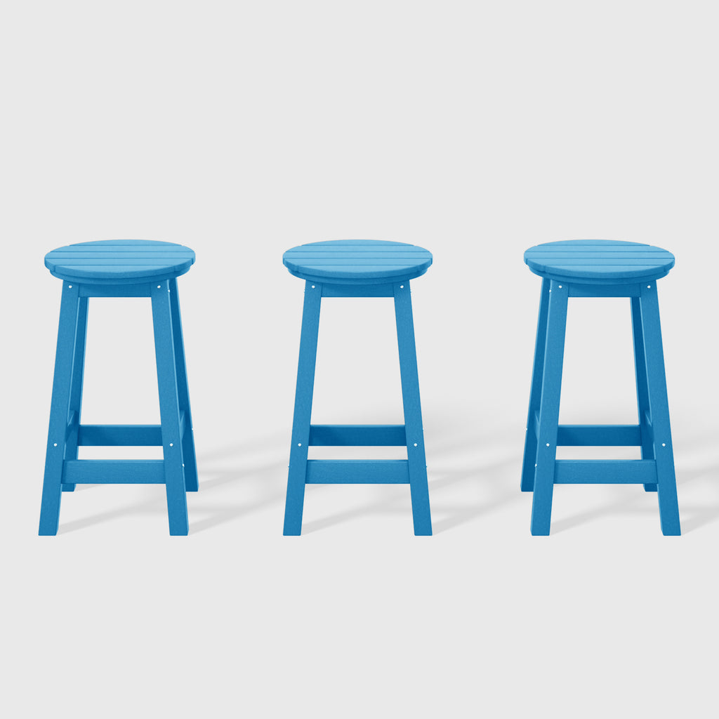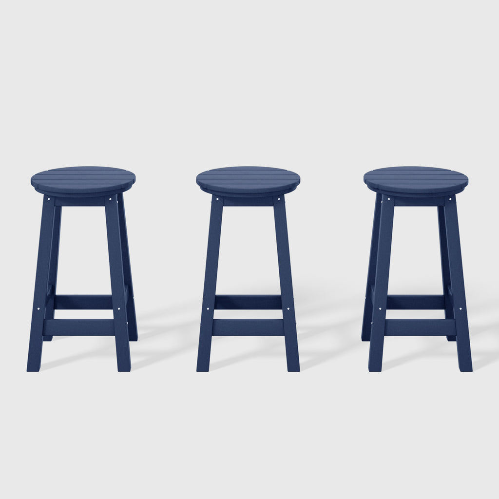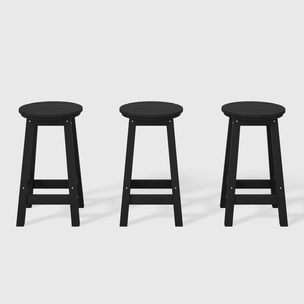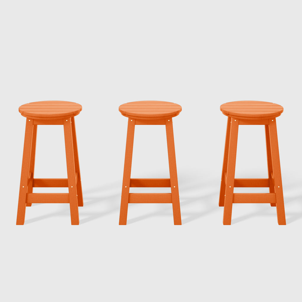 This set of three 24" counter-height round-seat bar stools presents a sophisticated addition to your outdoor patio, ideally suited for placement around your outdoor patio bar or bistro table. crafted from durable and recycled HDPE material, its design is tailored for outdoor use, boasting UV and weather-resistant properties that safeguard the stool. Available in a palette of fade-resistant solid colors ensures the enduring vibrancy of its charming color each season. backless design makes for seamless storage underneath the table, offering both versatility and elegance. classic yet modern aesthetic effortlessly harmonizes with your existing decor, while the A-frame design, supported by four sturdy square legs and foot bars, provides a well-balanced and comfortable seating experience.