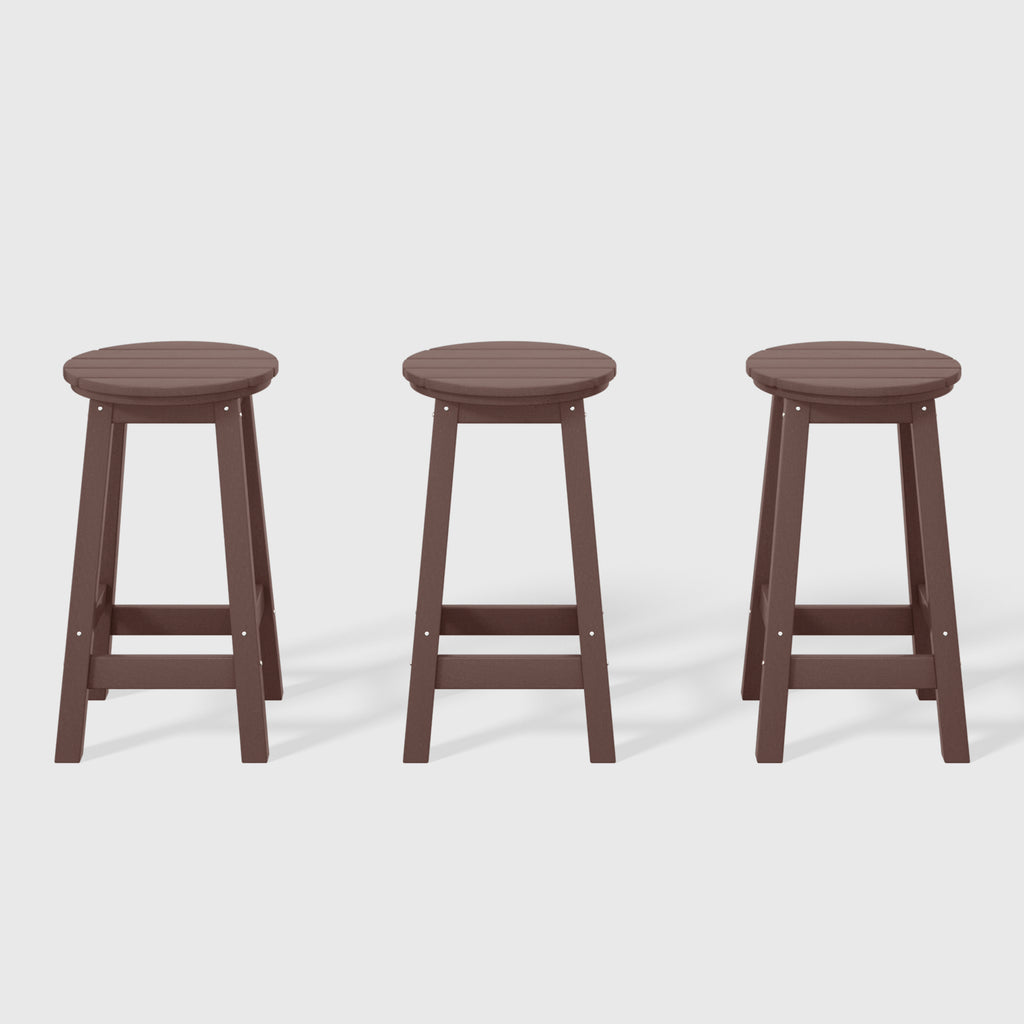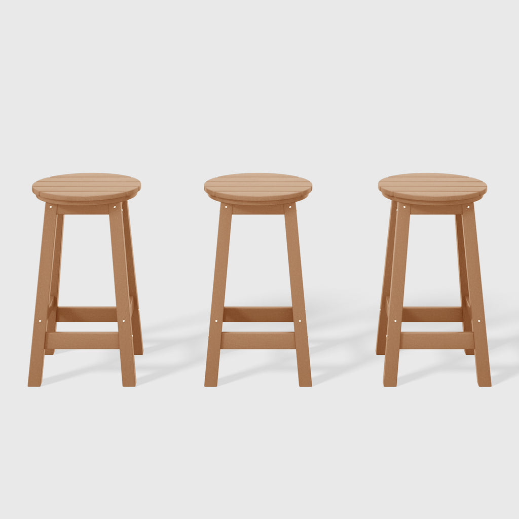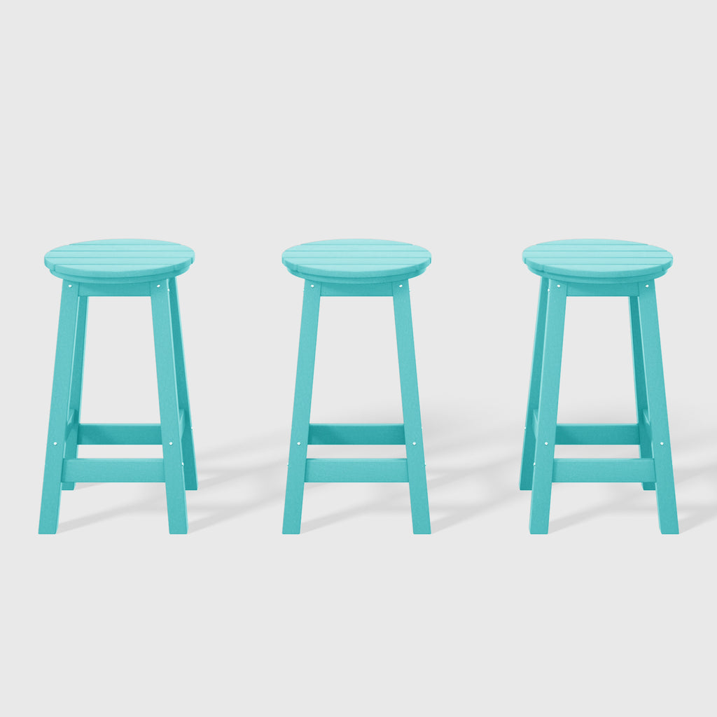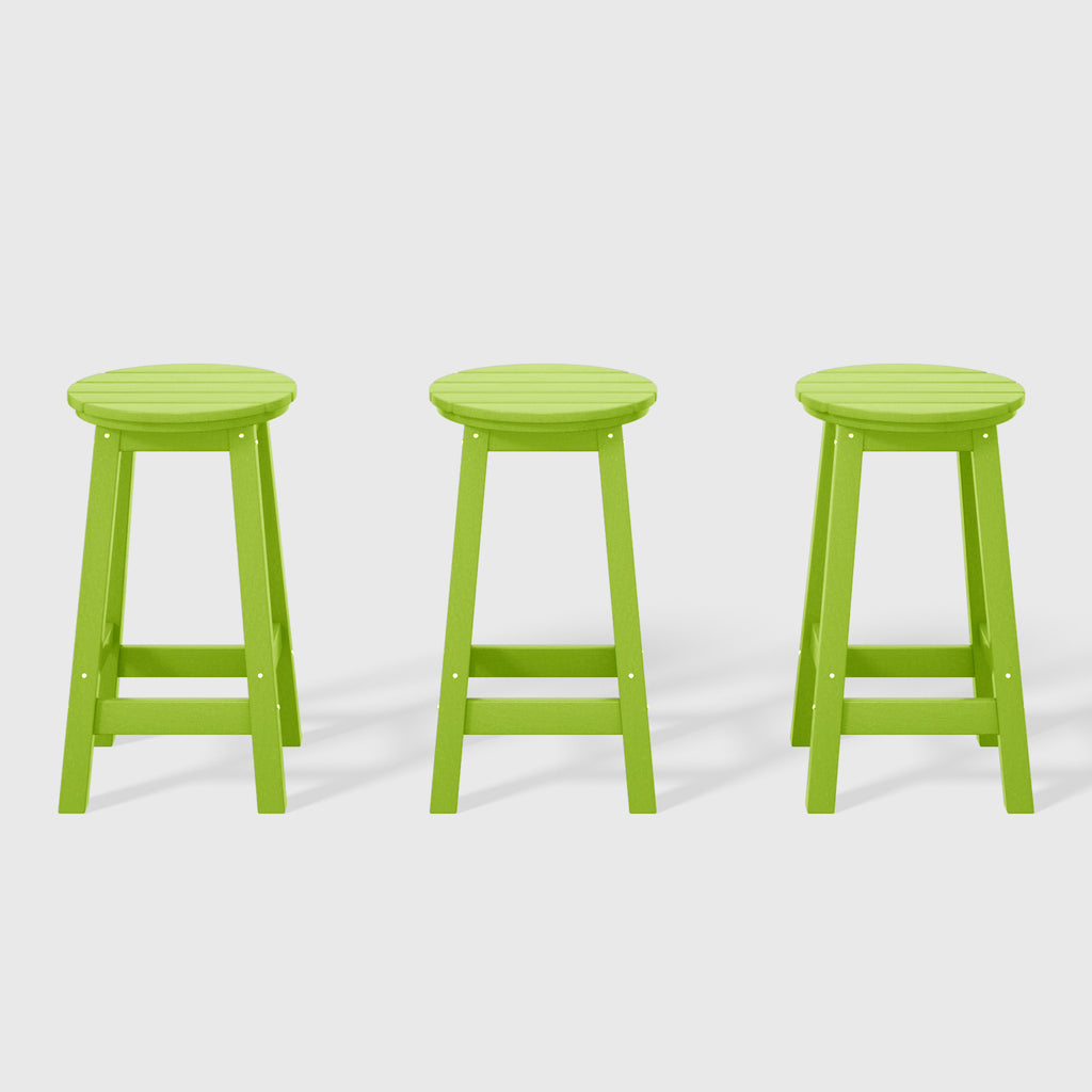 This set of three 24" counter-height round-seat bar stools presents a sophisticated addition to your outdoor patio, ideally suited for placement around your outdoor patio bar or bistro table. crafted from durable and recycled HDPE material, its design is tailored for outdoor use, boasting UV and weather-resistant properties that safeguard the stool. Available in a palette of fade-resistant solid colors ensures the enduring vibrancy of its charming color each season. backless design makes for seamless storage underneath the table, offering both versatility and elegance. classic yet modern aesthetic effortlessly harmonizes with your existing decor, while the A-frame design, supported by four sturdy square legs and foot bars, provides a well-balanced and comfortable seating experience.