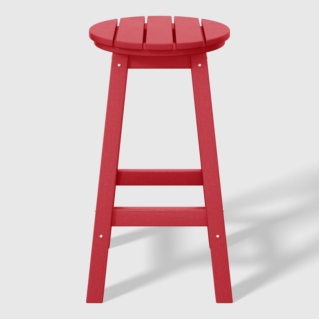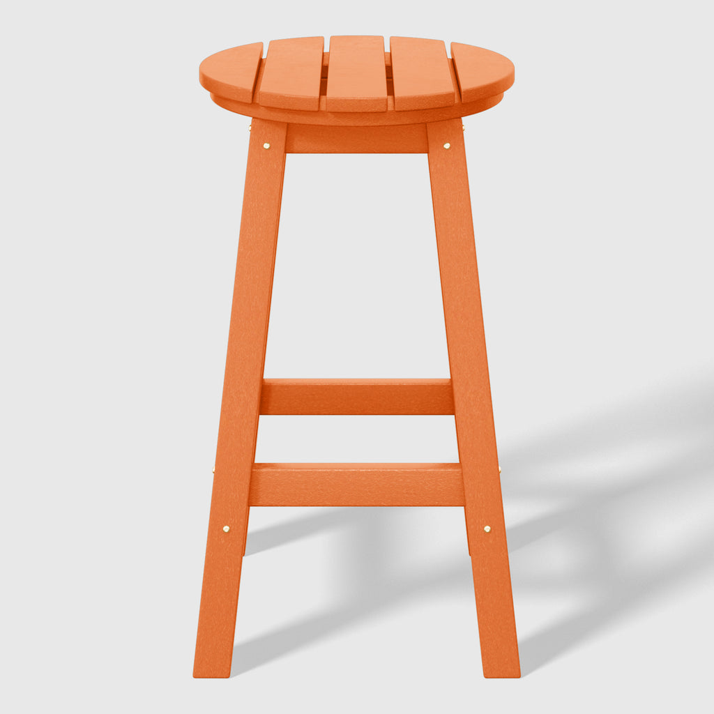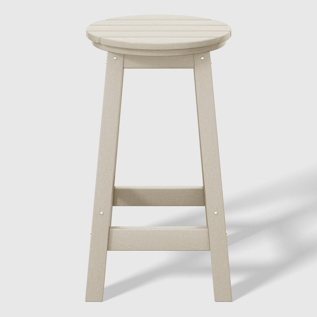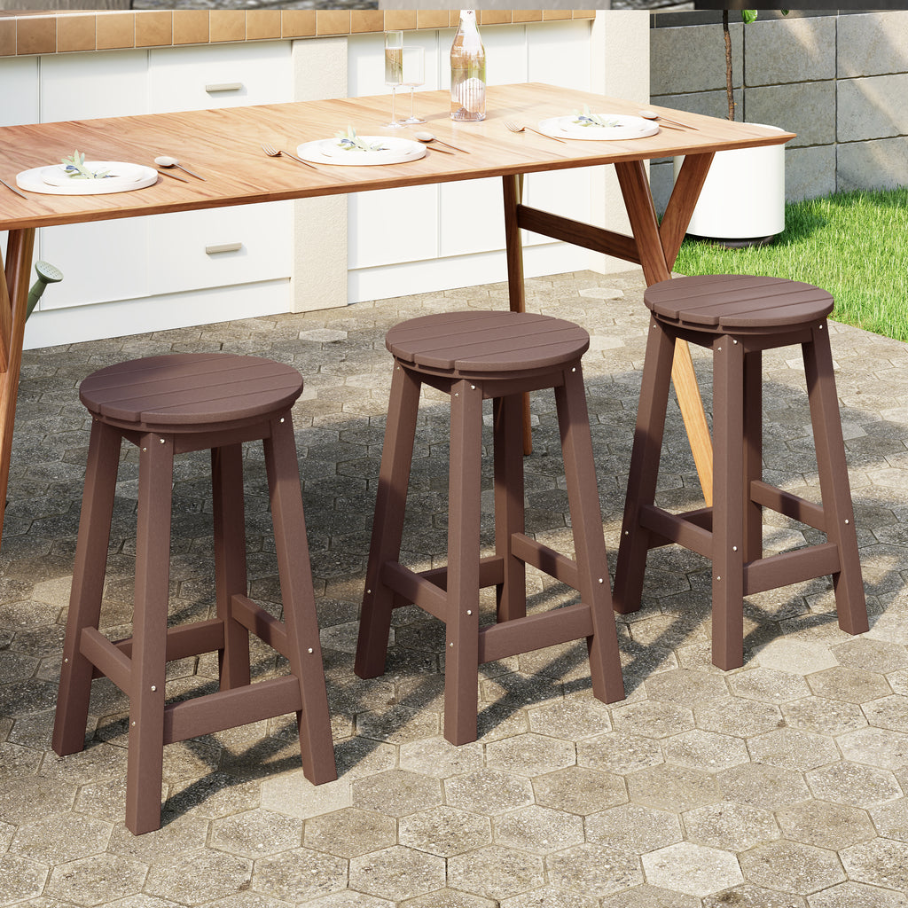 This set of three 24" counter-height round-seat bar stools presents a sophisticated addition to your outdoor patio, ideally suited for placement around your outdoor patio bar or bistro table. crafted from durable and recycled HDPE material, its design is tailored for outdoor use, boasting UV and weather-resistant properties that safeguard the stool. Available in a palette of fade-resistant solid colors ensures the enduring vibrancy of its charming color each season. backless design makes for seamless storage underneath the table, offering both versatility and elegance. classic yet modern aesthetic effortlessly harmonizes with your existing decor, while the A-frame design, supported by four sturdy square legs and foot bars, provides a well-balanced and comfortable seating experience.