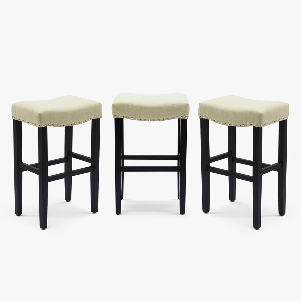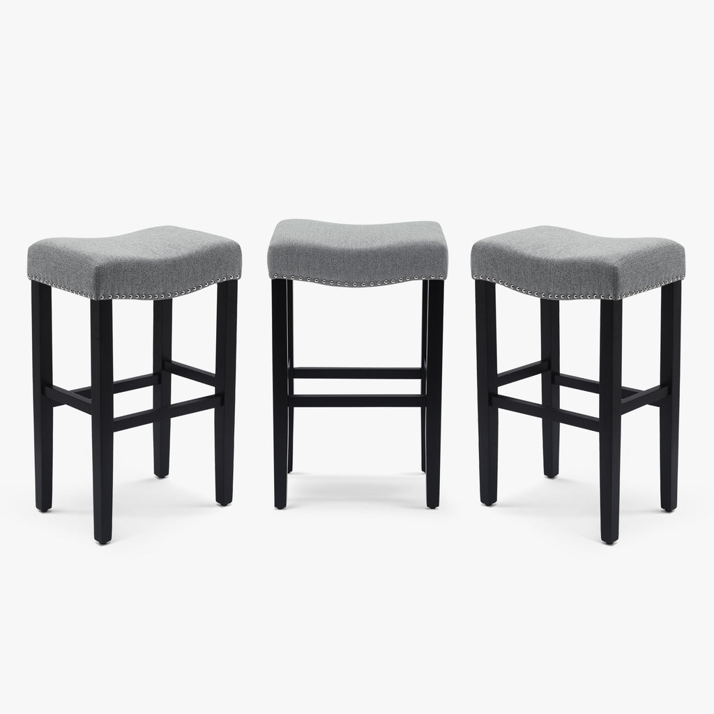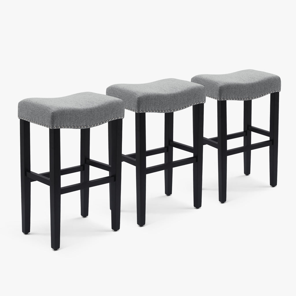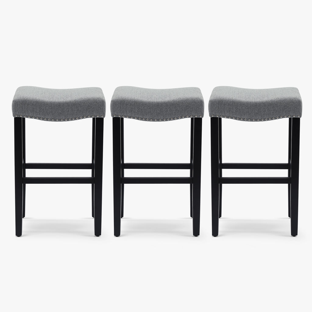 Enjoy a refreshing update to your home bar with this modern farmhouse 29" bar stool. The saddle-style seat delivers stylish comfort for your kitchen or bar area. Boasting a backless design and a convenient footrest for added comfort. Upholstered seat with a foam-filled cushioning and a subtle silver nail head trim detailing for a modern touch on a traditional silhouette.