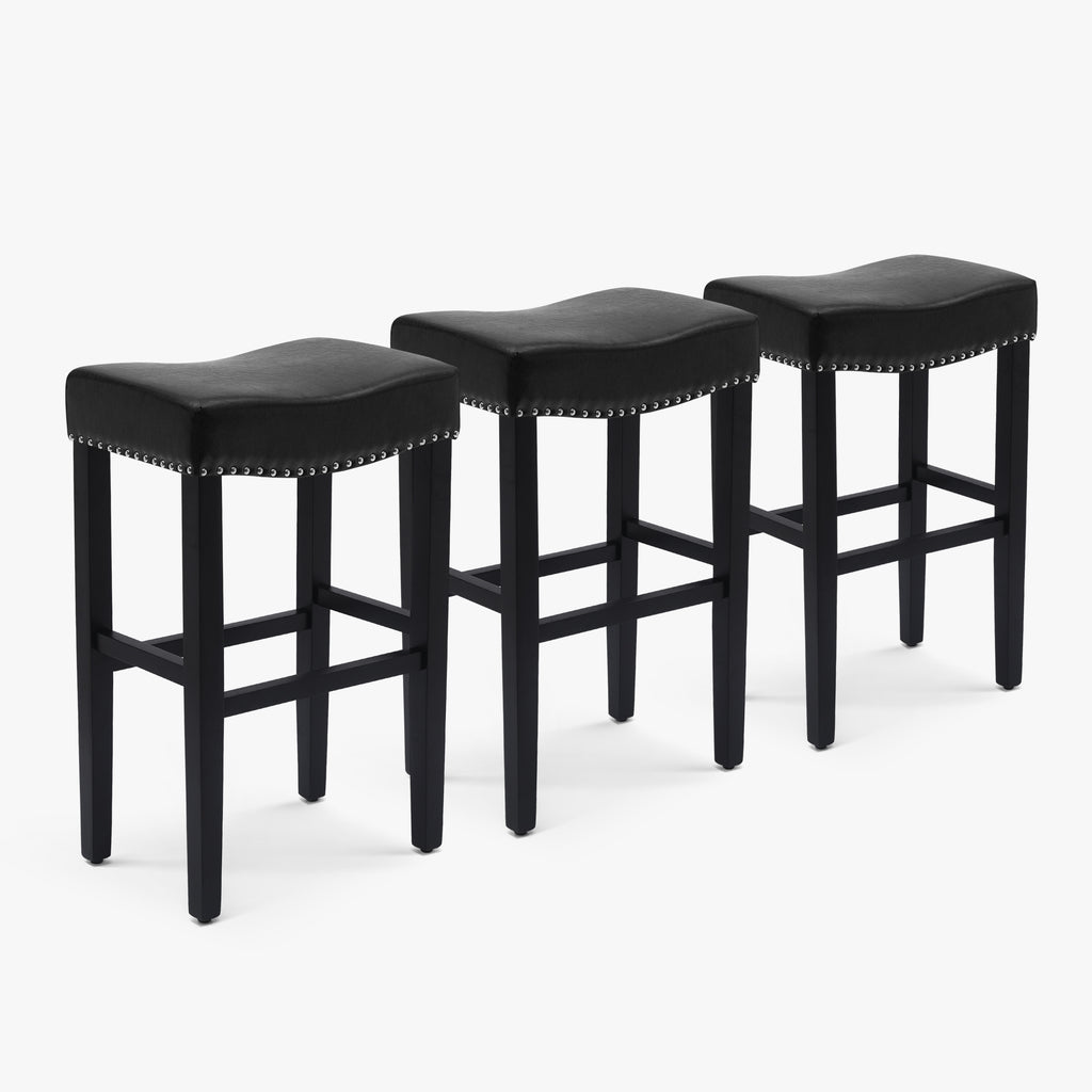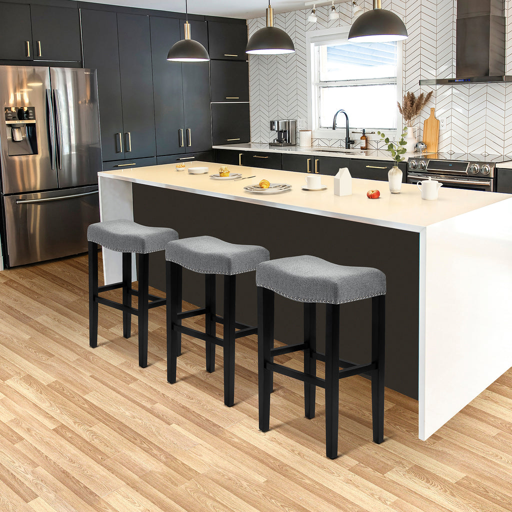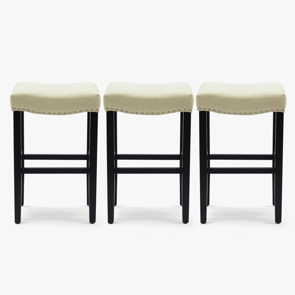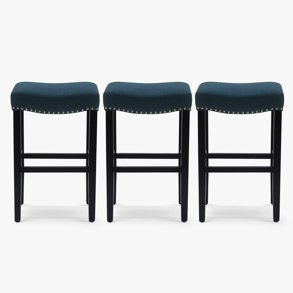 Enjoy a refreshing update to your home bar with this modern farmhouse 29" bar stool. The saddle-style seat delivers stylish comfort for your kitchen or bar area. Boasting a backless design and a convenient footrest for added comfort. Upholstered seat with a foam-filled cushioning and a subtle silver nail head trim detailing for a modern touch on a traditional silhouette.