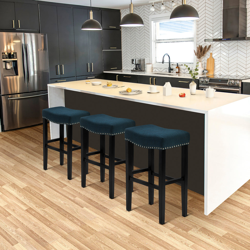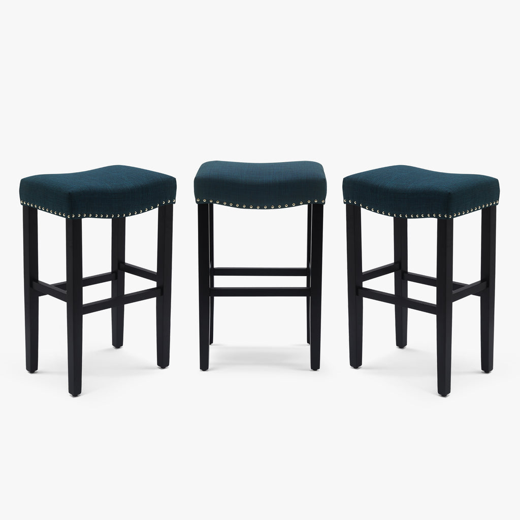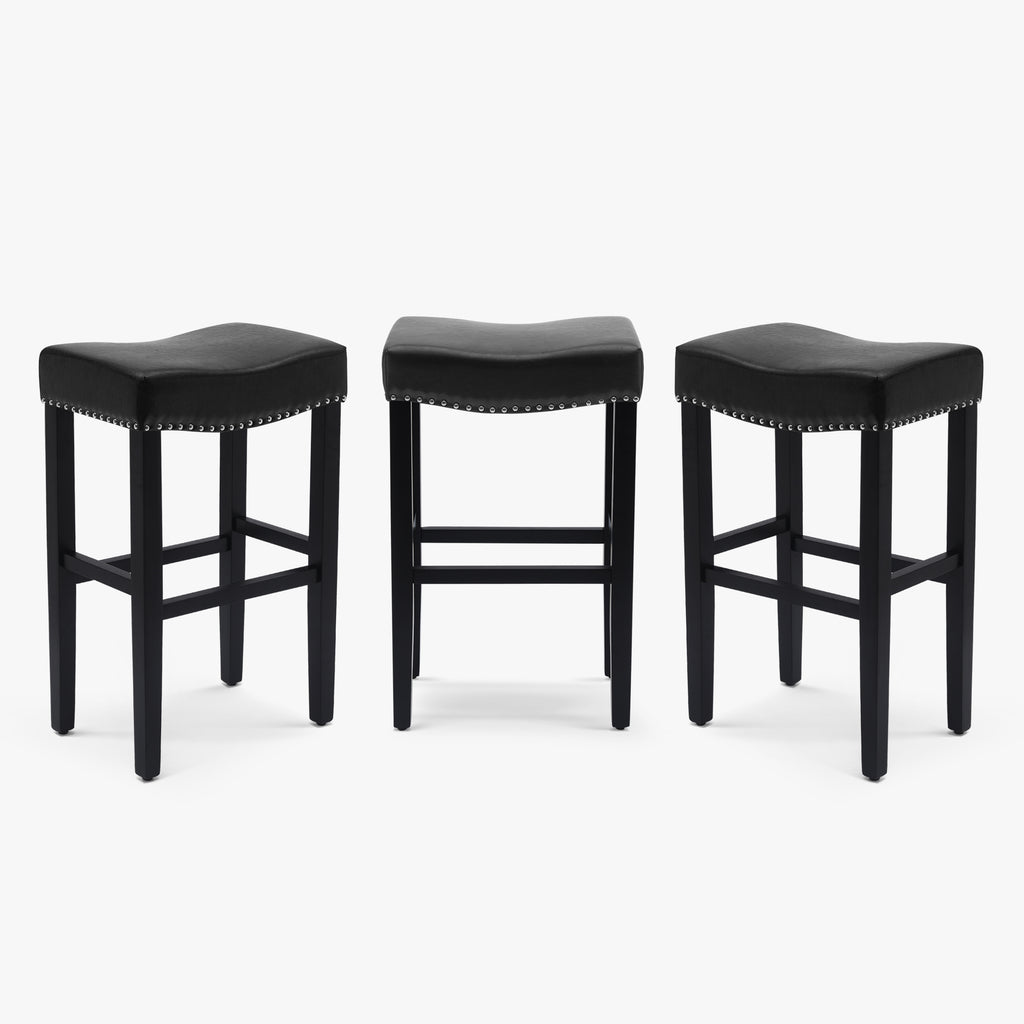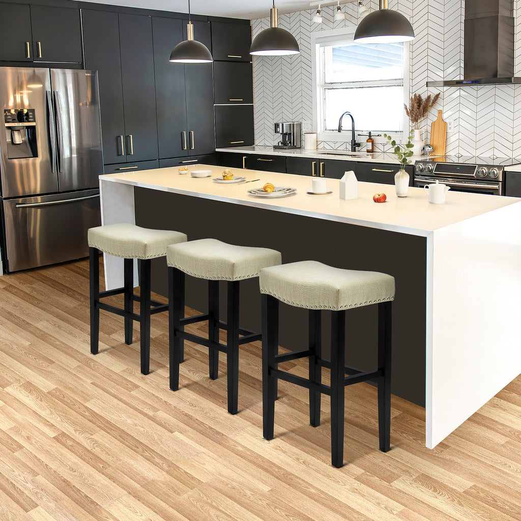 Enjoy a refreshing update to your home bar with this modern farmhouse 29" bar stool. The saddle-style seat delivers stylish comfort for your kitchen or bar area. Boasting a backless design and a convenient footrest for added comfort. Upholstered seat with a foam-filled cushioning and a subtle silver nail head trim detailing for a modern touch on a traditional silhouette.