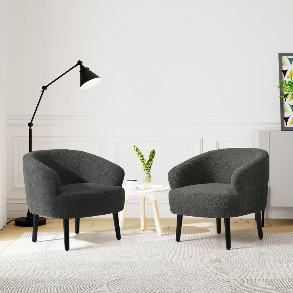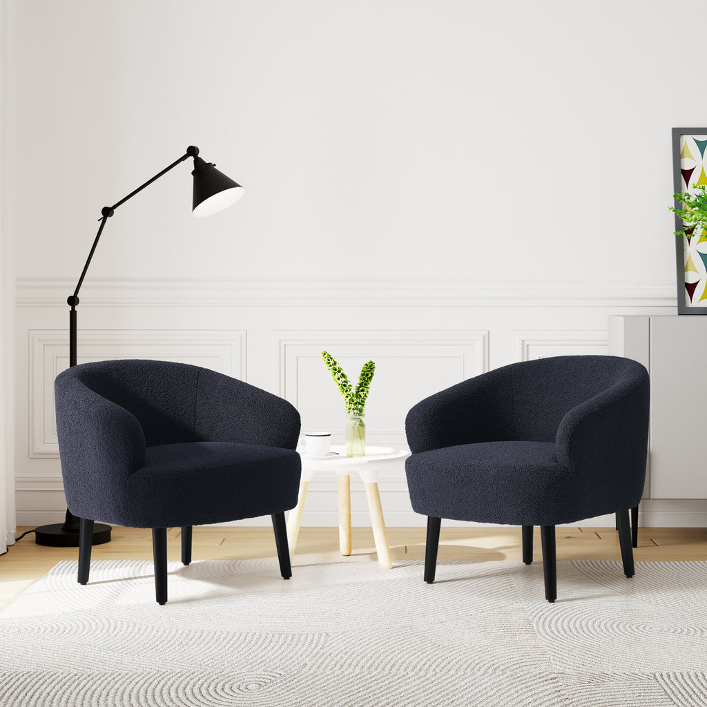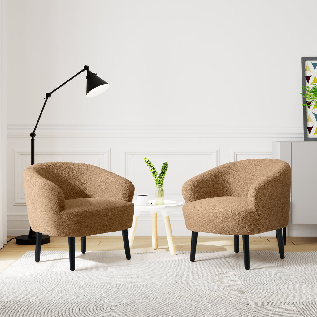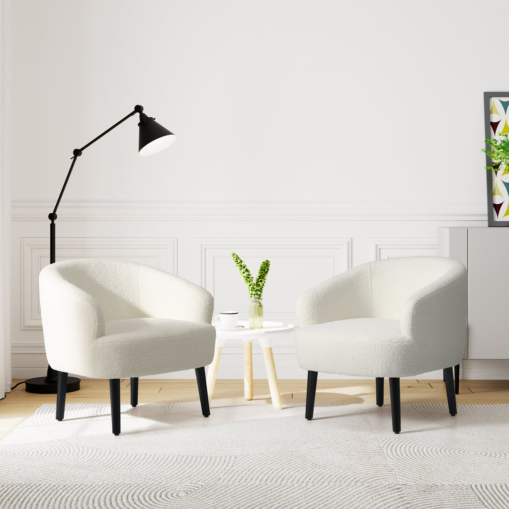 Indulge in the timeless elegance and supreme comfort of our Set of Two Mid-Century Sherpa Barrel Club Chair. drawing inspiration from the iconic designs of the mid-century era, this chair boasts a unique barrel-shaped silhouette that offers both sturdy support and unparalleled relaxation. wrapped in luxuriously soft Sherpa fabric, also known as teddy fabric, it provides a tactile experience like no other, inviting you to sink into its plush embrace. whether as a striking focal point or a cozy addition to your space, this chair seamlessly blends into any modern or eclectic interior, elevating the ambiance with its timeless charm and unmatched comfort. crafted with meticulous attention to detail, our Mid-Century Sherpa Barrel Accent Chair is a testament to exceptional design that promises to captivate and delight for years to come.