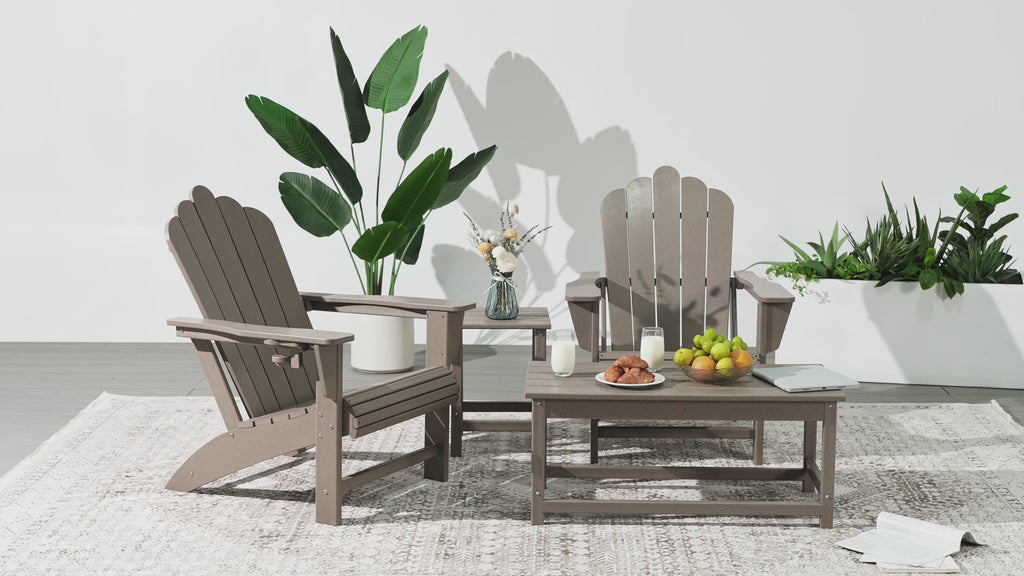 - Set Includes: Two (2) Adirondack Chairs with Cup Holders, One (1) Patio Coffee Table, and One (1) Patio Side Table