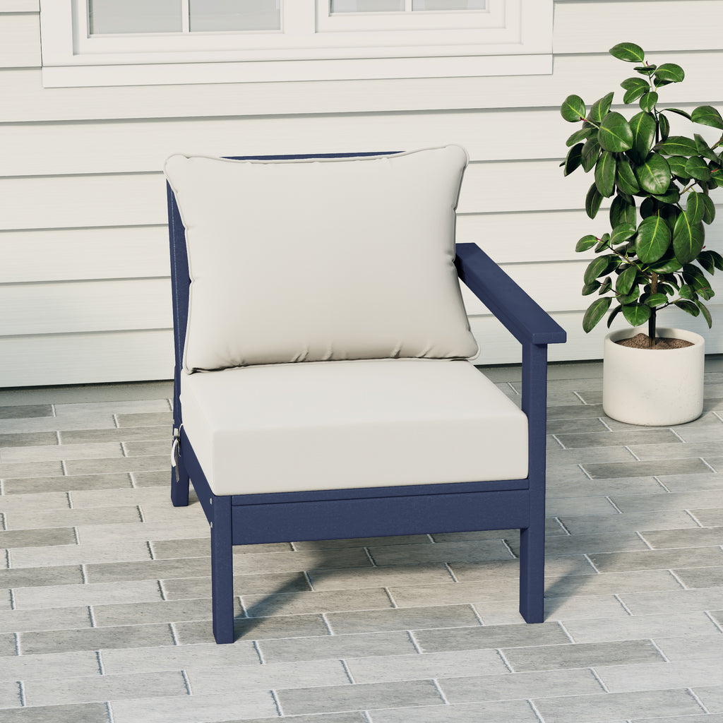 Relax by the poolside or on your patio under the stars with our charming Outdoor Patio HDPE Sectional Right Armchair. Lounge back in bliss with the deep inclined seat rest and the reclined backrest that offers a relaxing design. Our outdoor club chair is a perfect blend of comfort and design with durable and thick HDPE material that ensures a stable design combined with our deep seating patio cushions making for a relaxing sectional chair. Turn your backyard into an oasis with this patio sofa chair this season.