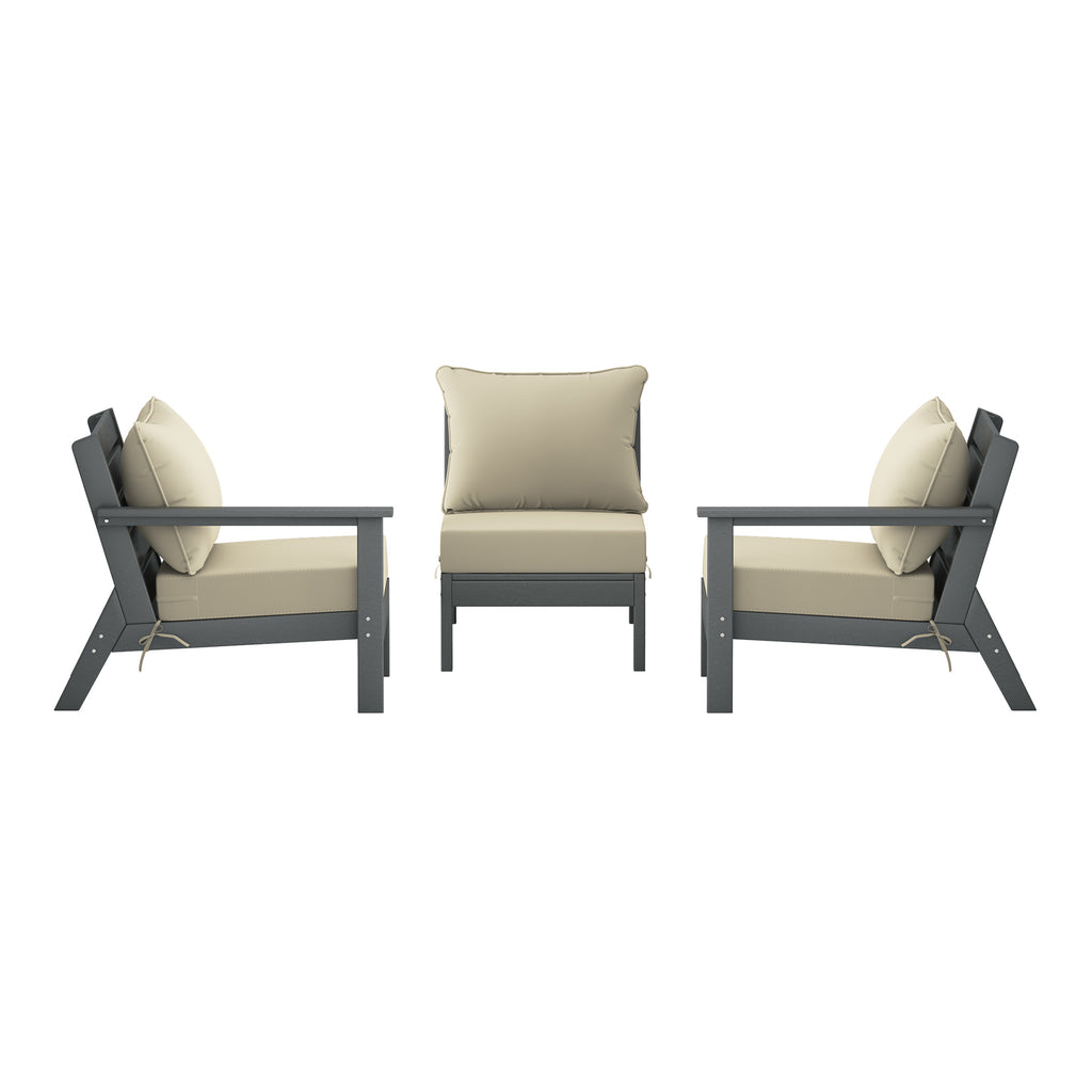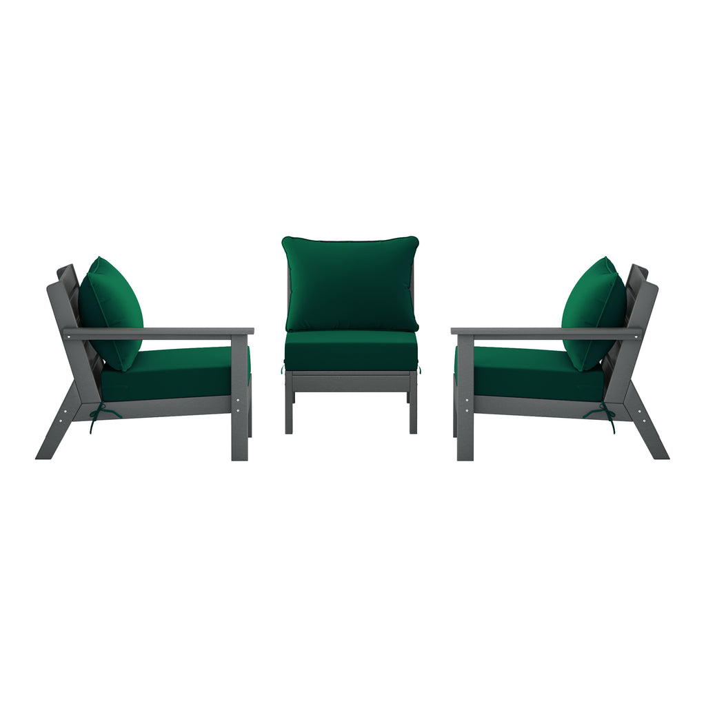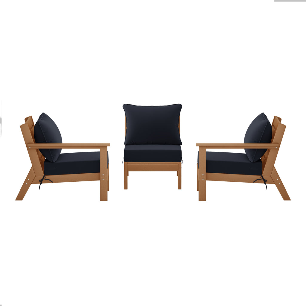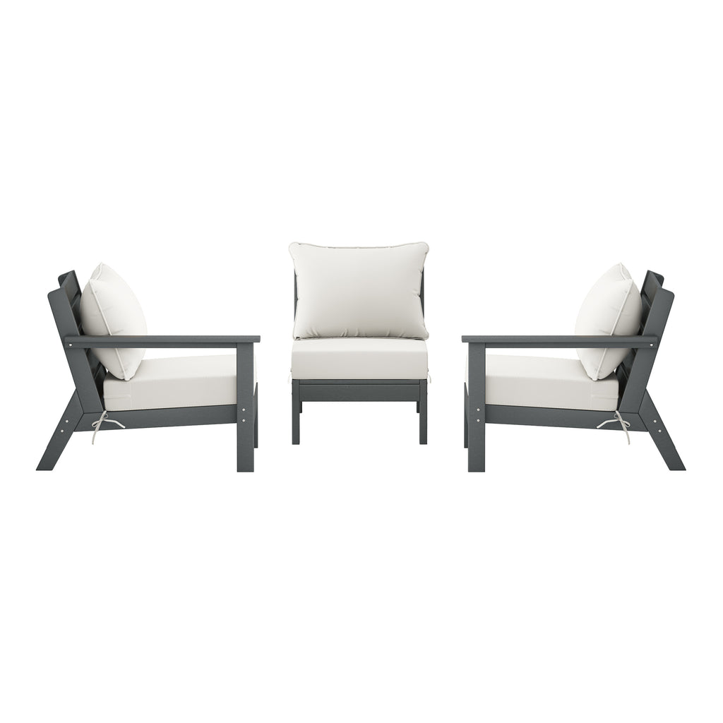 - Set Includes: one (1) deep seating left arm club chair, one (1) deep seating armless club chair, one (1) deep seating right arm club chair, and three (3) deep seating cushion sets