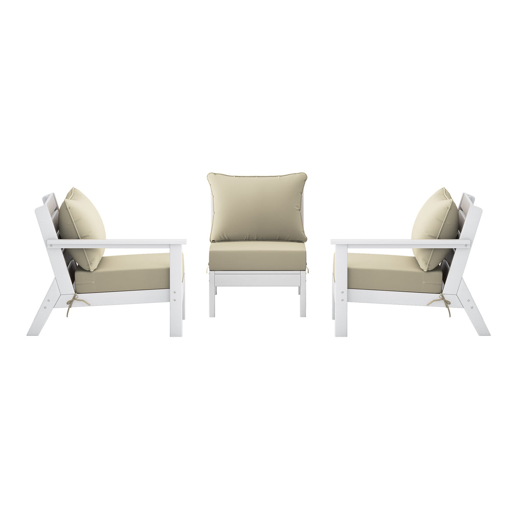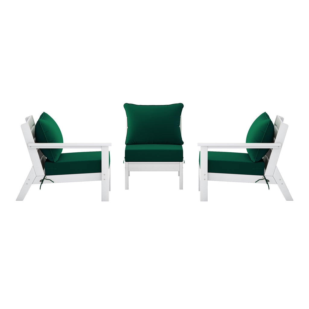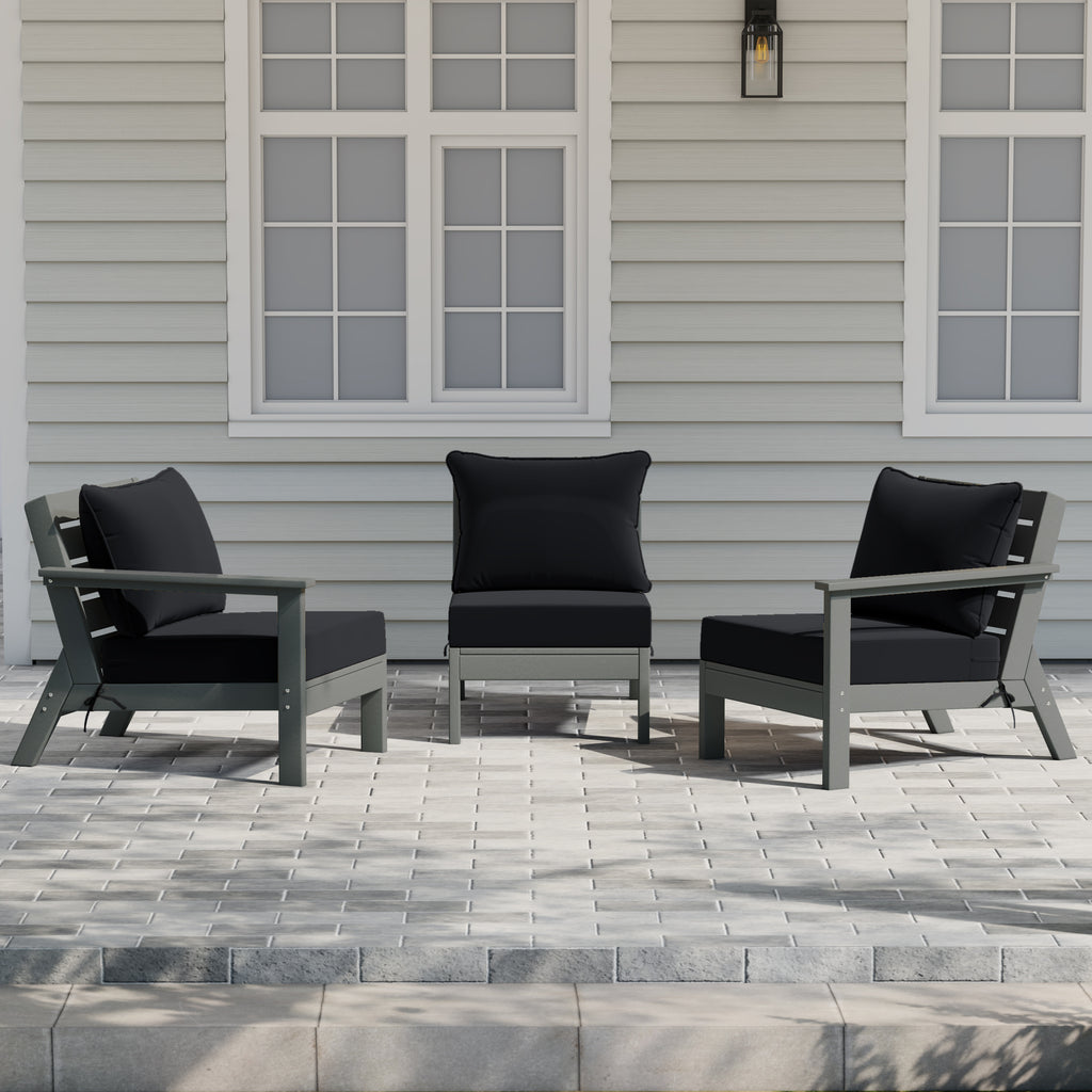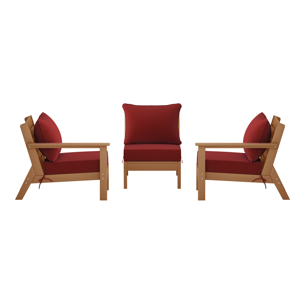 - Set Includes: one (1) deep seating left arm club chair, one (1) deep seating armless club chair, one (1) deep seating right arm club chair, and three (3) deep seating cushion sets