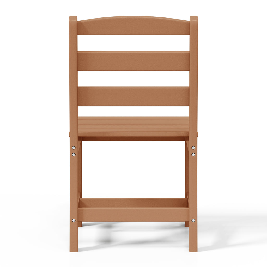 Gather around and make memories while sharing your favorite meals with this charming and long-lasting All-Weather Outdoor Patio Armless Dining Chair. Crafted from durable HDPE material, it is perfect for the outdoors with its UV resistance. The contoured seat provides relief to your lower half, offering a more ergonomic and comfortable seating experience. Make this the chair of choice for all your outdoor dining occasions and bring comfort and enjoyment to your gatherings with loved ones this season