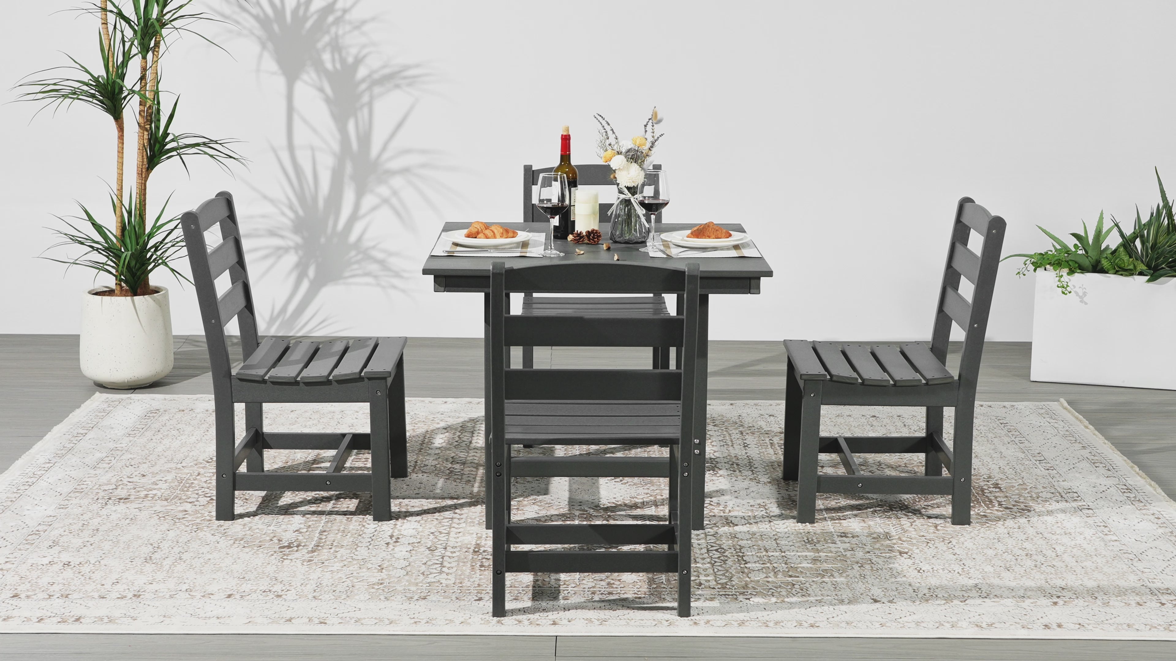 Create a warm and inviting outdoor dining area with our 5-piece HDPE dining set. Made with a durable all-weather HDPE material that is resilient against UV rays and fading, making it the ideal material for the outdoors. Designed for comfort, sturdiness, and functionality from the armless side chairs contoured seats and arched backrest to the durable HDPE-reinforced tabletop construction and the 1.9" built-in umbrella hole that is perfect for adding an umbrella and extra shade during those bright and sunny days.