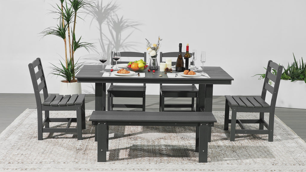 Create endless memories with your loved ones around this enchanting 6-piece dining set. Made with a durable, all-weather HDPE material that is resilient against UV rays and fading, making it the ideal material for the outdoors. Embrace sun-filled days with ease, thanks to a thoughtfully designed 1.9" umbrella hole—ideal for adding your favorite patio umbrella. Designed to be both charming and durable, the reinforced aluminum metal frame tabletop helps reduce warping. The bench also features a thick HDPE reinforced bottom with stainless steel plates running along the side skirts to help reduce warping. Comfortable contoured seats with arched backrests provide all-day comfort. Create endless memories with your family this season.