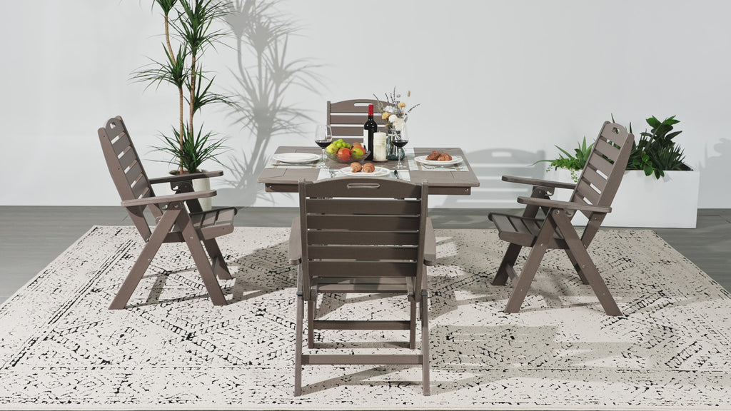 Savor every moment with our 5-Piece HDPE Adjustable High back Folding Patio Dining Table Set, designed for both style and comfort. Made with a durable, all-weather HDPE material that is resilient against UV rays and fading, making it the ideal material for the outdoors. Embrace sun-filled days with ease, thanks to a thoughtfully designed 1.9" umbrella hole—ideal for adding your favorite patio umbrella. After your meal, unwind with the adjustable backrest, offering four reclining positions for personalized relaxation. When the evening is over, effortlessly fold the chair for convenient storage, keeping your space neat and tidy. durability and stability in mind with tables trestle leg design to ensure added stability, durability and helps reduce wobbling.