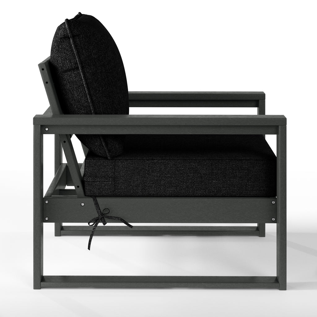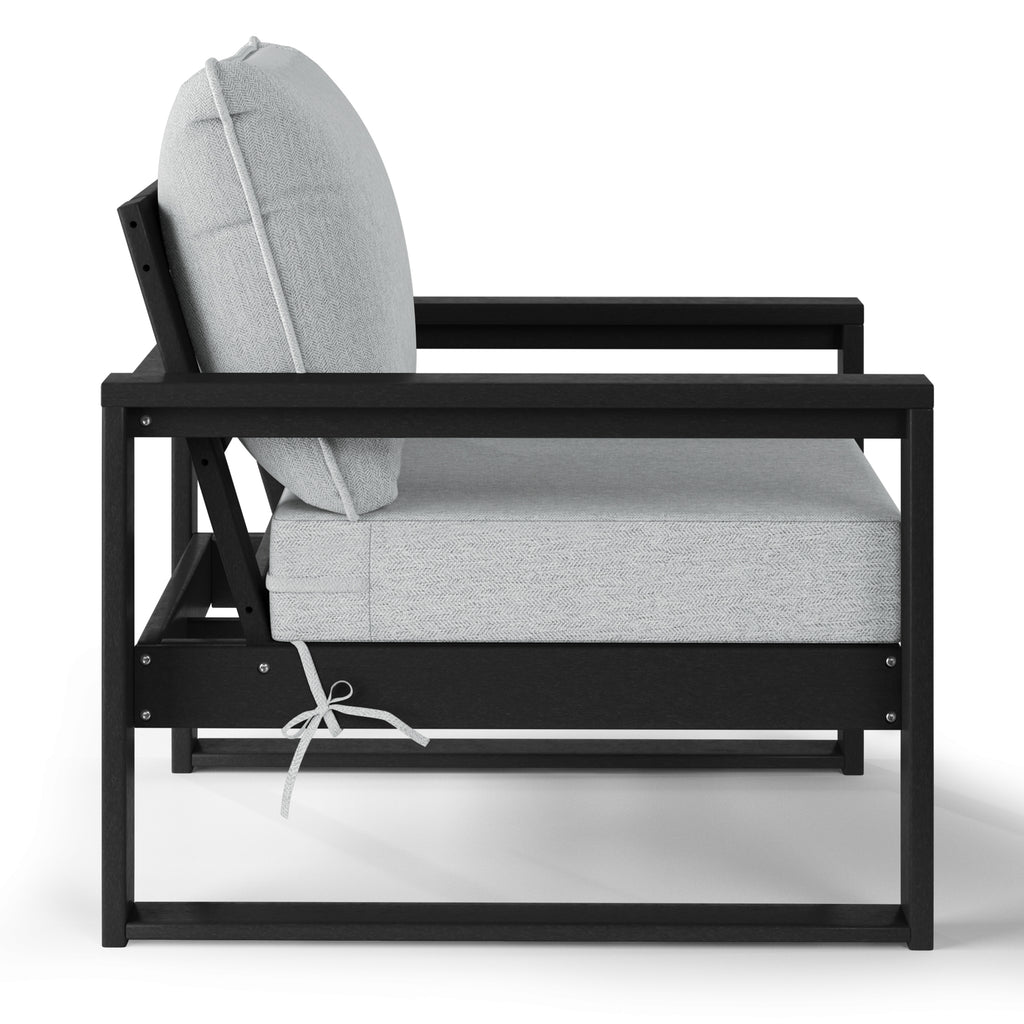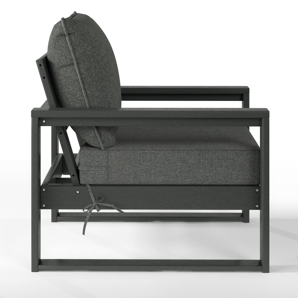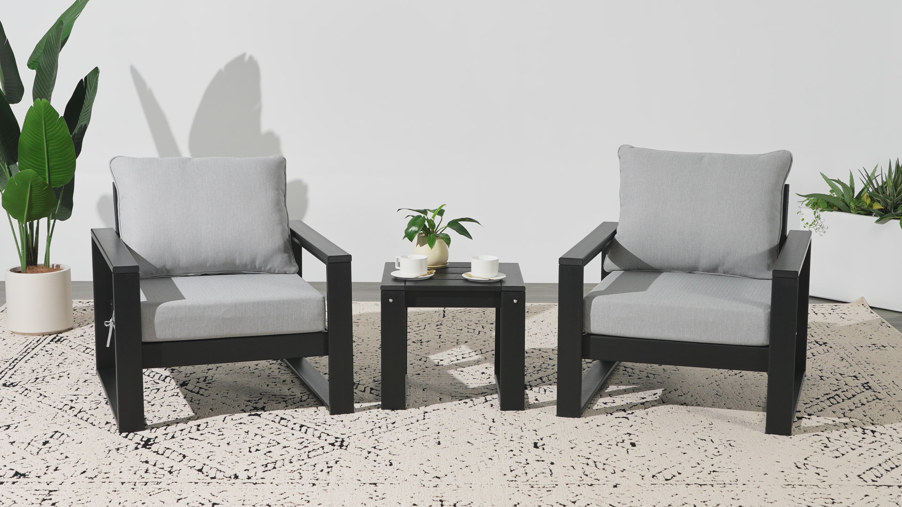 Relax by the poolside or on your patio under the stars with our charming 3-Piece Outdoor Patio Conversation Set. Lounge back in bliss with the deep, inclined seat rest and the slanted backrest, which offer a relaxing design. Plush, soft, yet firm cushions are filled with high-resilience foam, making them the perfect blend of comfort and durability. The olefin cushion covers are removable and machine-washable, and are also water-repellant and UV and fade-resistant, perfect for the outdoors. Our outdoor club armchair and side table is a perfect blend of comfort and design, featuring durable and thick HDPE material with a U-shaped leg design that ensures stability. Turn your backyard into an oasis with this patio sofa chair this season.