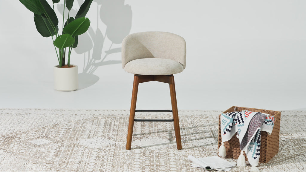 Elevate your kitchen counter with the distinctive silhouette of our Set of Two Chenille 26" Counter High Bar Stools. Featuring a smooth 360° swivel for effortless conversation and movement, these stools are crafted with elegant light walnut-finished rubberwood legs and plush chenille upholstery for a luxurious feel. Designed for both style and enduring quality, their generously padded seats, supported by robust plywood construction, ensure exceptional comfort for everyday use. Enjoy effortless conversation and a full range of motion with the smooth 360° swivel. Sleek matte black metal footrests add a touch of modern refinement and easy upkeep. Adjustable foot levelers on each stool provide stability on any surface and protect your flooring