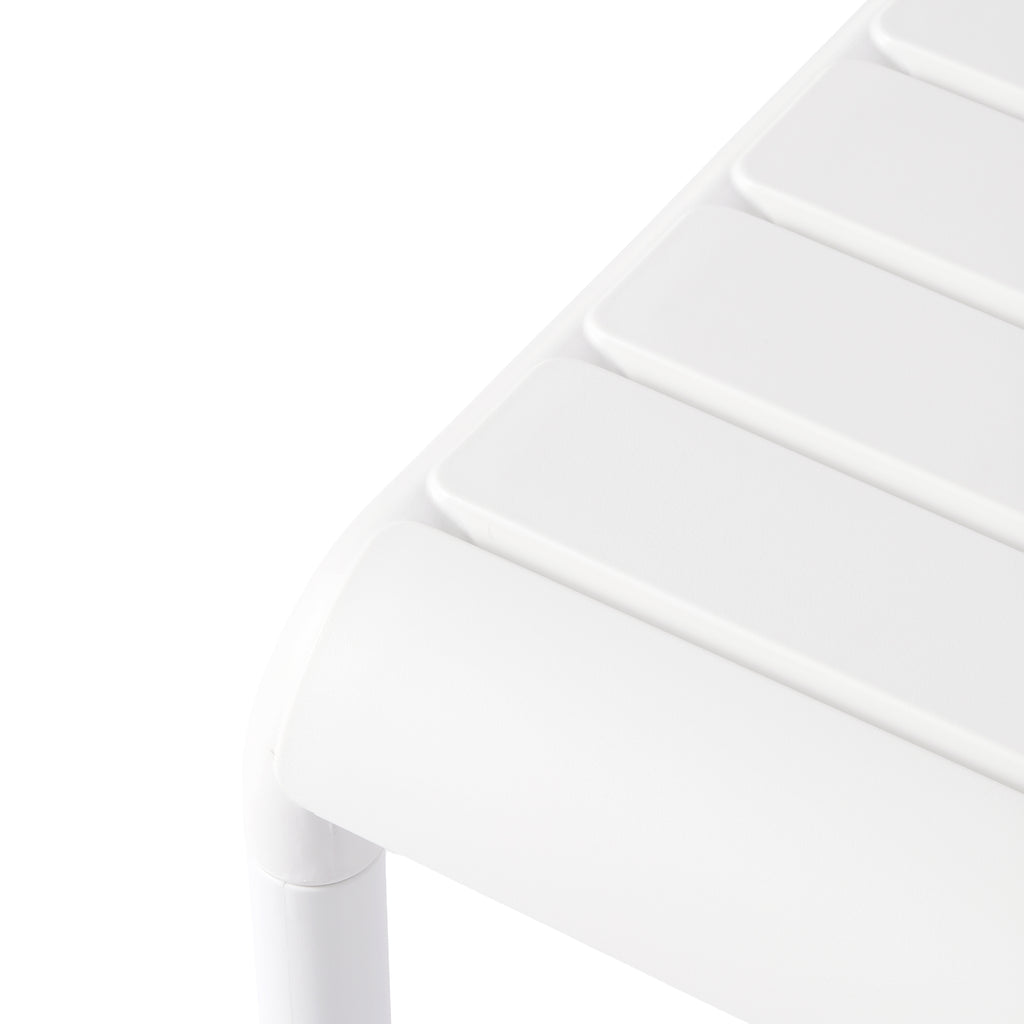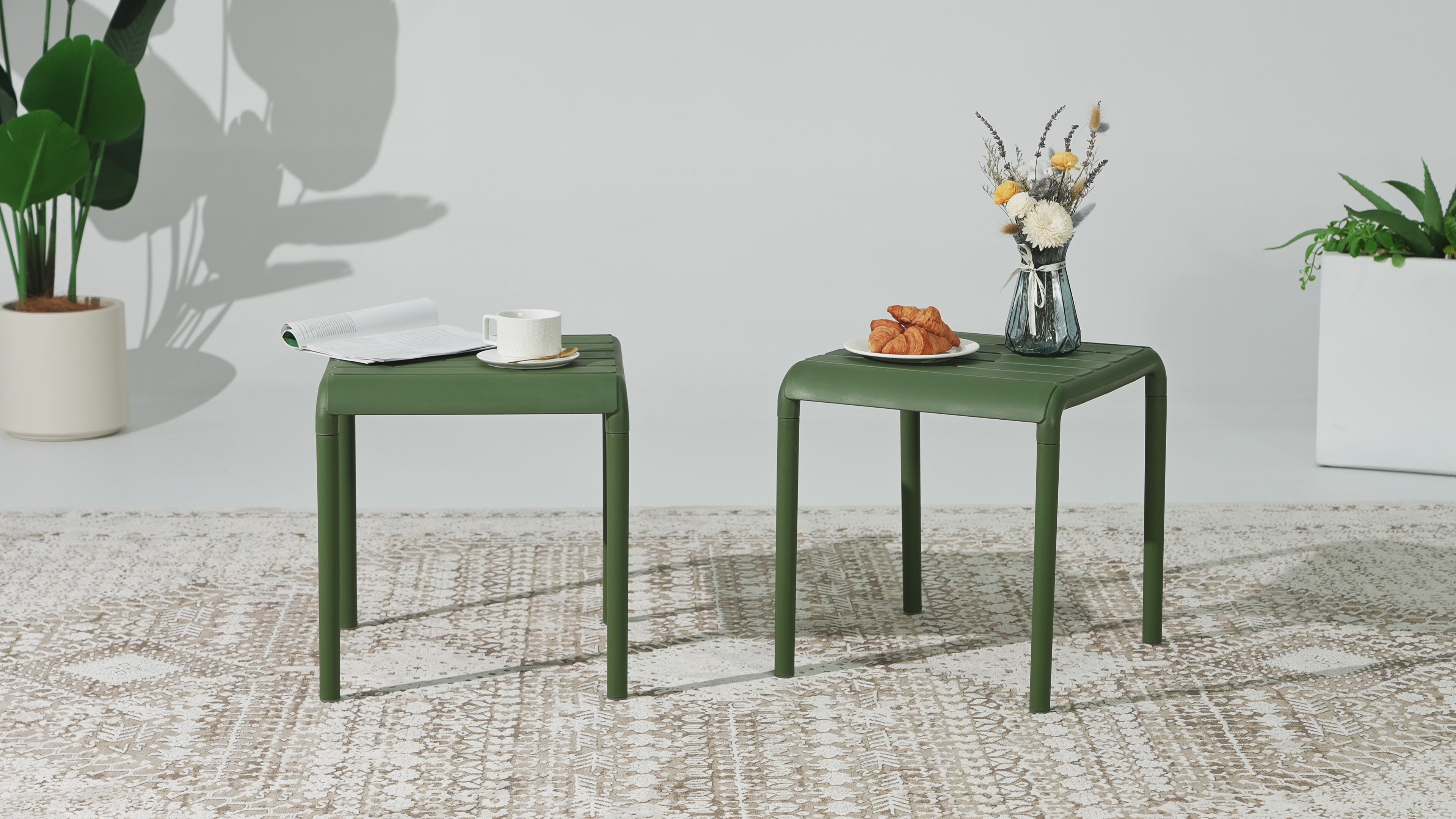 Elevate your outdoor space with our set of two versatile side tables. Their clean, square silhouette, softened by rounded edges, effortlessly complements any patio arrangement. Perfect for resting a cool drink on a sun-drenched afternoon or showcasing a favorite potted plant, these tables offer understated functionality. Crafted from durable, UV-resistant polypropylene resin, they require minimal upkeep, while the slatted tabletop ensures proper drainage. And when the season shifts, the legs disassemble easily for compact storage, keeping your space streamlined.