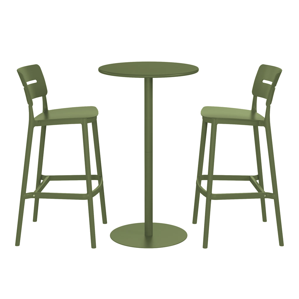 Curate a chic and versatile outdoor entertaining space with our 3-piece bistro bar table set. This set pairs a sleek, round table with two minimalist patio bar stools, crafted for both style and function. The 41.5" adjustable bar table features a durable, powder-coated metal frame, making it scratch-, fade-, and rust-resistant for a lasting finish. Its wide, stable base provides confident support, while the innovative adjustable height allows it to transition effortlessly from a bar-height table for lively gatherings to a charming side table for intimate moments. The complementary patio bar stools are designed for clean lines and easy living. Made from a low-maintenance, UV-resistant polypropylene resin, they are a lightweight and portable option for extra seating wherever you need it. The integrated footrest provides comfortable support, and the smart, stackable design allows for effortless storage when the season ends.
