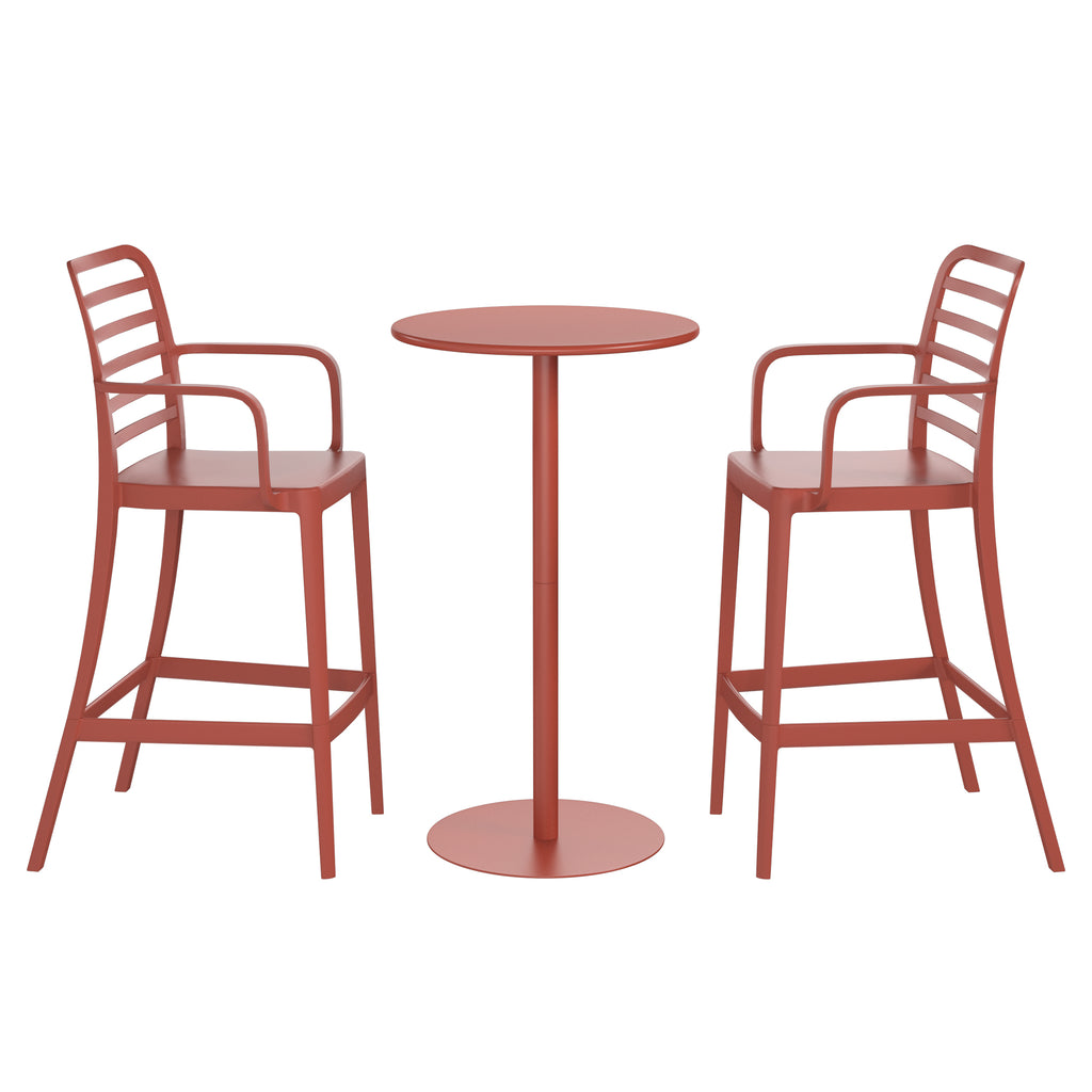 The table features a durable, powder-coated metal frame that resists rust, scratches, and fading for a timeless finish. Its wide, 18.75" stable base provides confident support, while the innovative adjustable height allows it to transition effortlessly from a vibrant bar table to a charming side table. The complementary bar stools are crafted from a low-maintenance, all-weather polypropylene resin that stands up to the elements. They feature a ventilated backrest for comfort and a convenient footrest. For a clean, minimalist look and easy storage, the base of the stools is removable, allowing them to transition to a standard dining height that perfectly complements the table when it's converted to a side table.