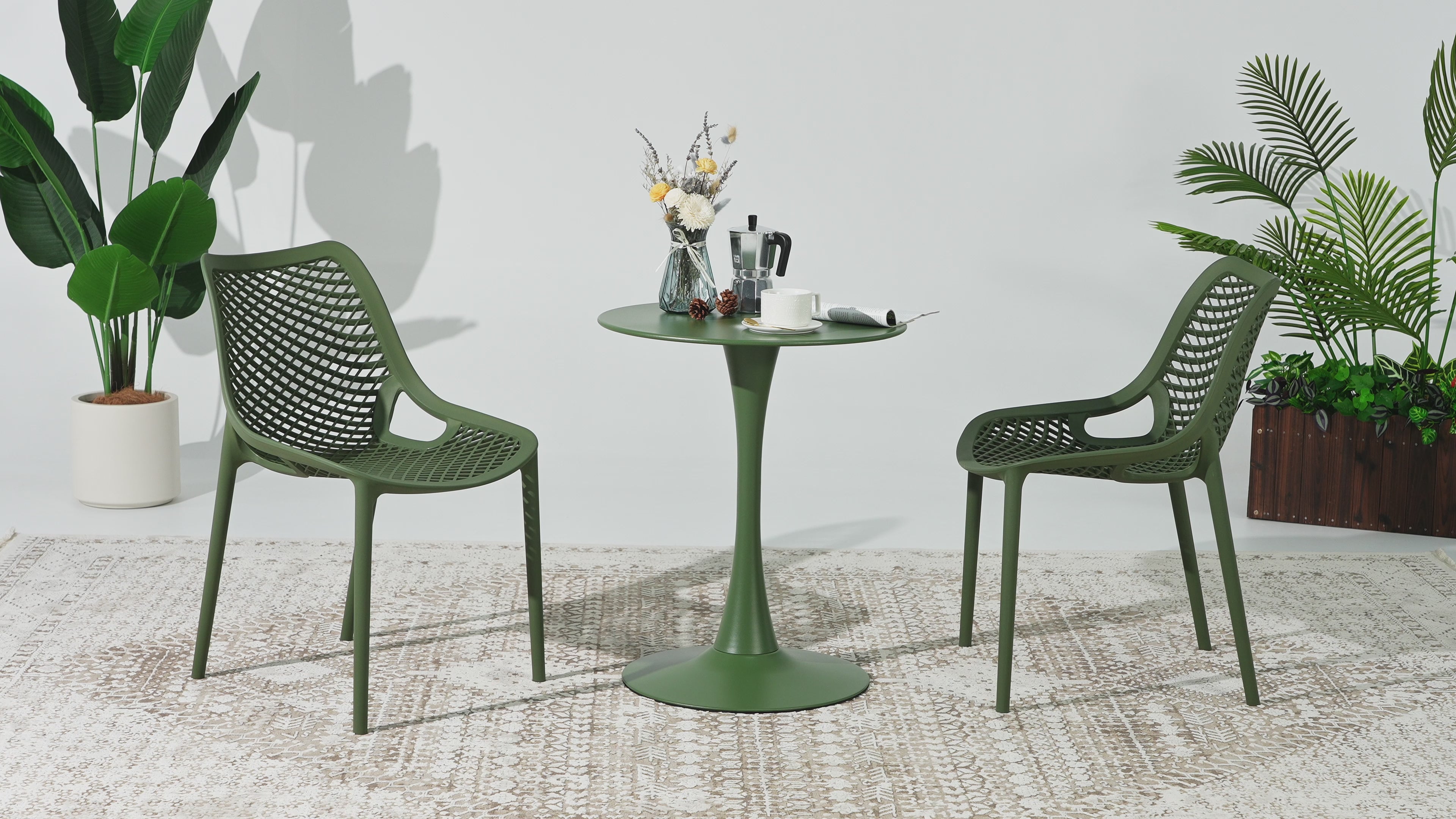 Elevate your outdoor gatherings with this two person round dining table set. The round dining table, crafted from a durable metal with a rust-resistant e-coating, offers a modern foundation for al fresco dining. Complementing the table are two stackable patio chairs, designed for space-conscious living. Made from UV-resistant polypropylene resin, these lightweight chairs allow for effortless rearrangement, adapting to your evolving patio aesthetic. The diamond mesh design ensures both comfort and practicality by promoting airflow through the mesh design and preventing water from puddling on the seat by allowing water to drain through the seat and promotes faster drying. Enjoy instant gratification with the fully assembled chairs, while the table's simple assembly for quick setup, making it the perfect centerpiece for your outdoor retreat ensuring this 2 person patio table and chair set is the perfect set for your patio this season.